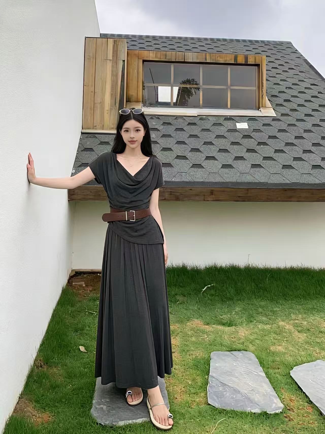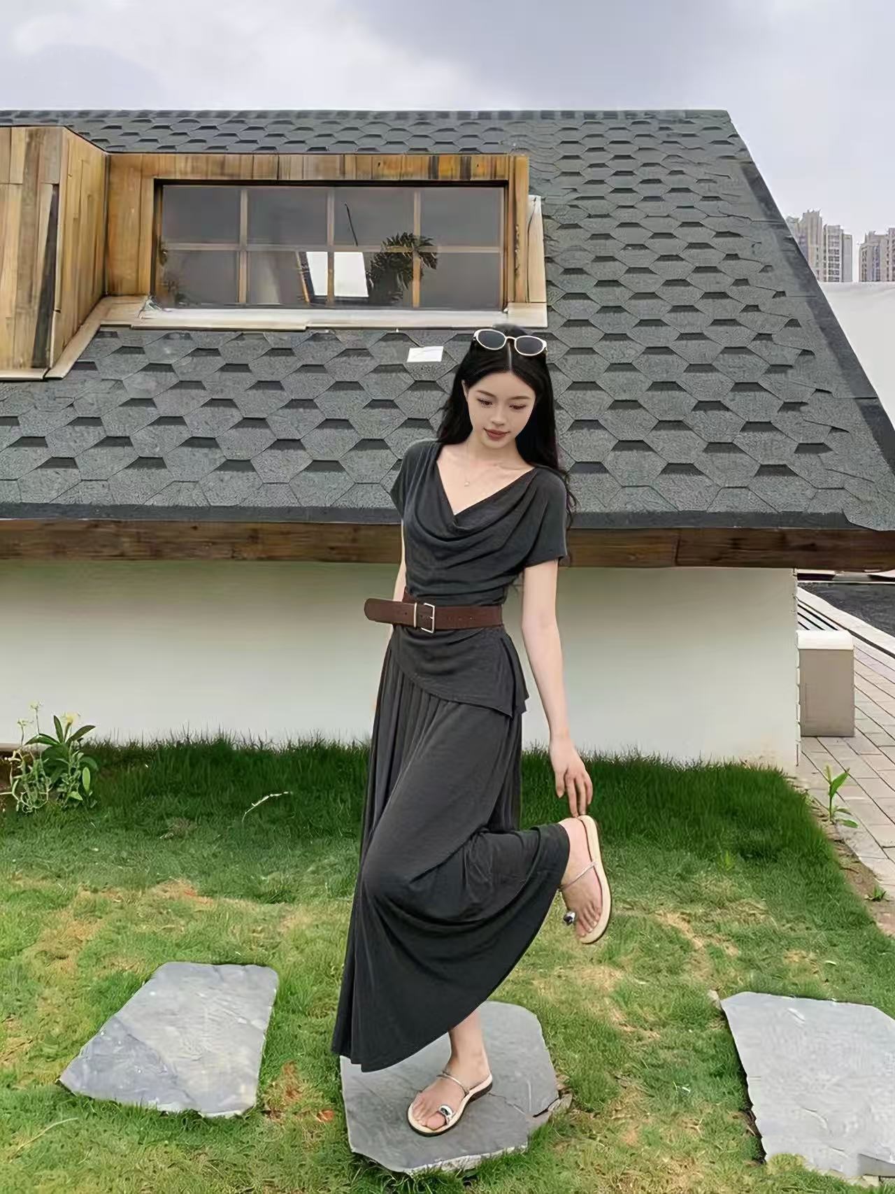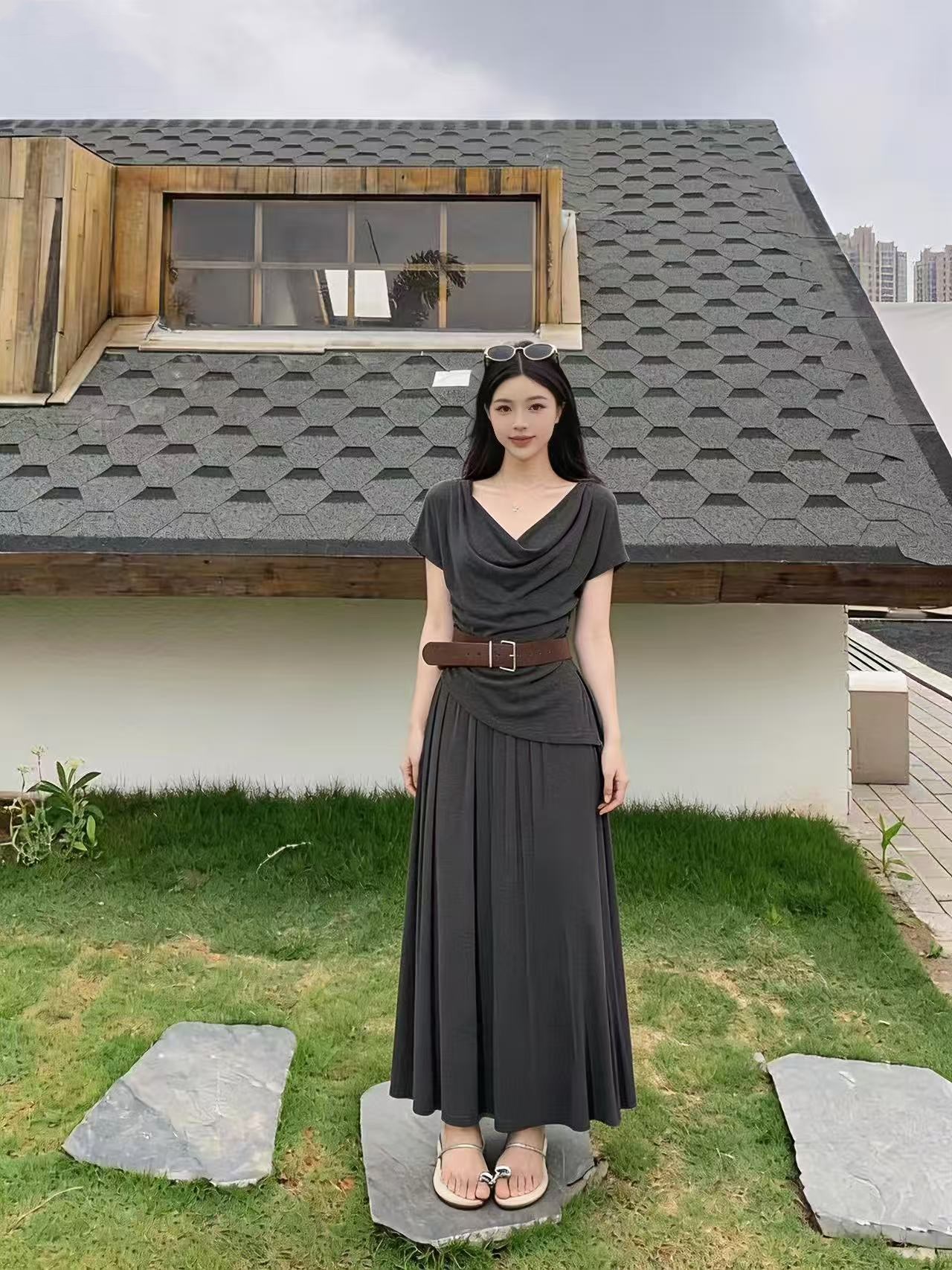 흔들다 칼라 불규칙 맨위 반신 스커트 두 조각 여성 세트 2026 여름 새로운 빅 사이즈 슬림해 보이는 도루 센스 세트 드레스