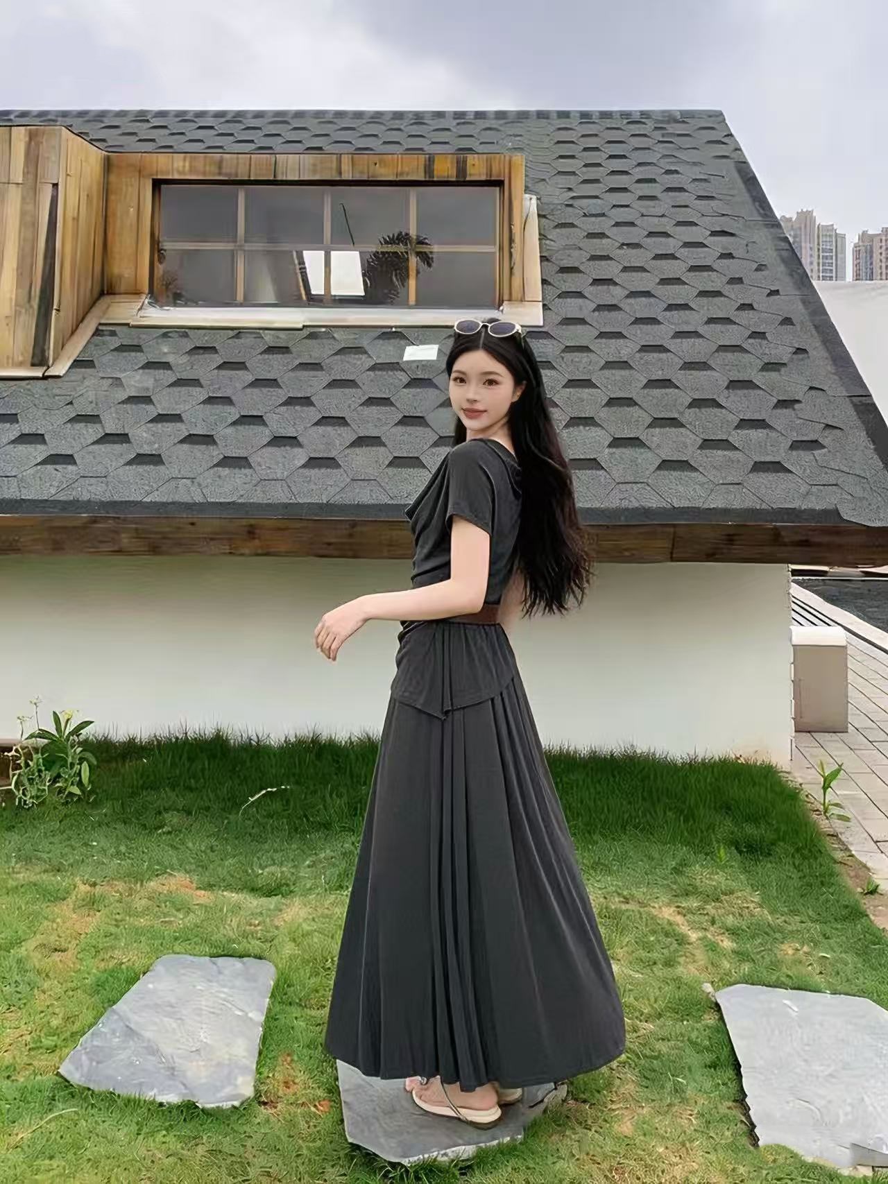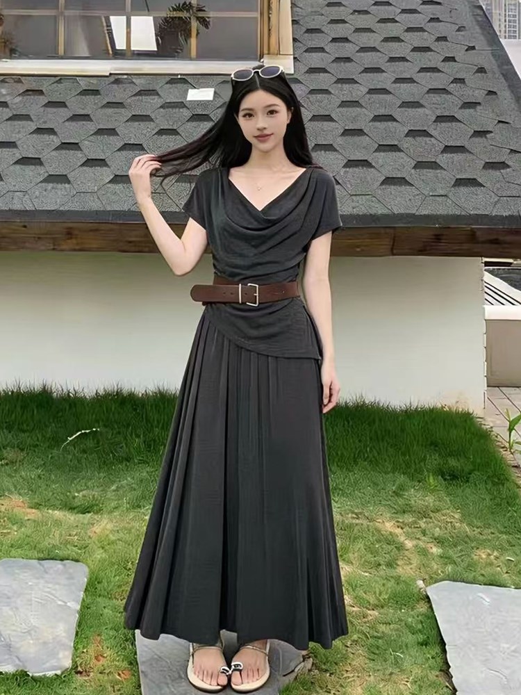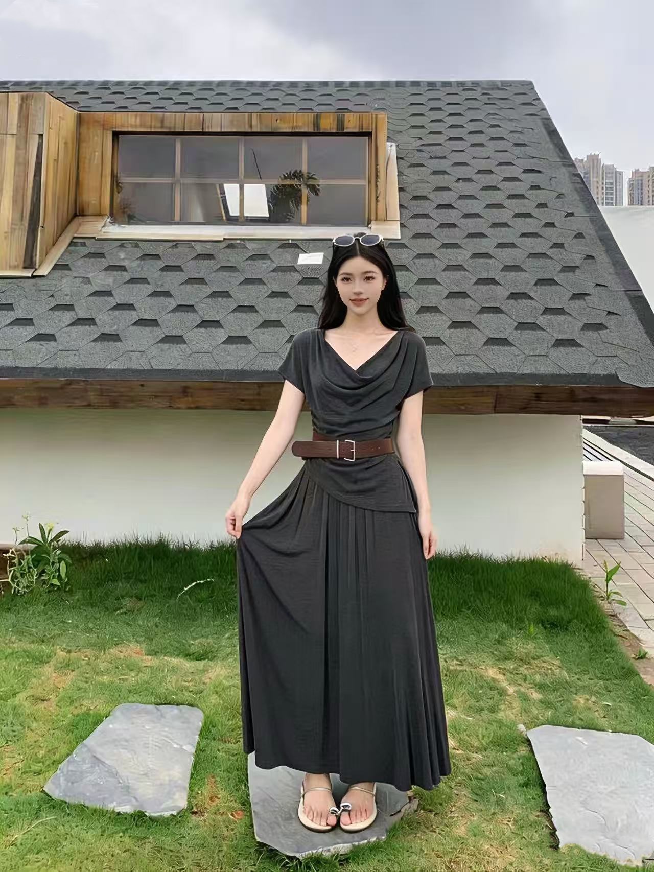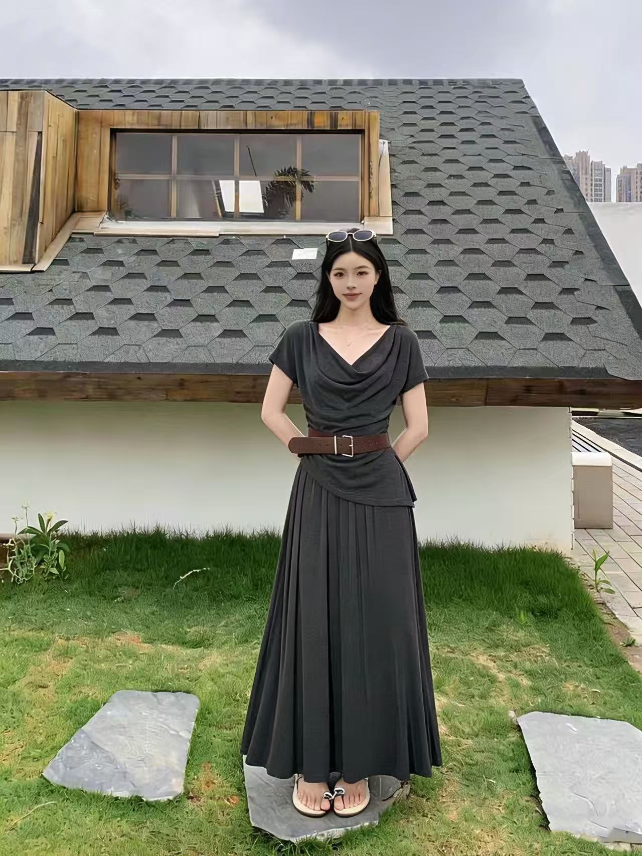 흔들다 칼라 불규칙 맨위 반신 스커트 두 조각 여성 세트 2026 여름 새로운 빅 사이즈 슬림해 보이는 도루 센스 세트 드레스