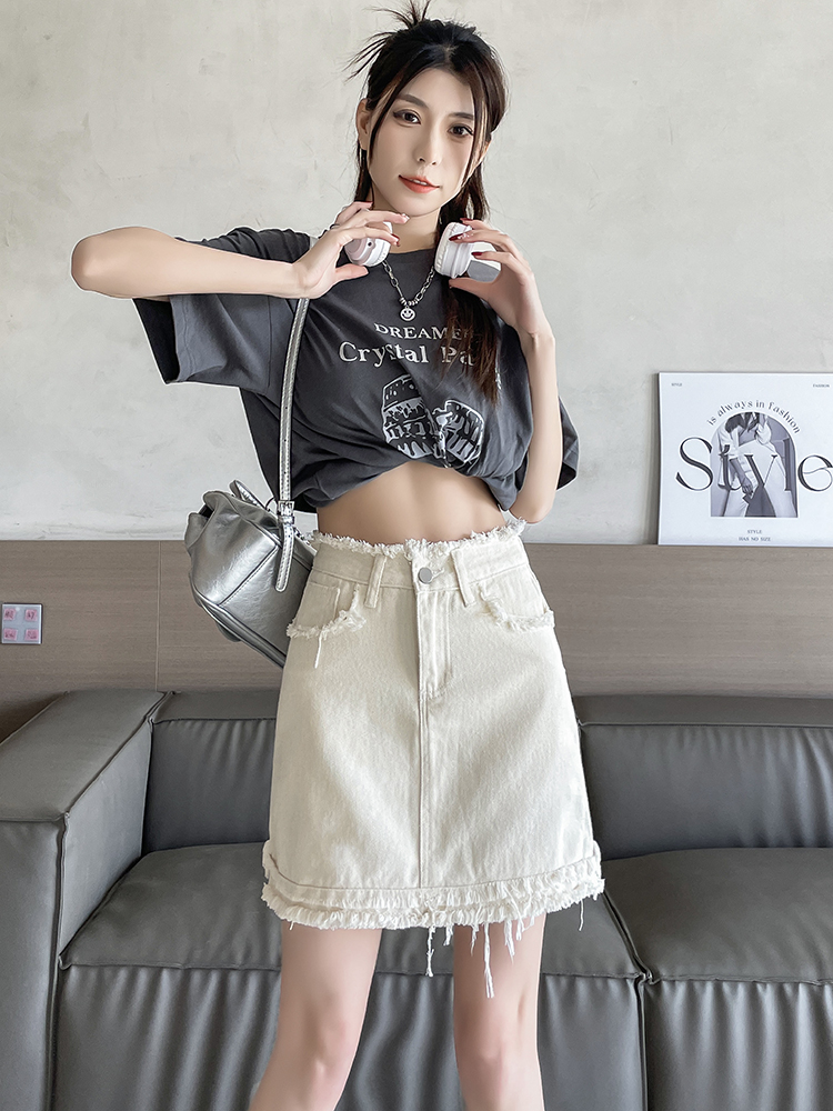 실사 베이지 색 거친 가장자리 데님 반신 스커트 여성 여름 얇은 스타일 하이웨이스트 슬림해 보이는 디자인 센스 한 마디 짧은 치마