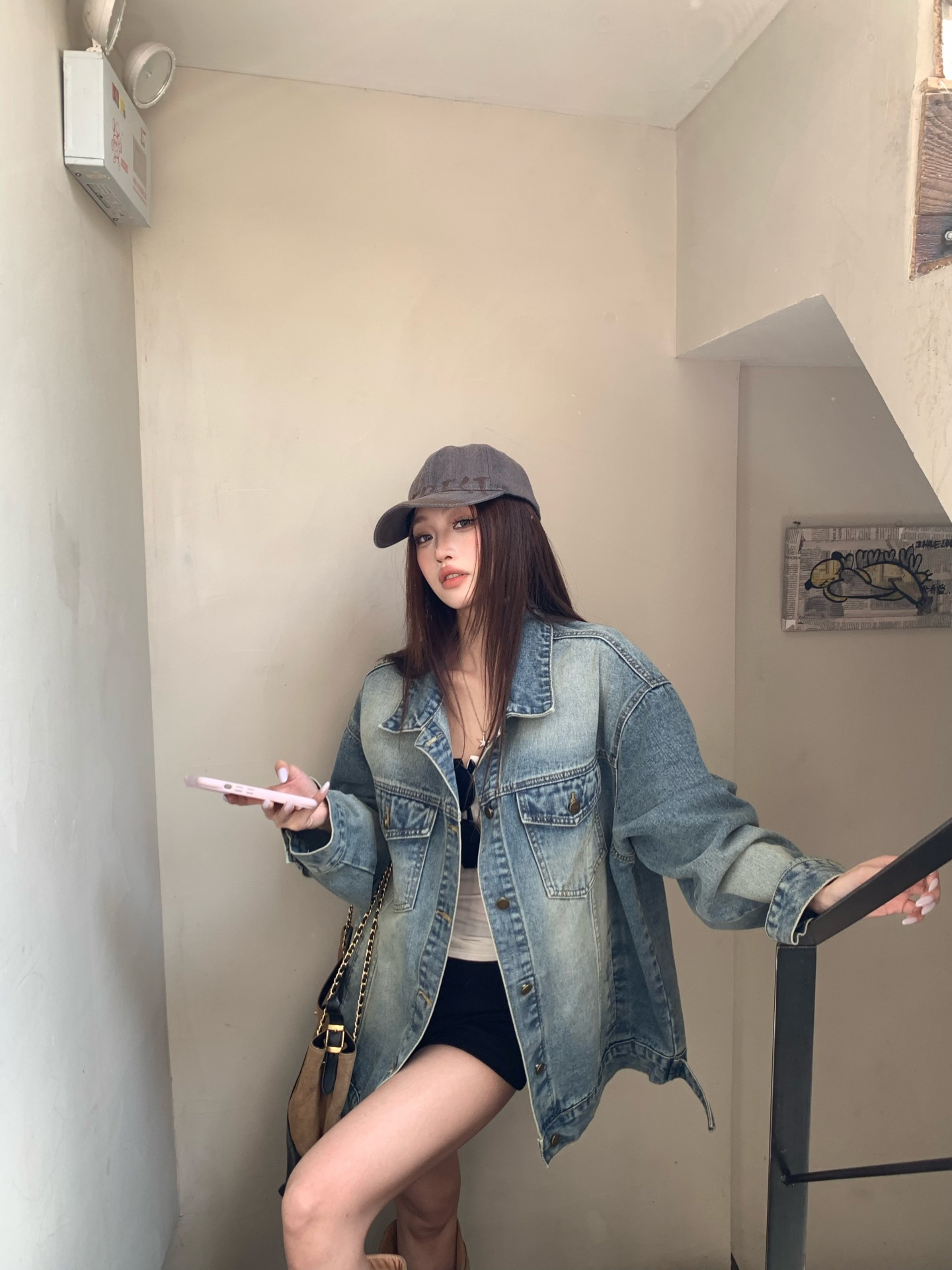아메리칸 레트로 해체 질감 데님 재킷 루즈핏 프로필 모양 몸매 가꾸기 슬림해 보이는 워크웨어 재킷 여성