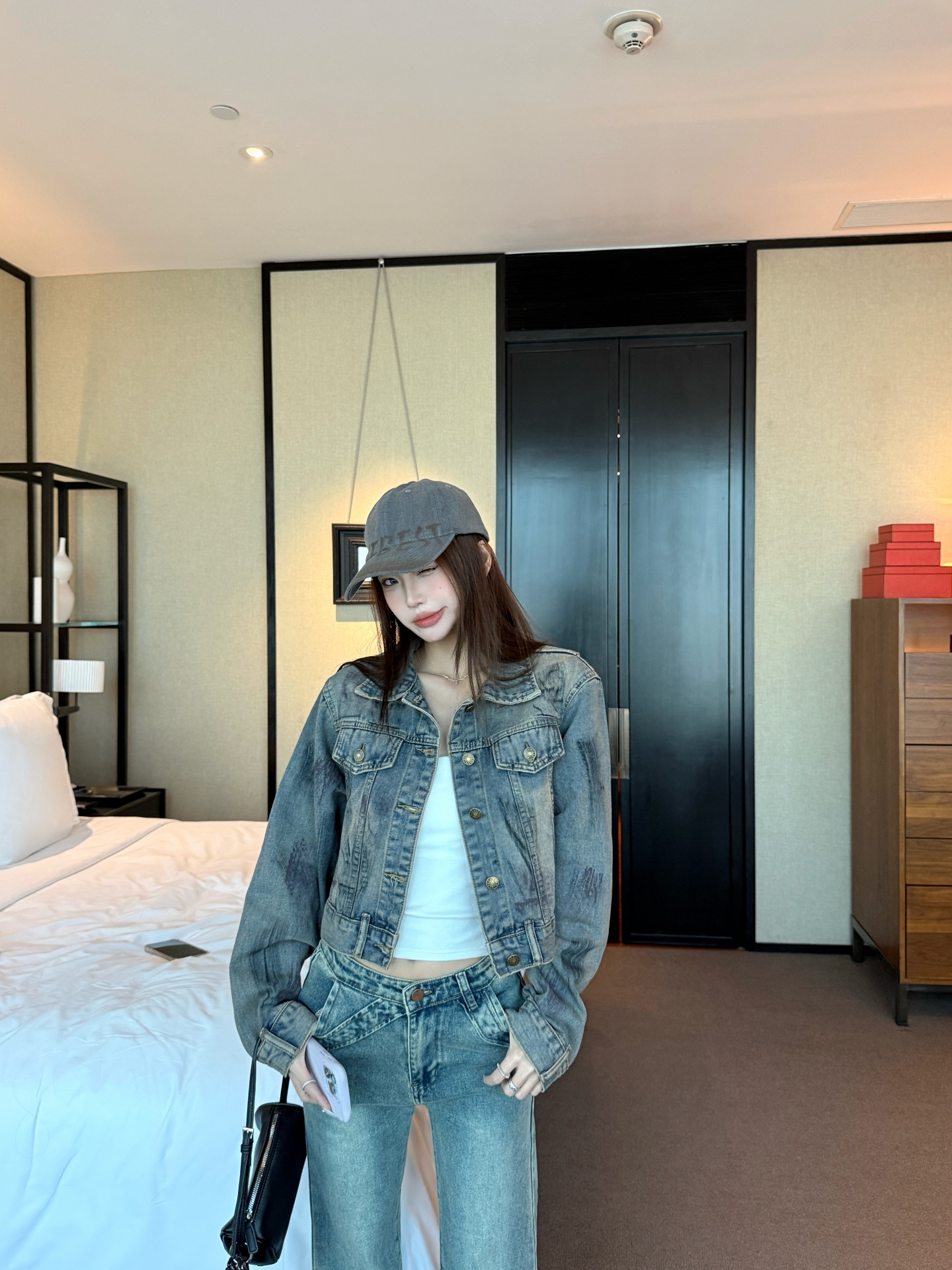 실사 핫걸 苾 입력 튀김 소금 워싱 블루 쇼트 스타일 데님 재킷