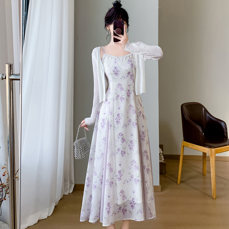 2026 섹션 프랑스식 고급 센스 작은 키 쉬폰 롱 스커트 보라색 꽃무늬 슬립 드레스 투피스 슈트 여성 여름