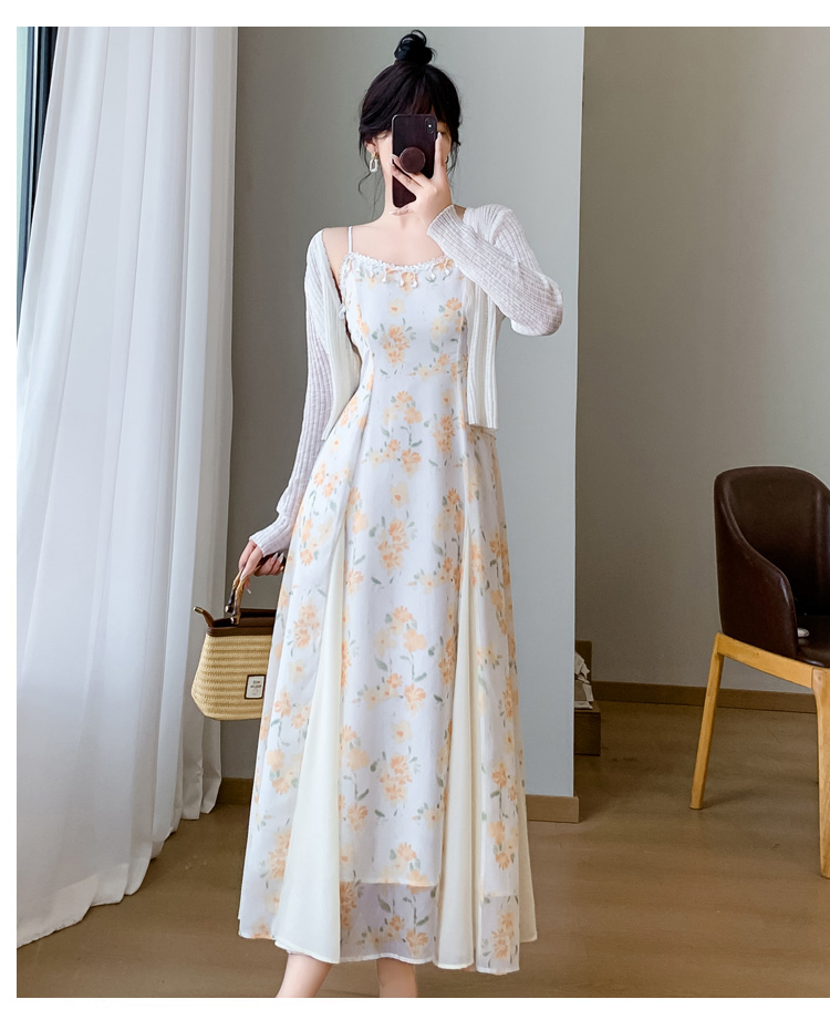 2026 새로운 프랑스식 고급 센스 작은 키 쉬폰 롱 스커트 꽃무늬 슬립 드레스 투피스 슈트 여성 여름