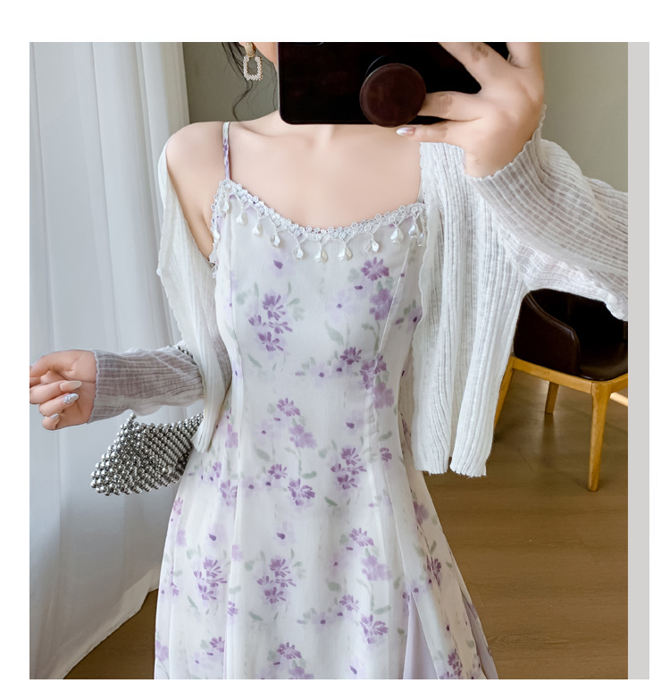 실사 여름 새로운 프랑스식 품격 보라색 꽃무늬 프릴 여성 드레스 오픈 가디건 슬립 드레스 투피스 세트