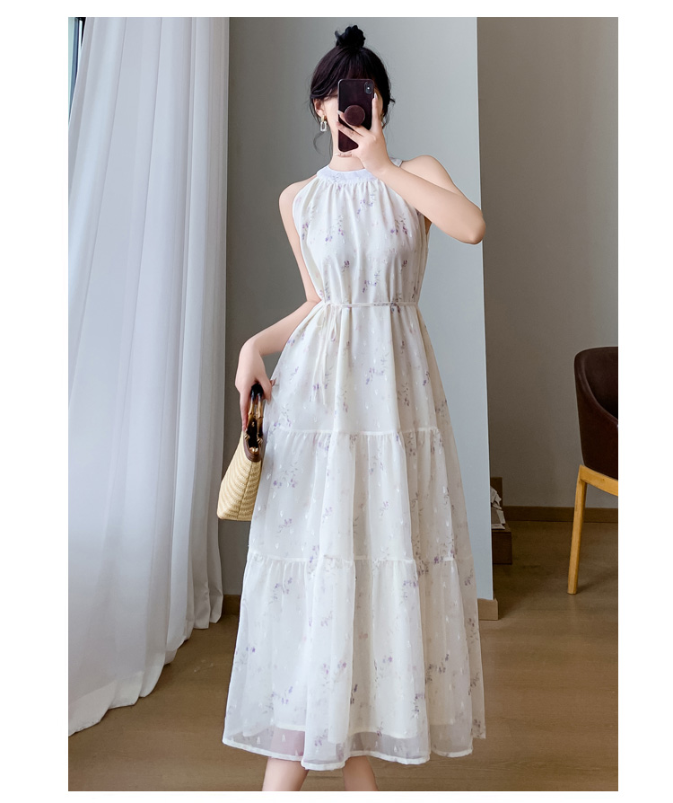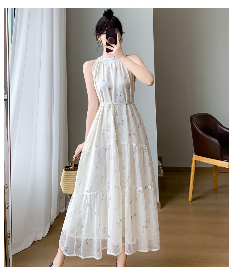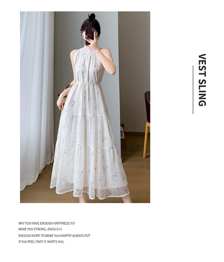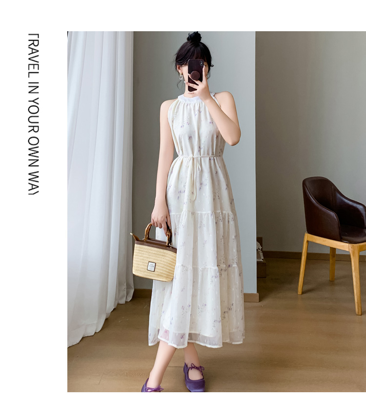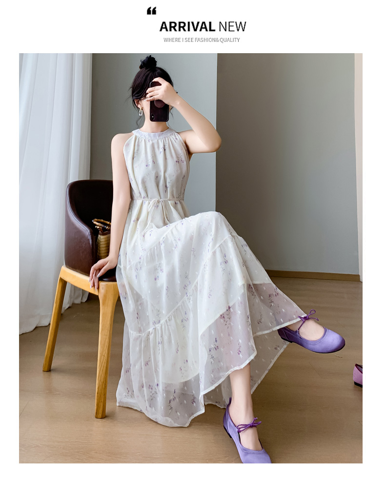 2026 섹션 고급 센스 작은 키 아름다운 꼬집기 허리 롱 스커트 보라색 꽃무늬 슬립 드레스 투피스 슈트 여성 여름