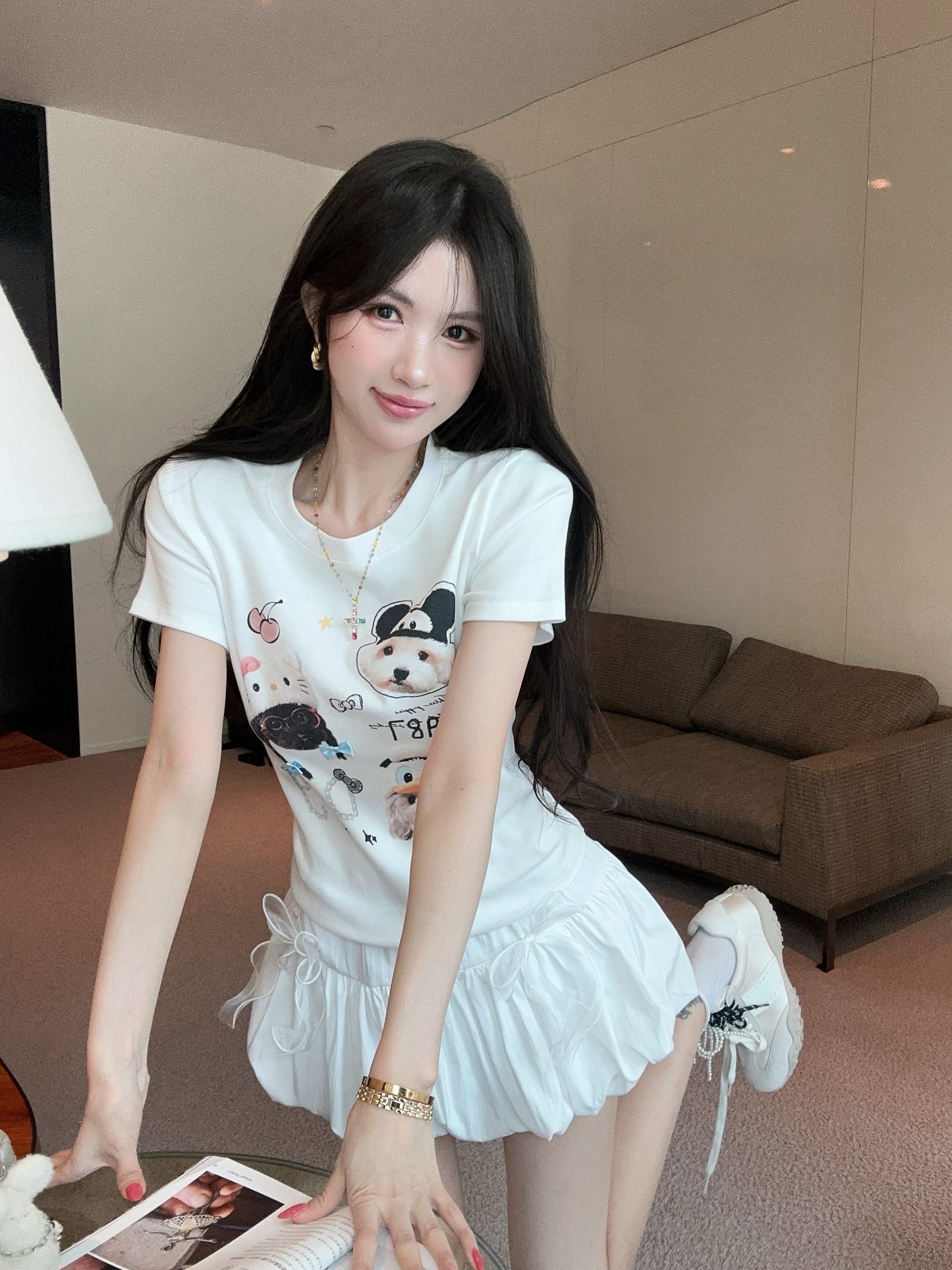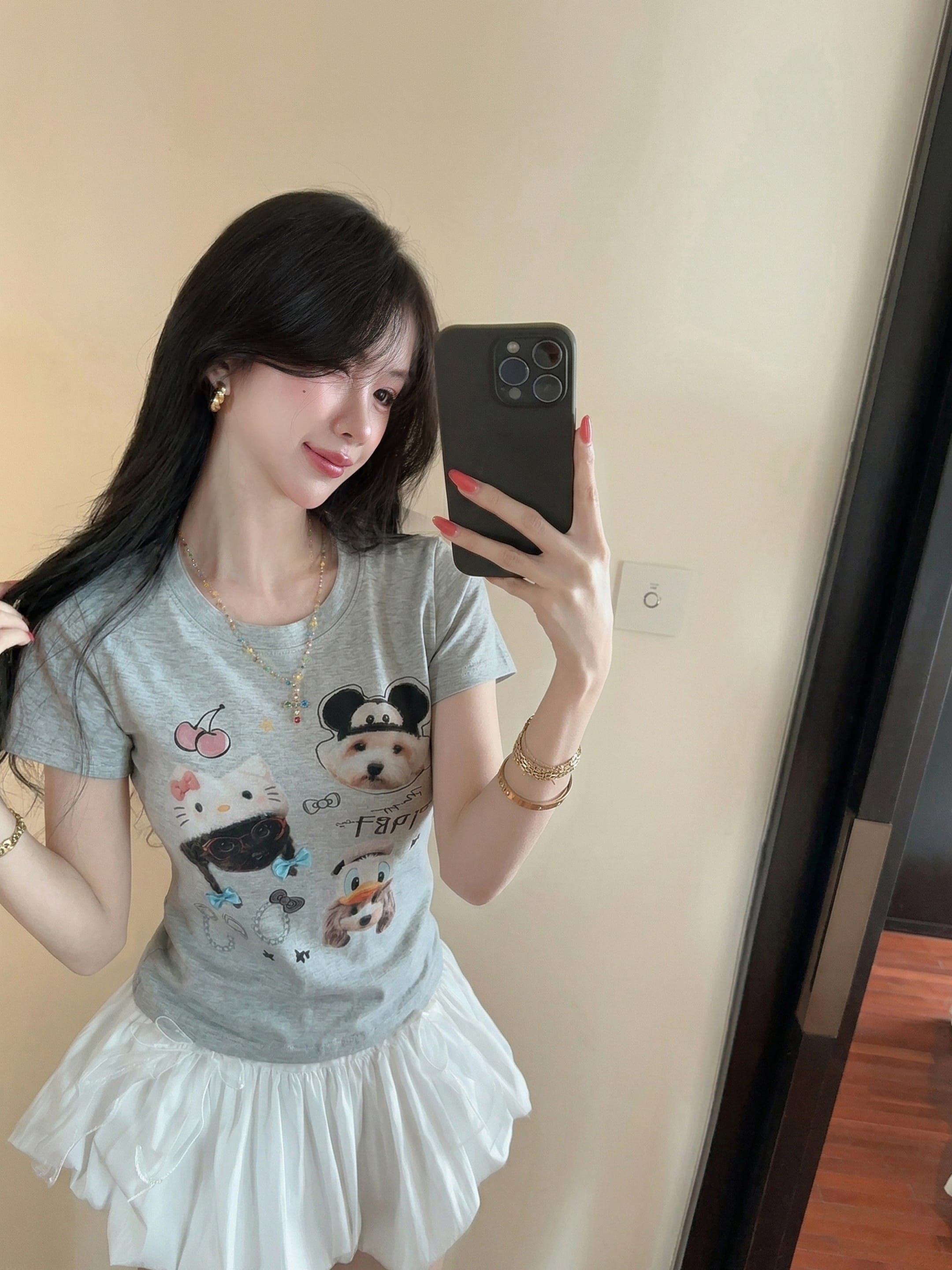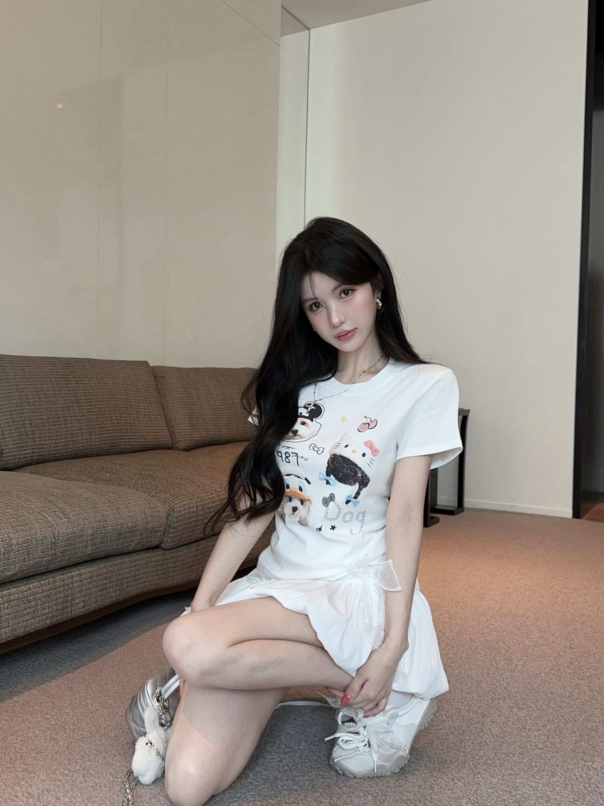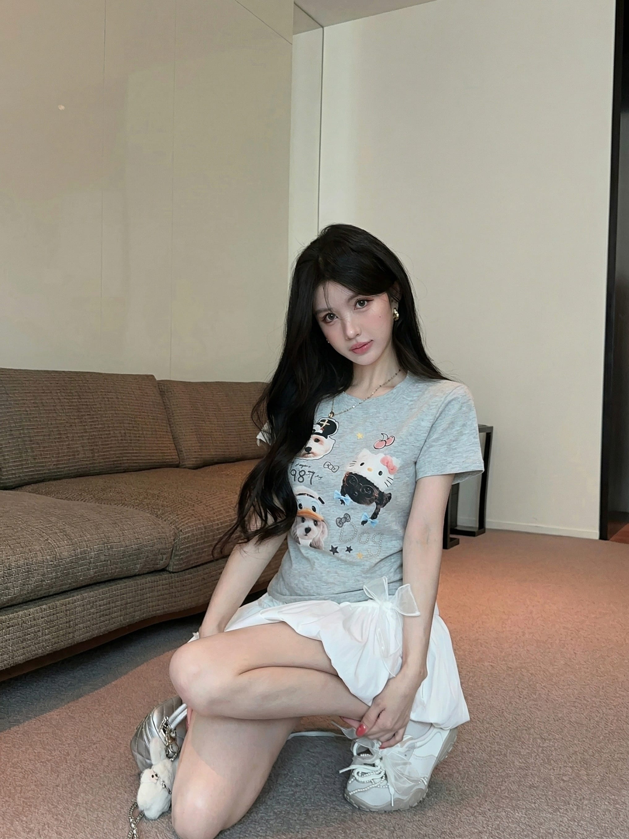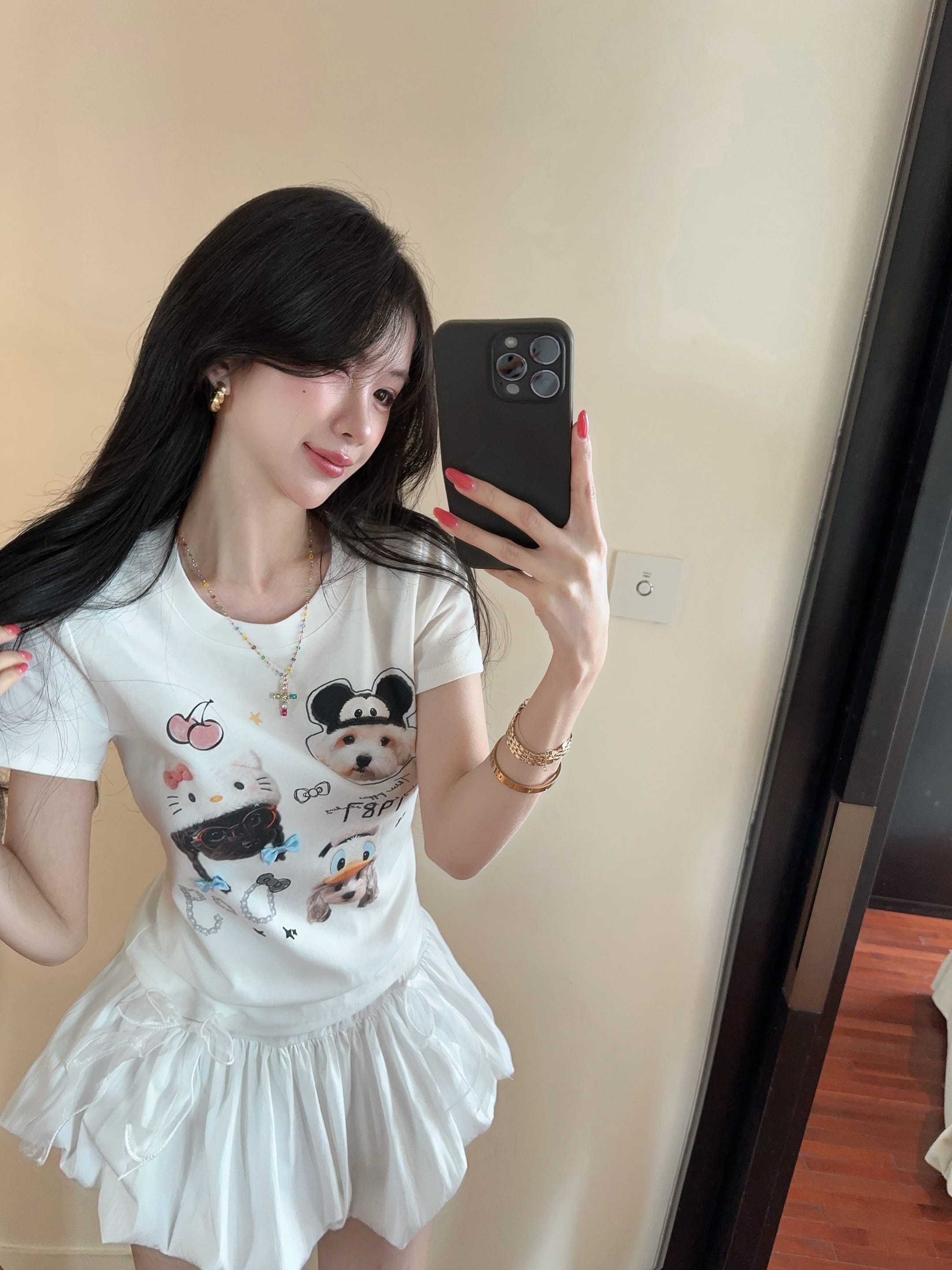 실사 정가 디자인 센스 비스듬한 어깨 슬립 반팔 티셔츠 아름다움 프린트 루즈핏 슬림해 보이는 맨위