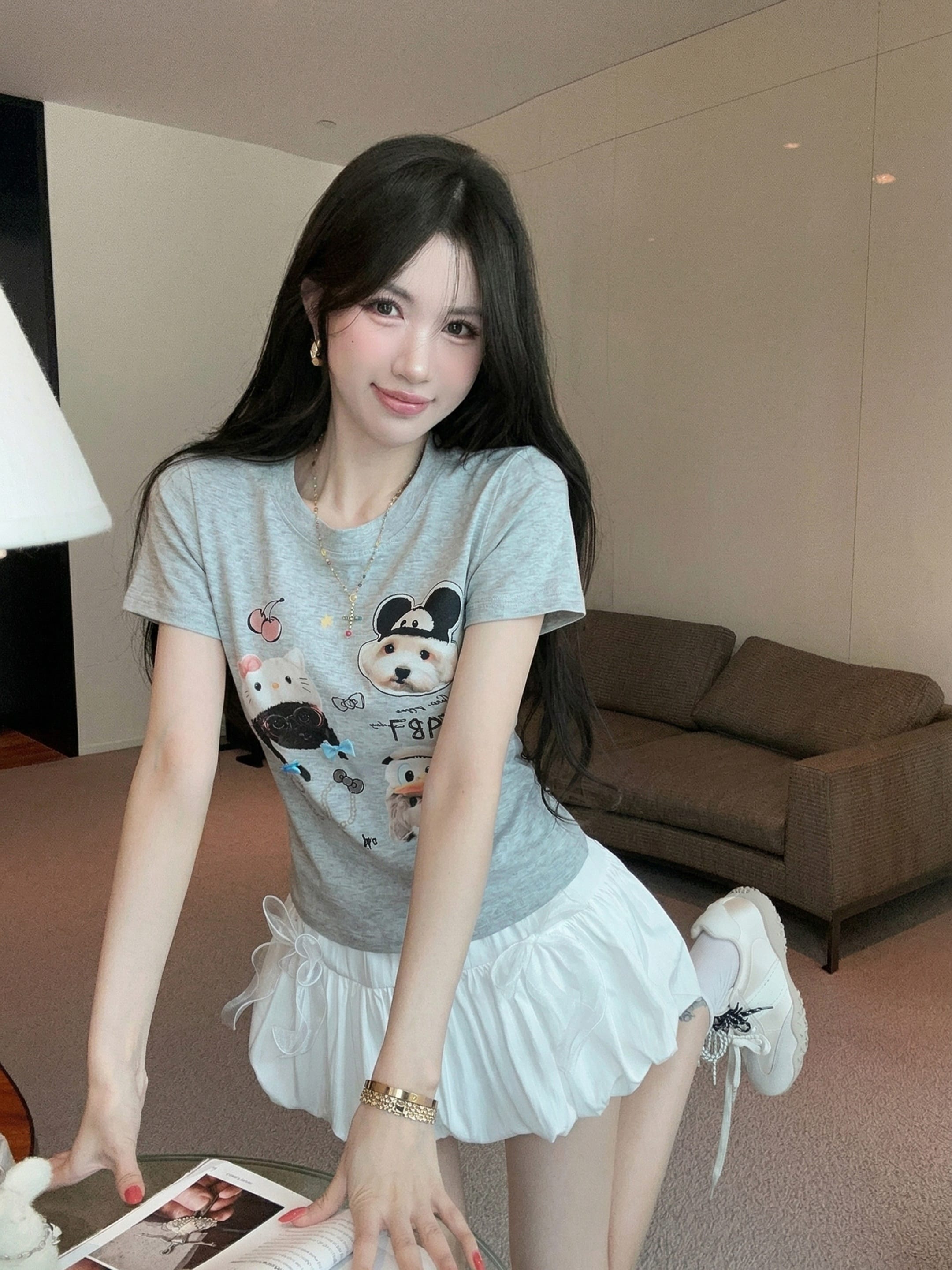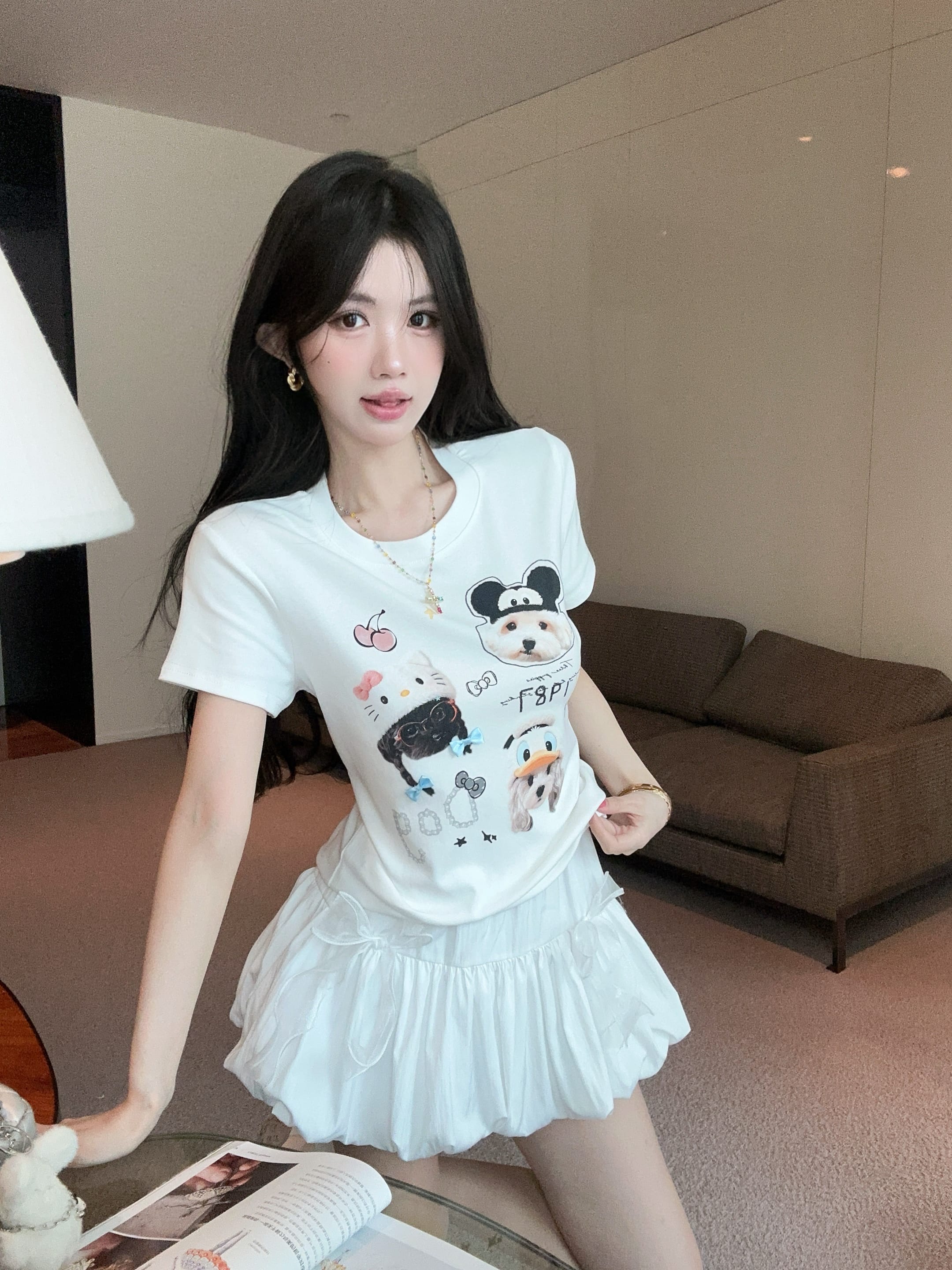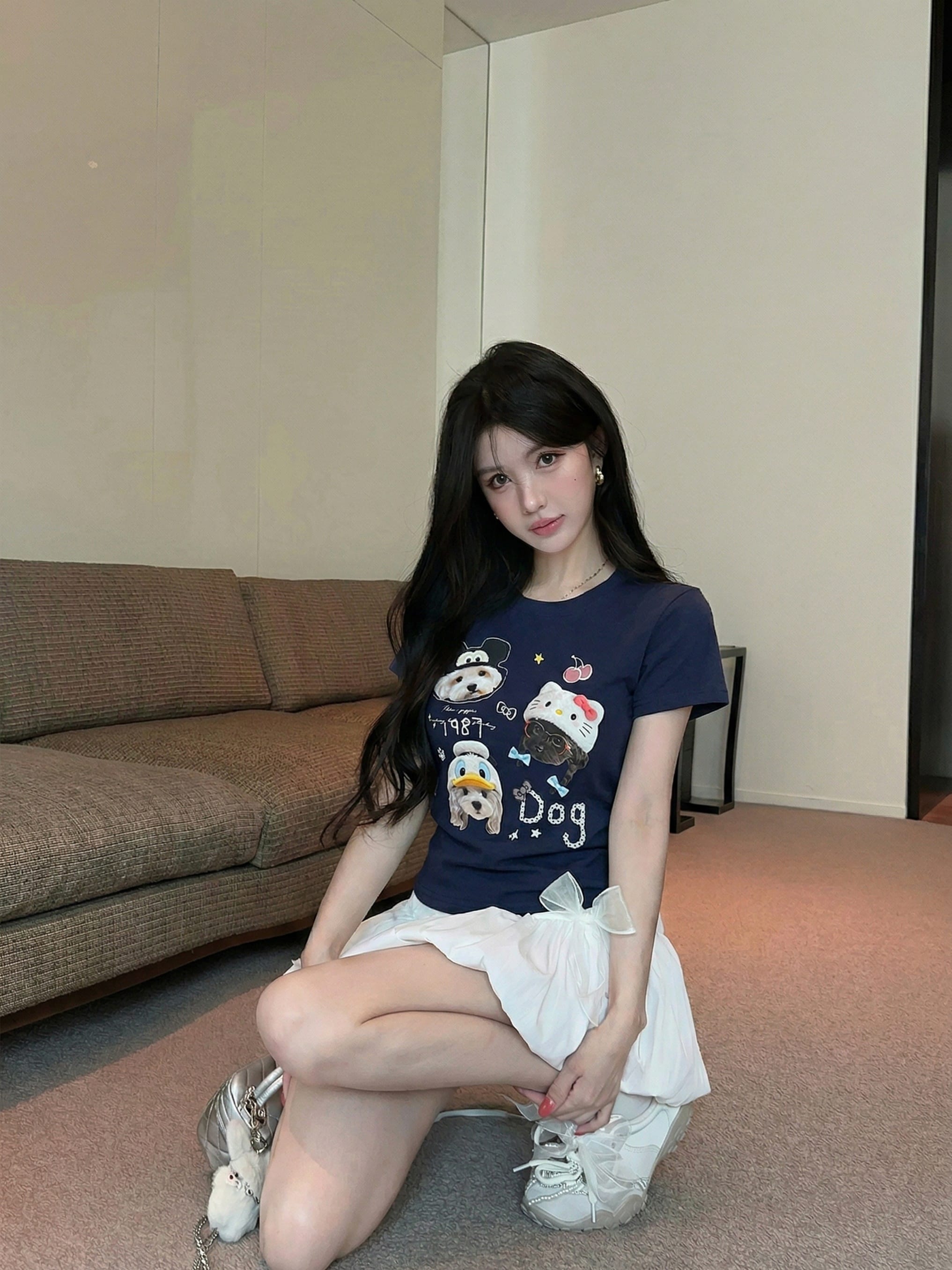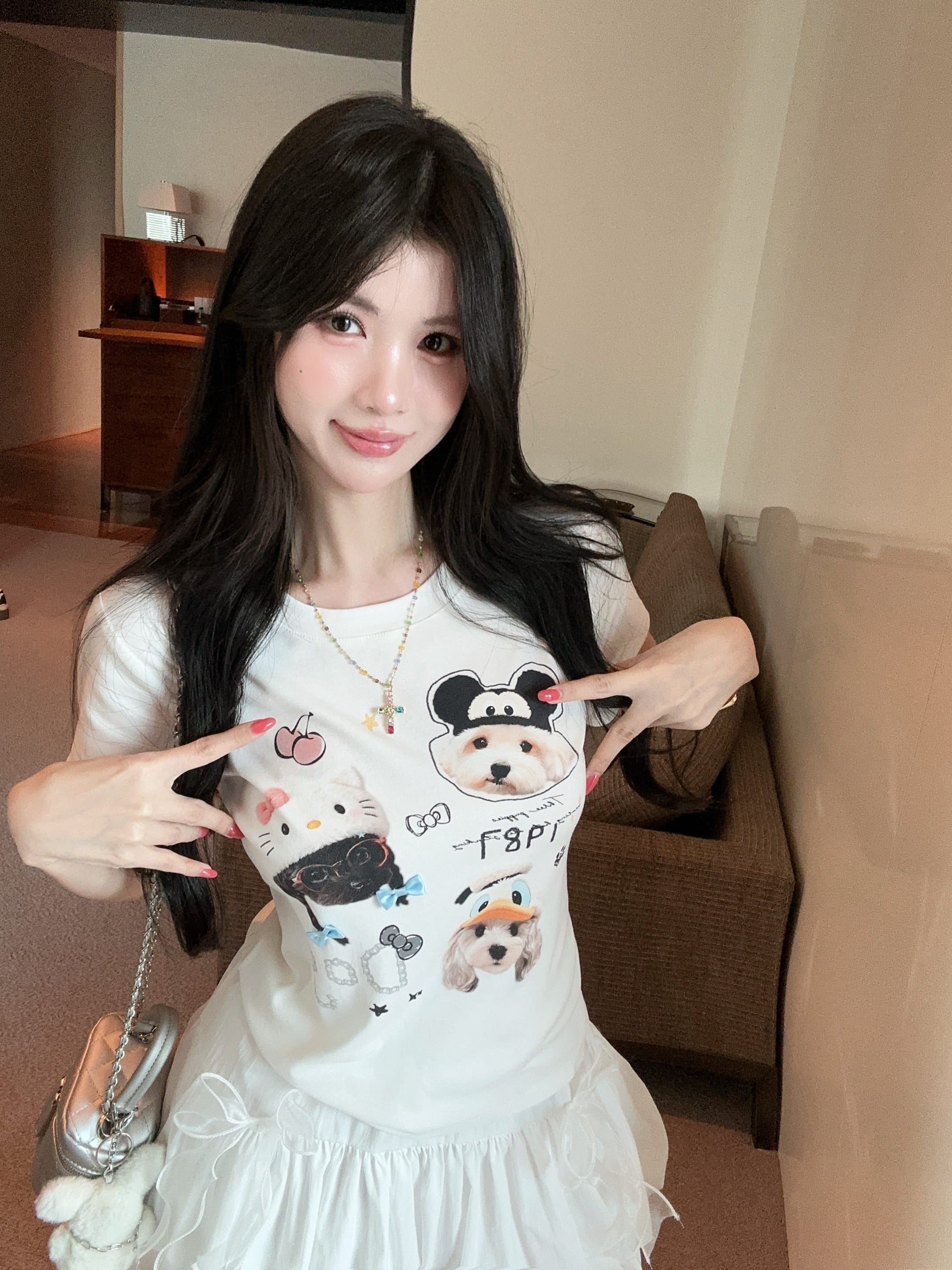 실사 정가 디자인 센스 비스듬한 어깨 슬립 반팔 티셔츠 아름다움 프린트 루즈핏 슬림해 보이는 맨위