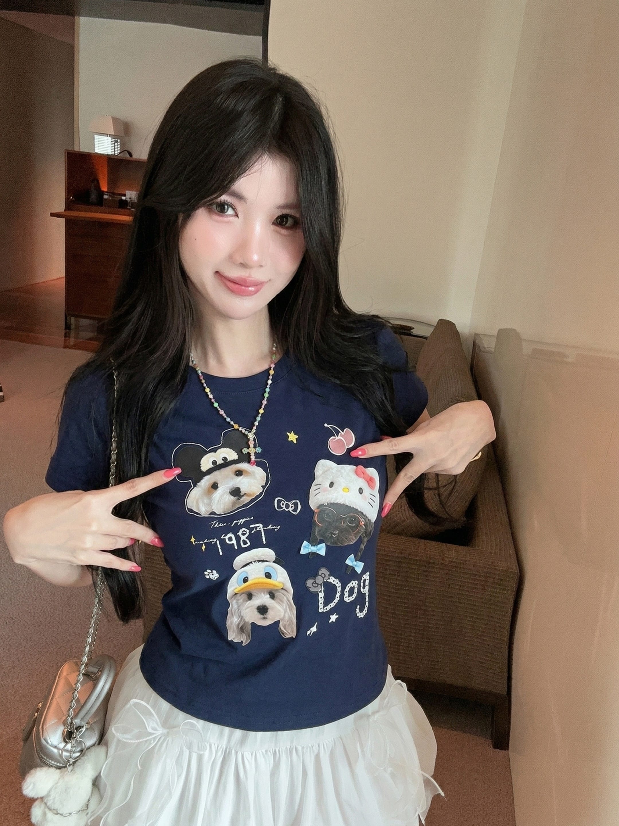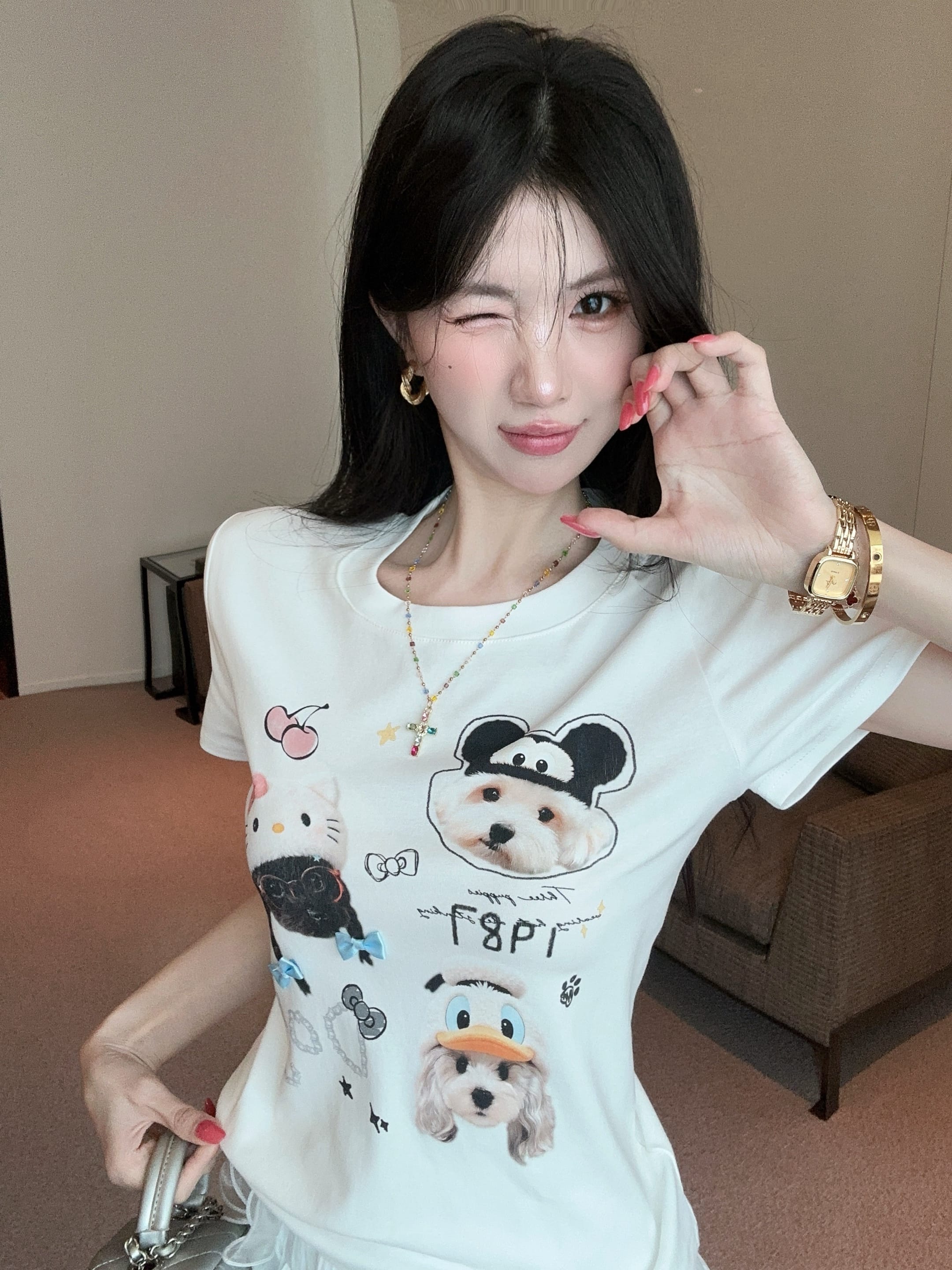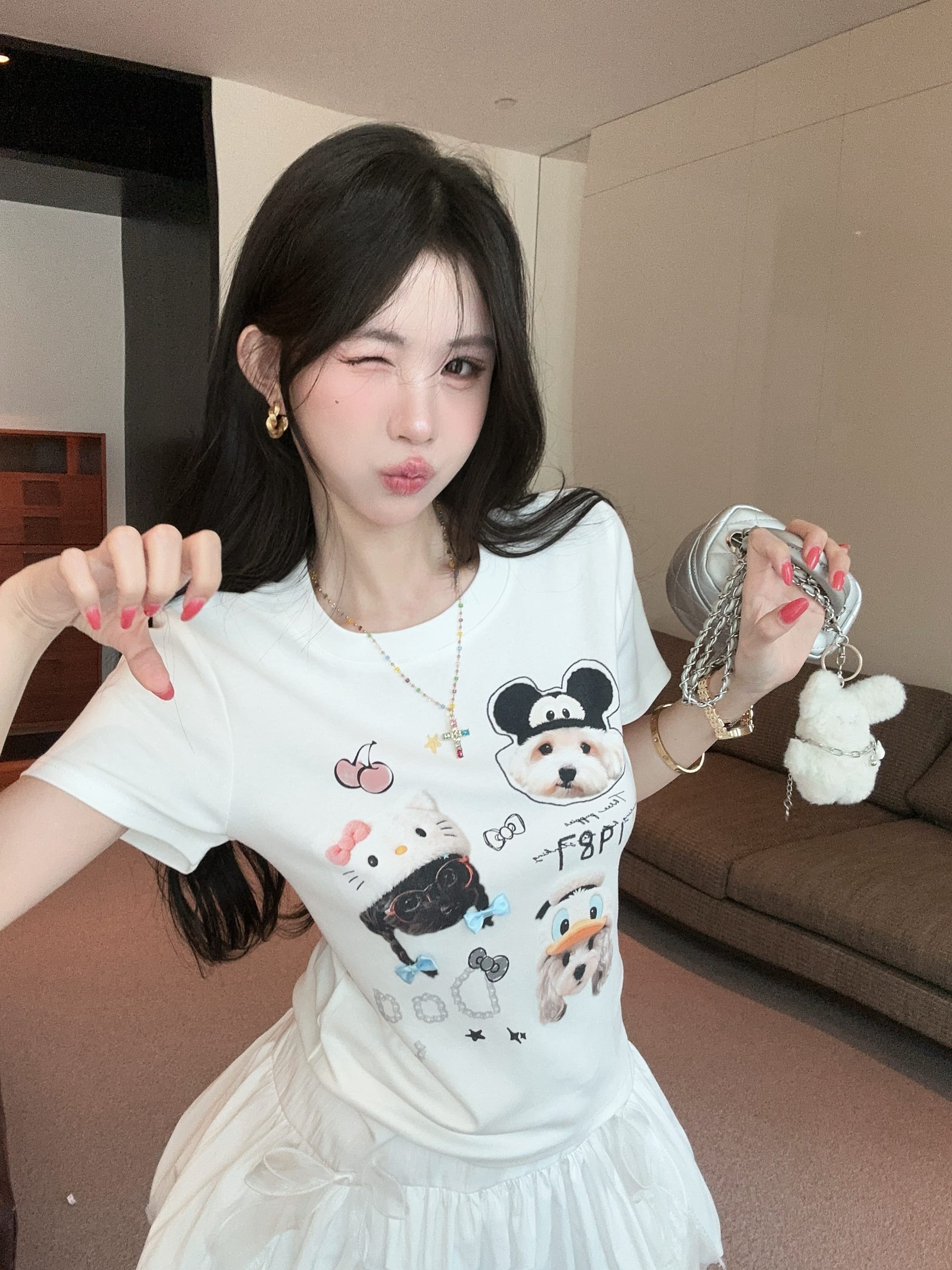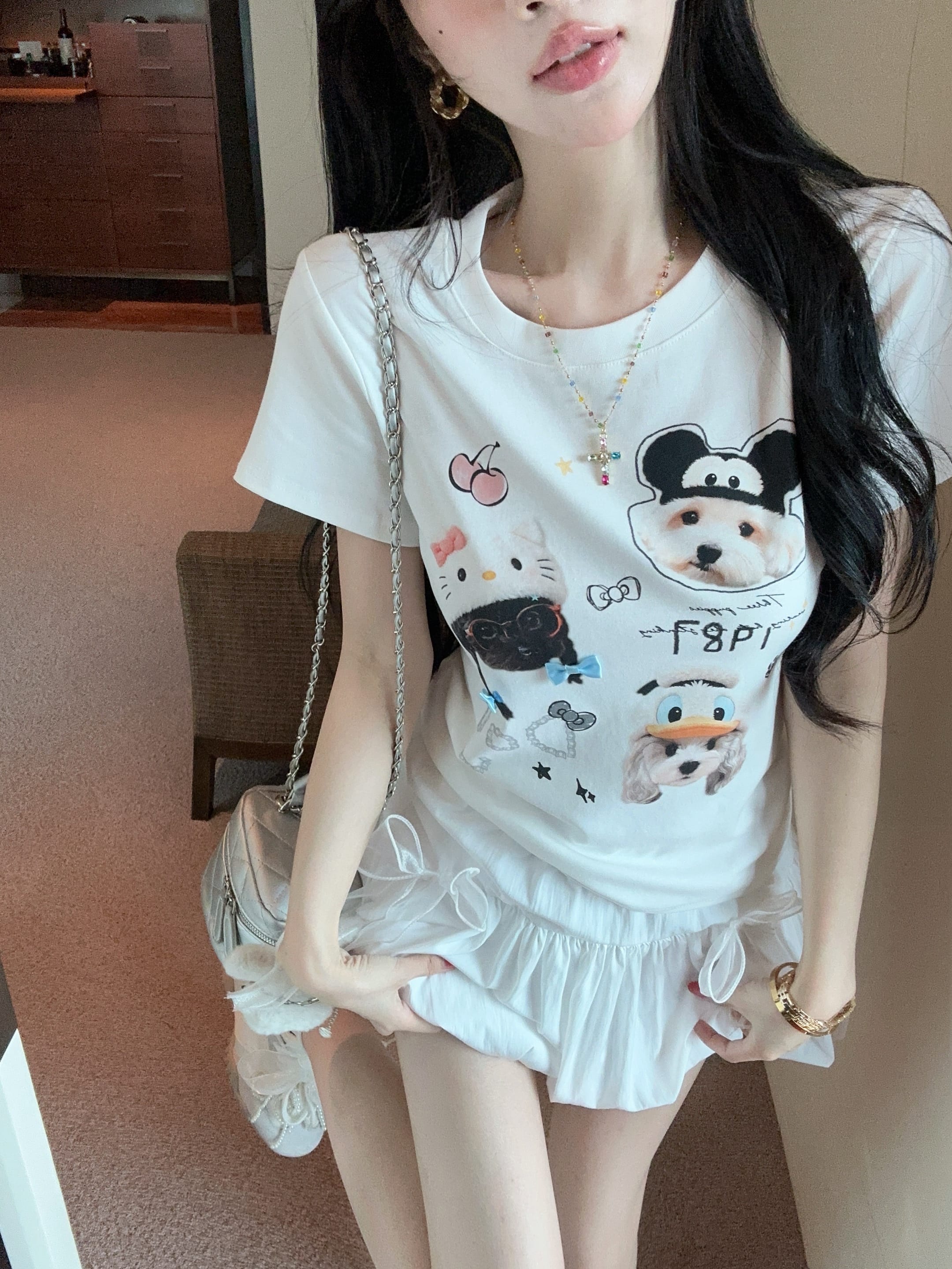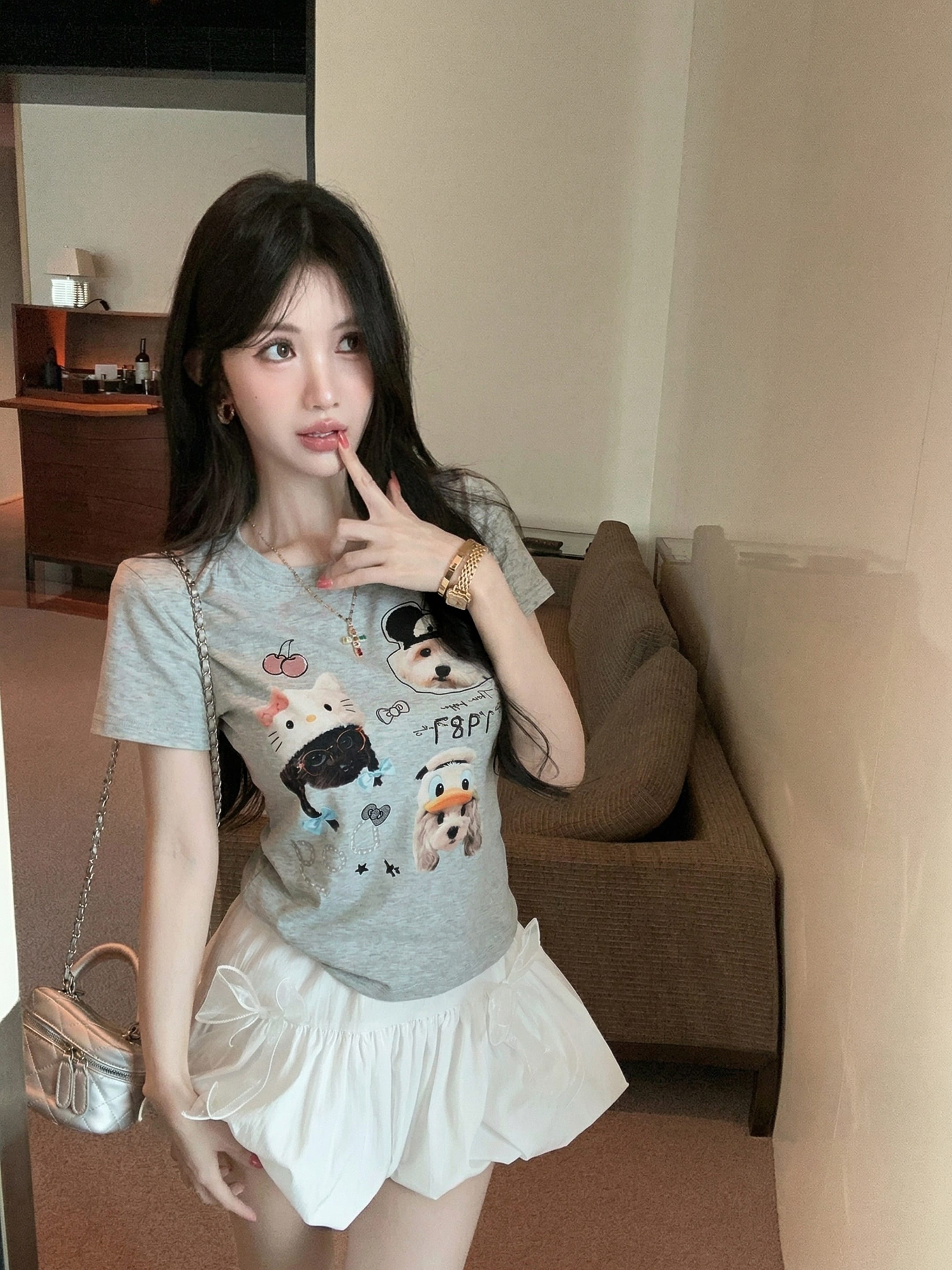 실사 정가 디자인 센스 비스듬한 어깨 슬립 반팔 티셔츠 아름다움 프린트 루즈핏 슬림해 보이는 맨위