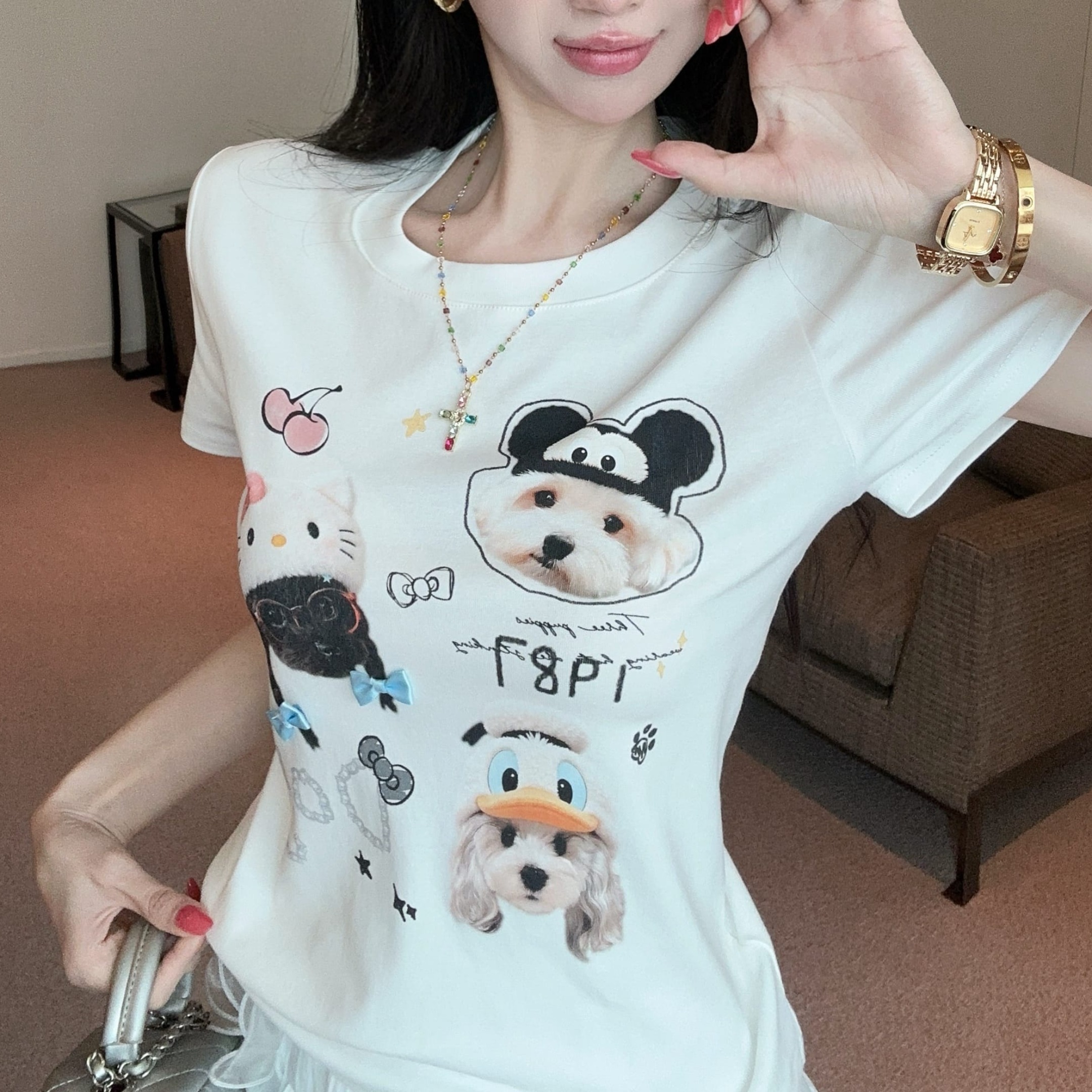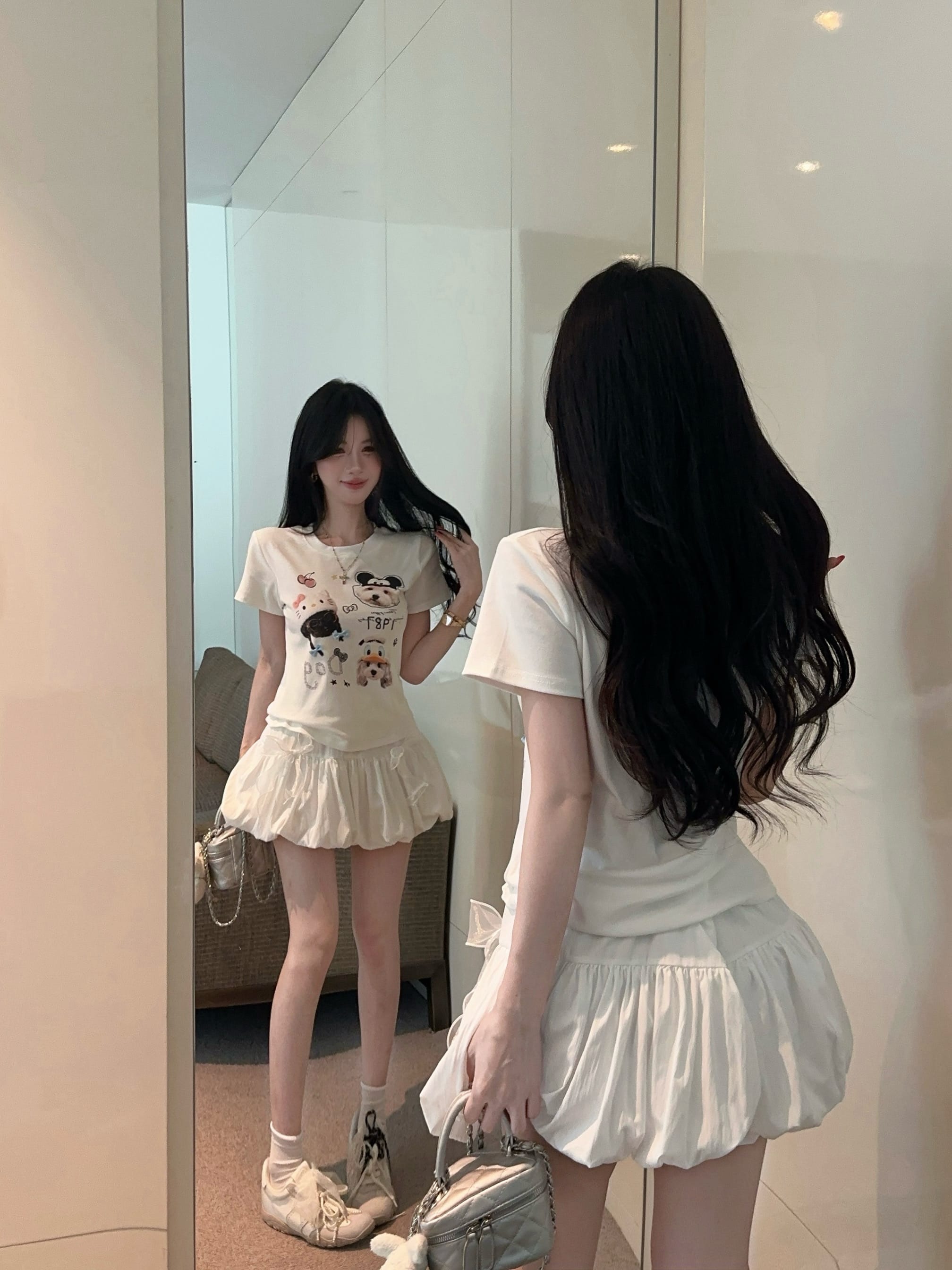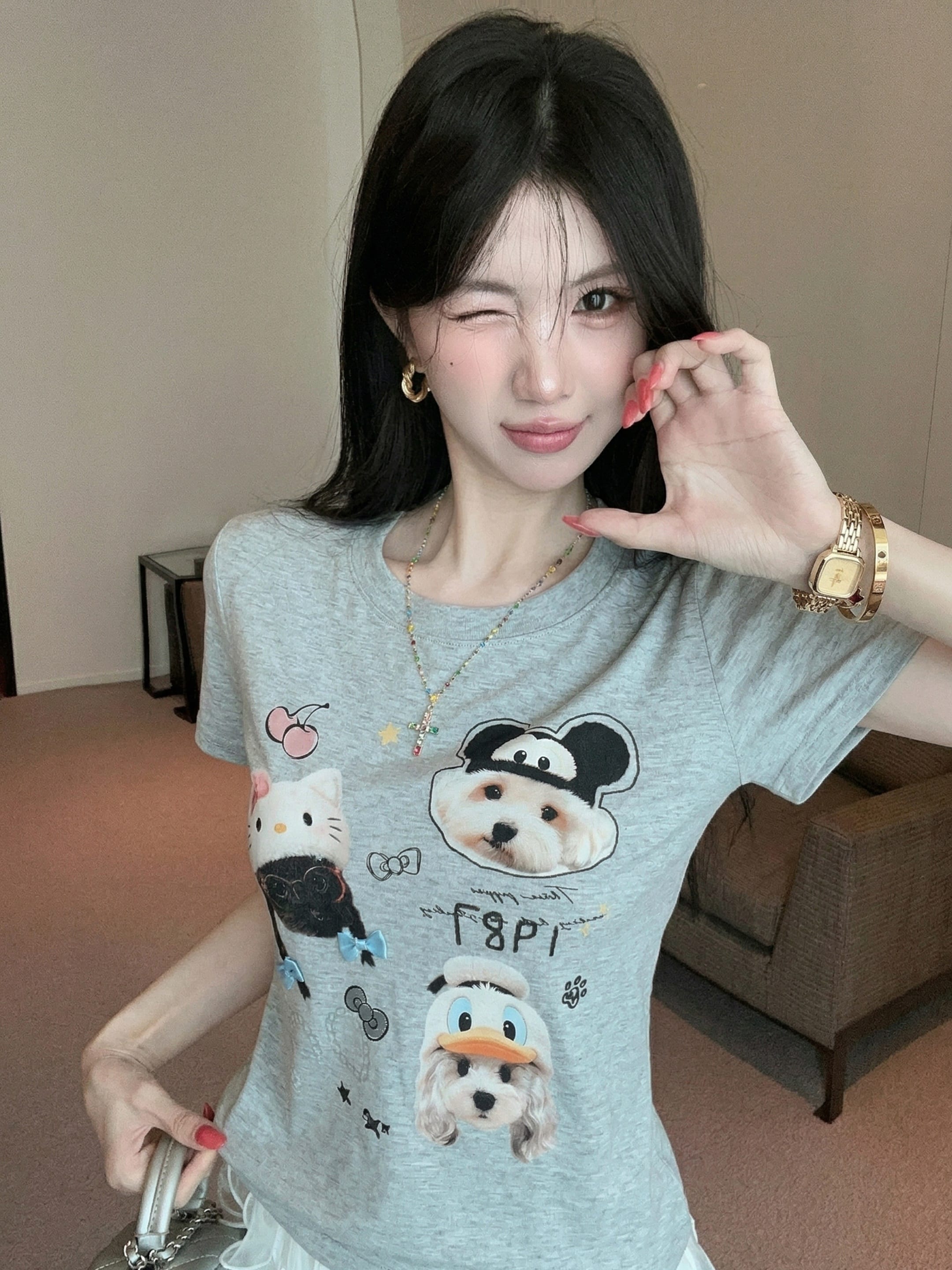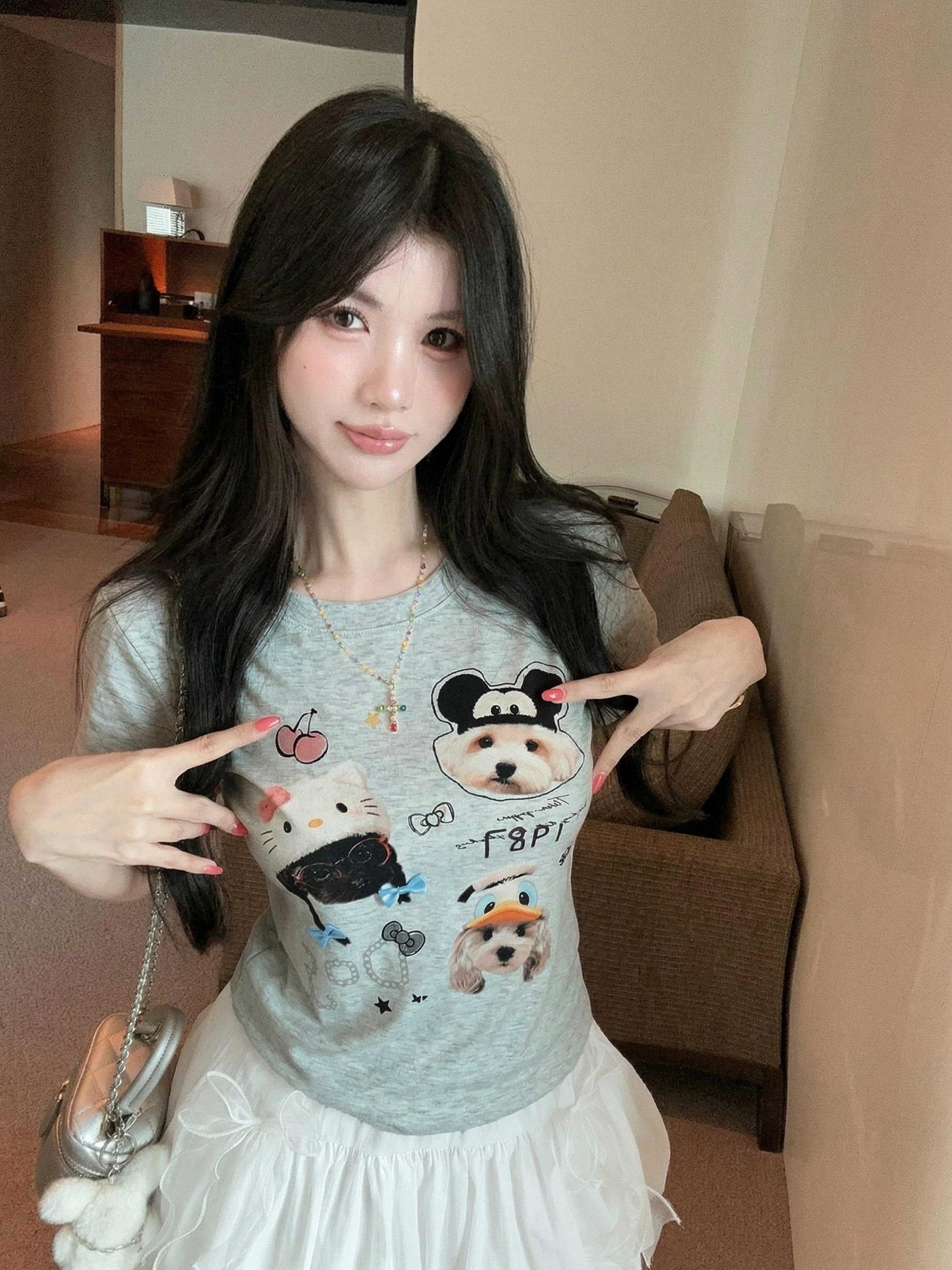 실사 정가 디자인 센스 비스듬한 어깨 슬립 반팔 티셔츠 아름다움 프린트 루즈핏 슬림해 보이는 맨위