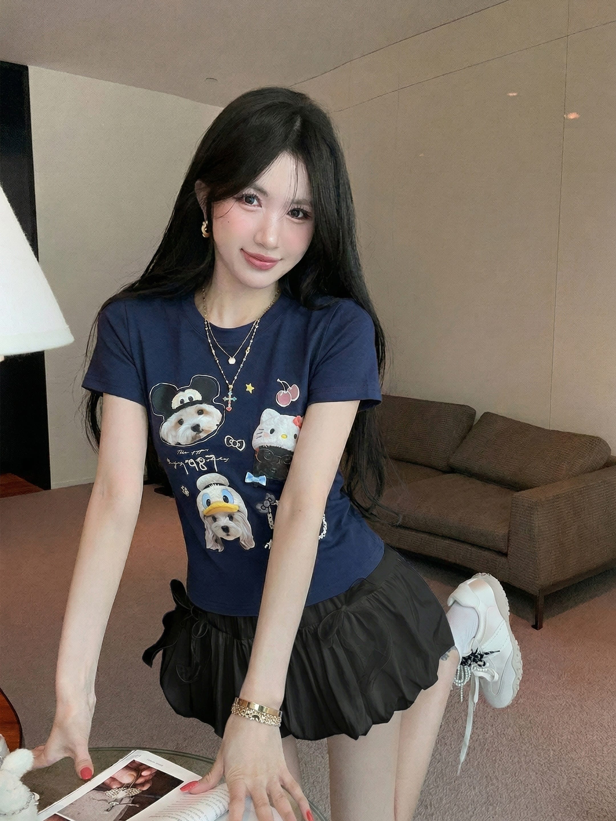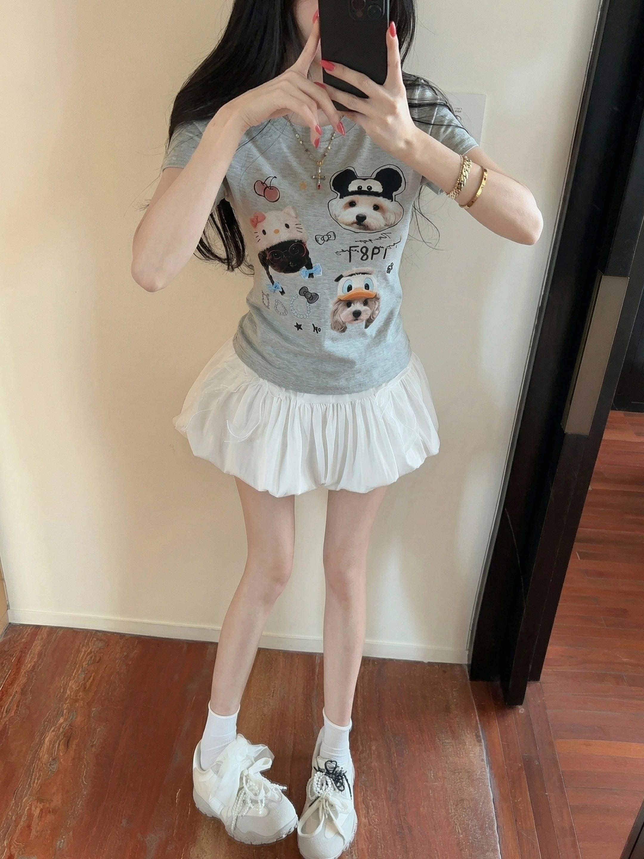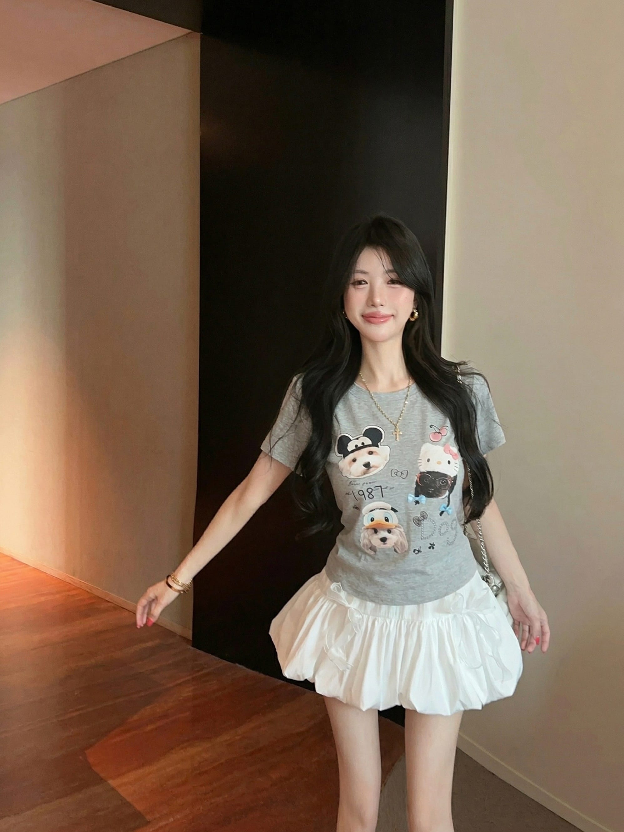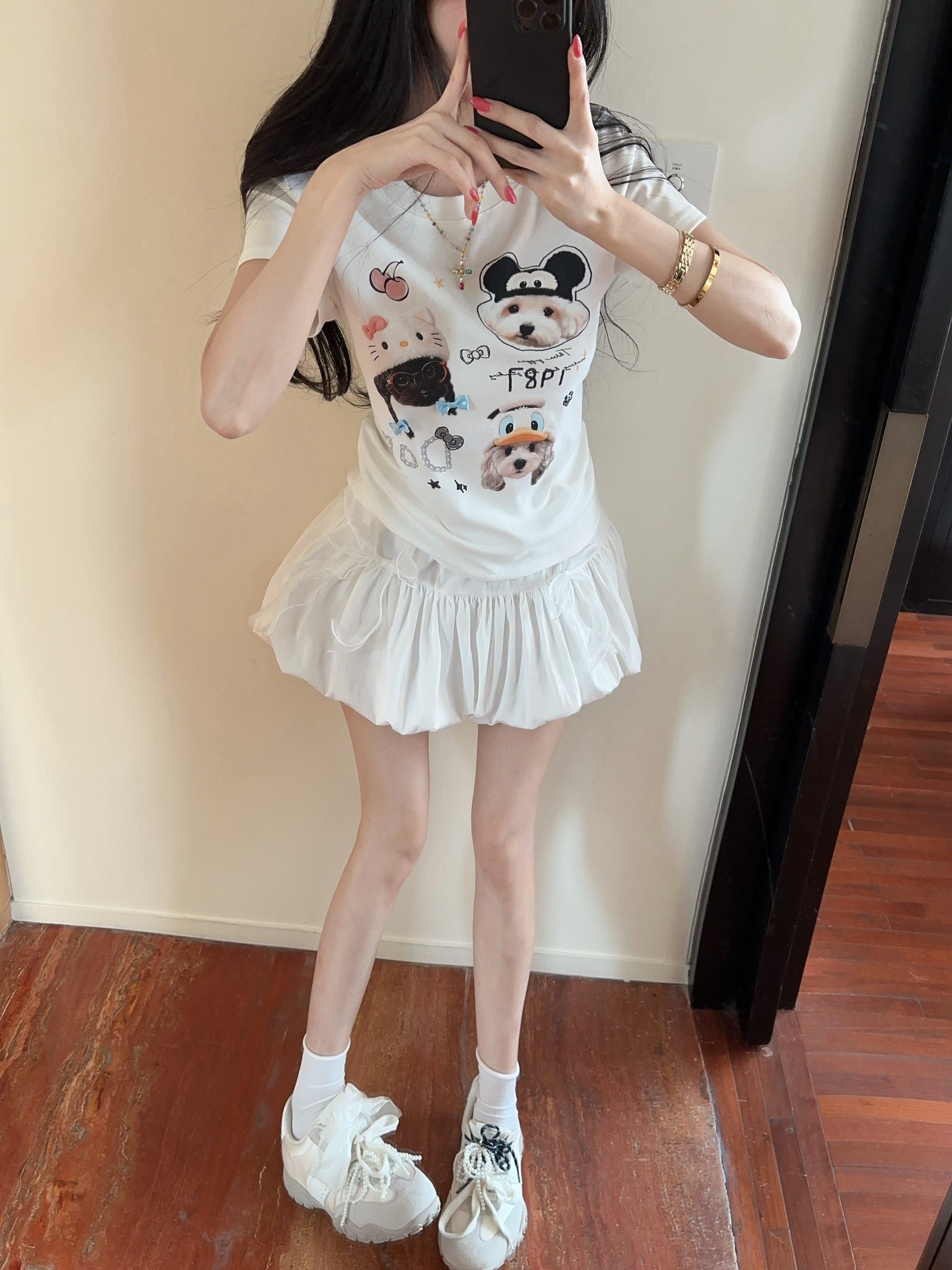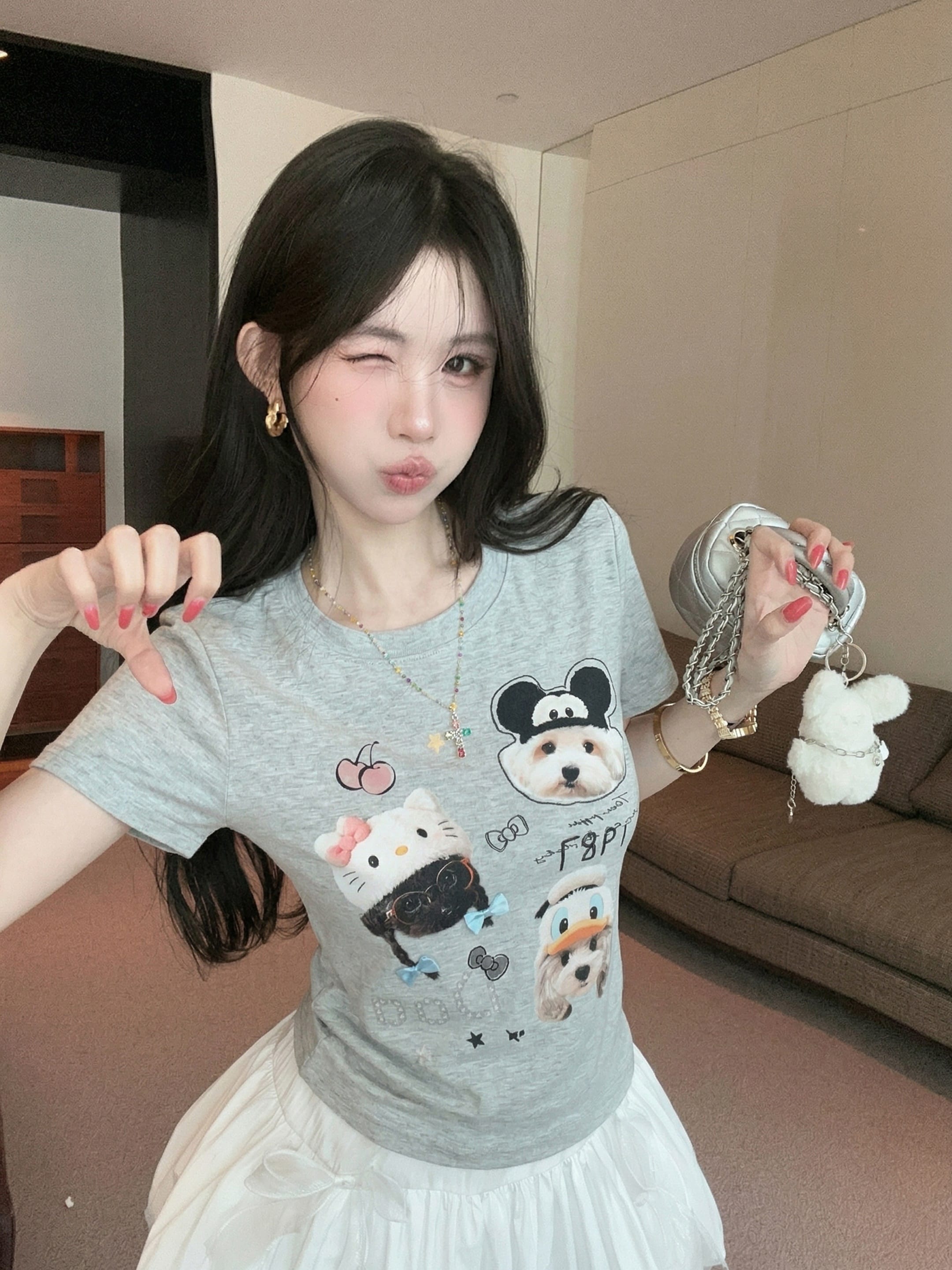 실사 정가 디자인 센스 비스듬한 어깨 슬립 반팔 티셔츠 아름다움 프린트 루즈핏 슬림해 보이는 맨위