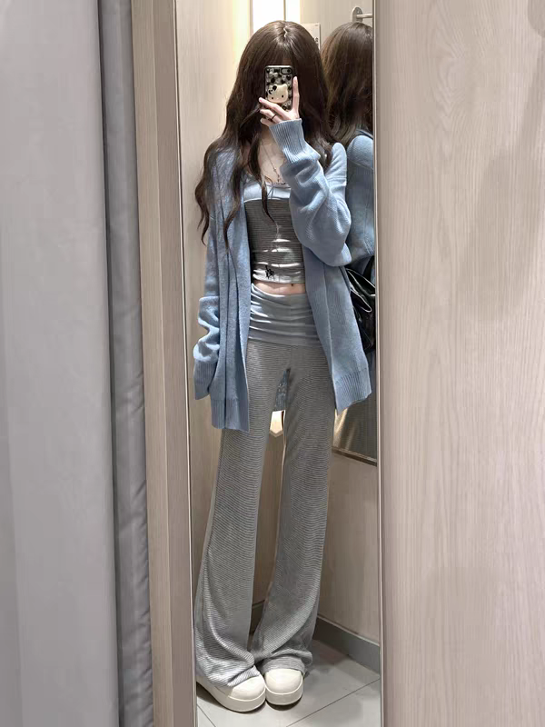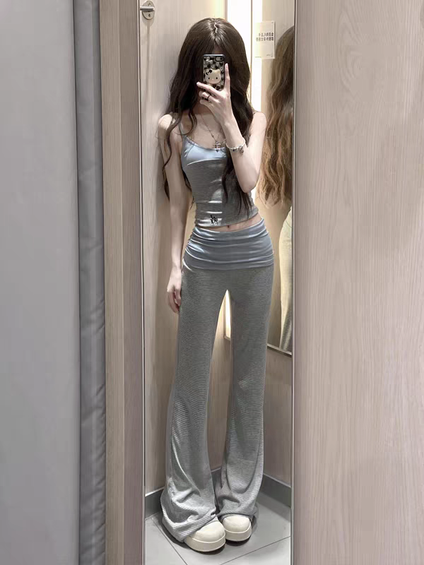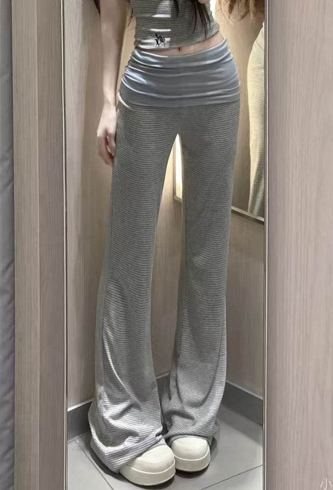 핫걸 로우 웨이스트 배색 스트라이프 부츠컷 요가 바지 여성 디자인 센스 뒤집다 허리 니트 신축성 패치워크 길이 연장 바닥 청소 바지