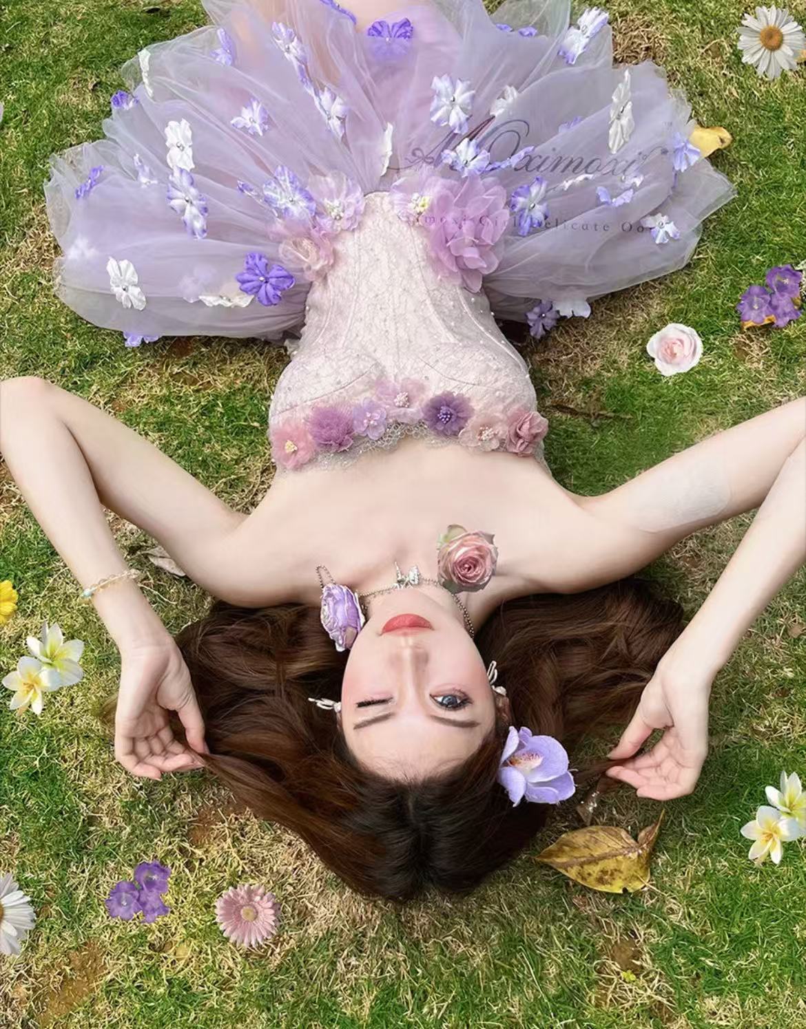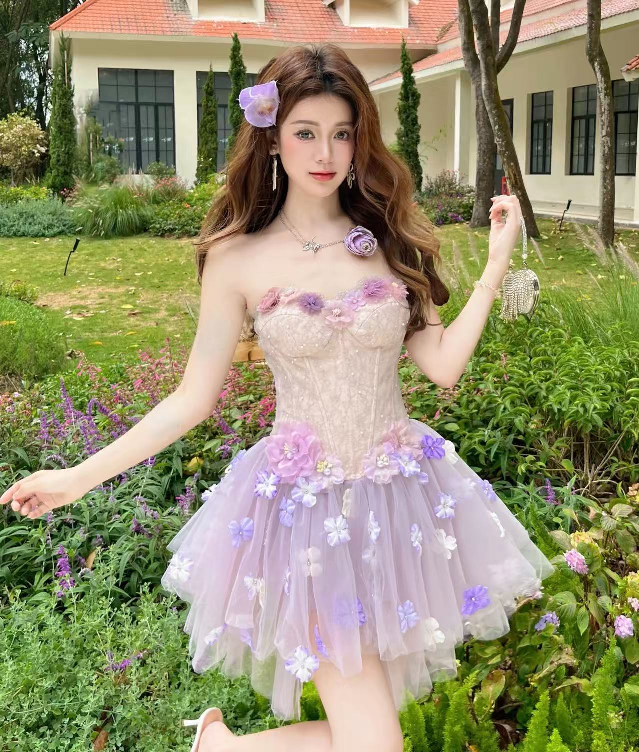 보라색 안개 요정 순수한 욕망 요정 가스 달콤함 3 차원 꽃 생선뼈 허리 수축 한 마디 퍼프 스커트