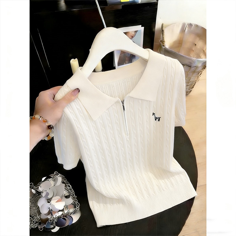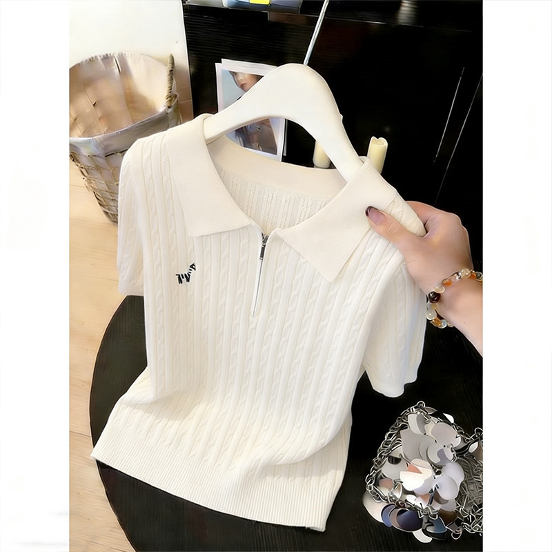 화이트 POLO 칼라 꽈배기 니트 스웨터 얼음 실크 반팔 여성 여름 다용도 티셔츠 긍정적 인 어깨 슬림해 보이는 맨위