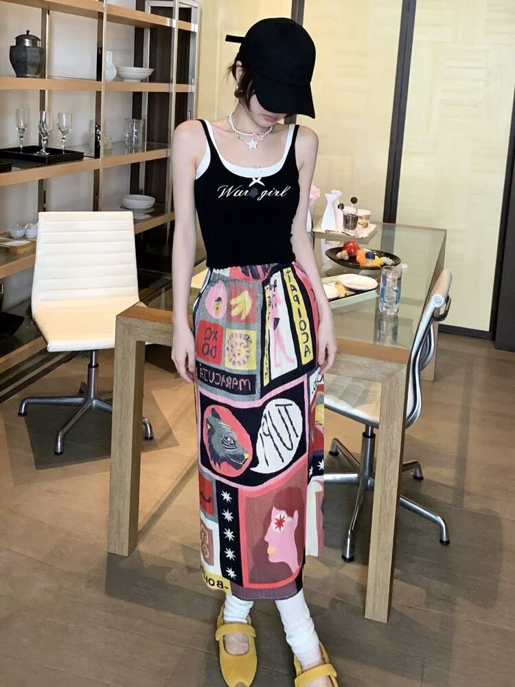 2026 봄 여름 새로운 패션 하이웨이스트 슬림해 보이는 패치워크 색상 프린트 아마 한 마디 타이트 스커트 반신 스커트 여성