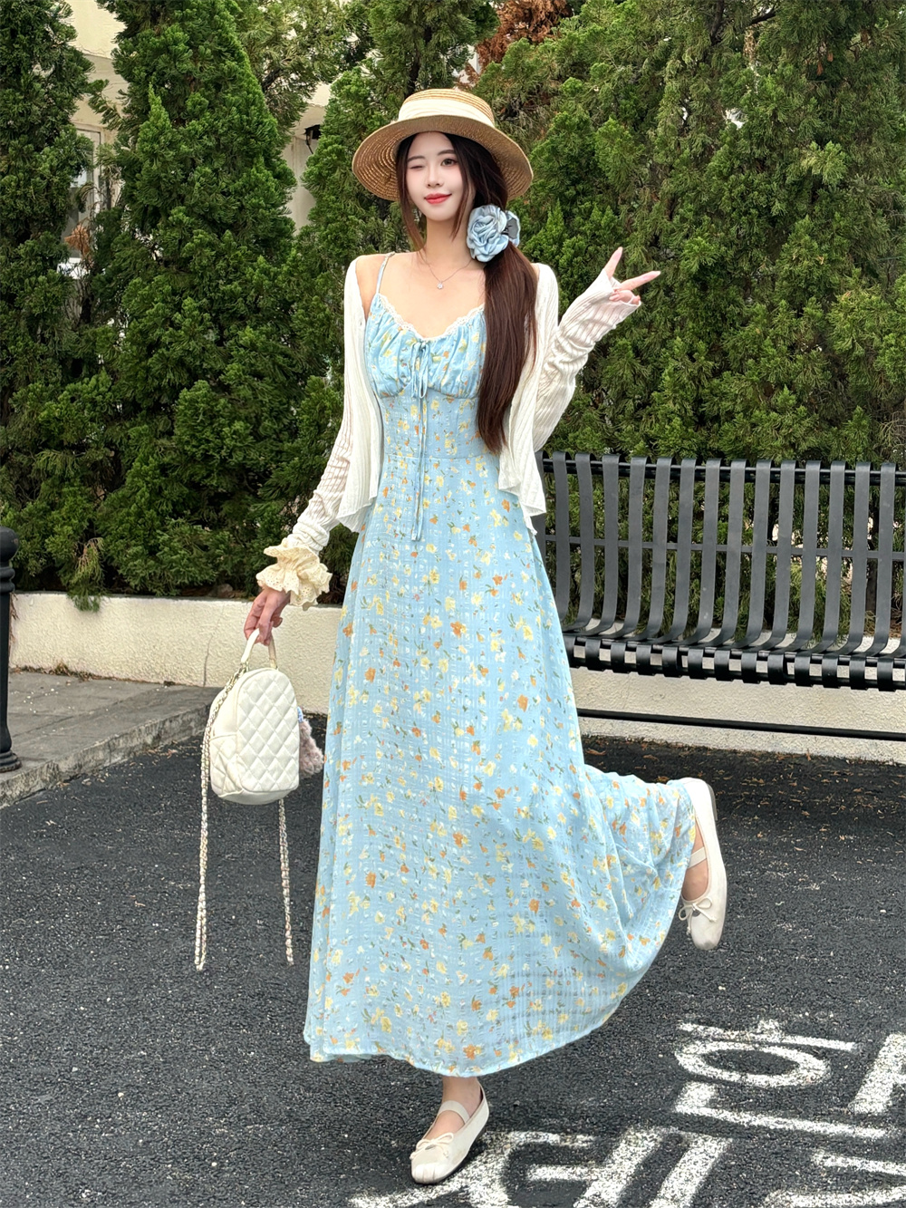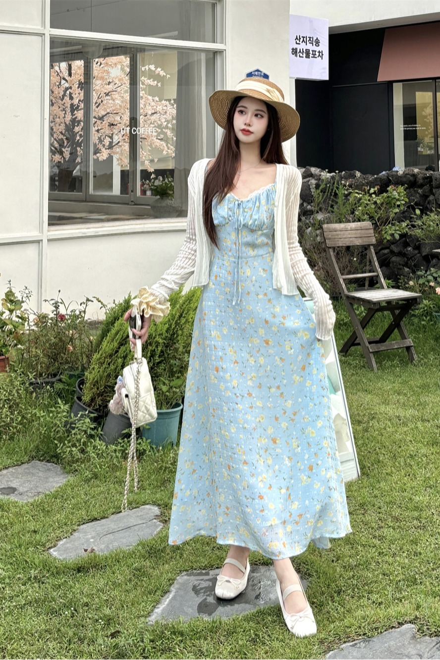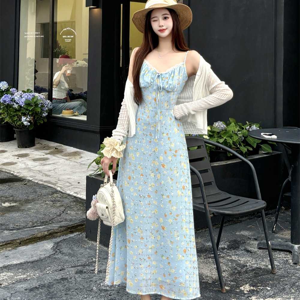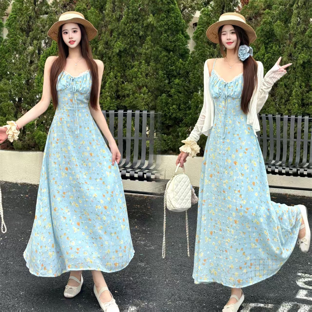 실사 빅 사이즈 프랑스식 부드러운 바람 드레스 여름 새로운 휴가 바람 홀로우 아웃 오픈 가디건 플러스 슬립 드레스 투피스 세트