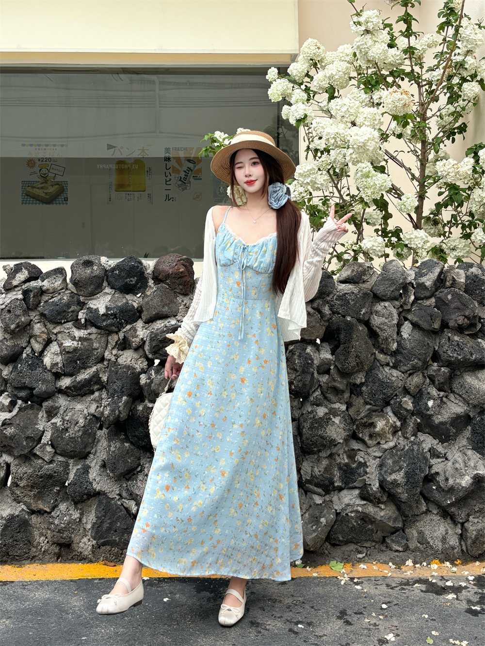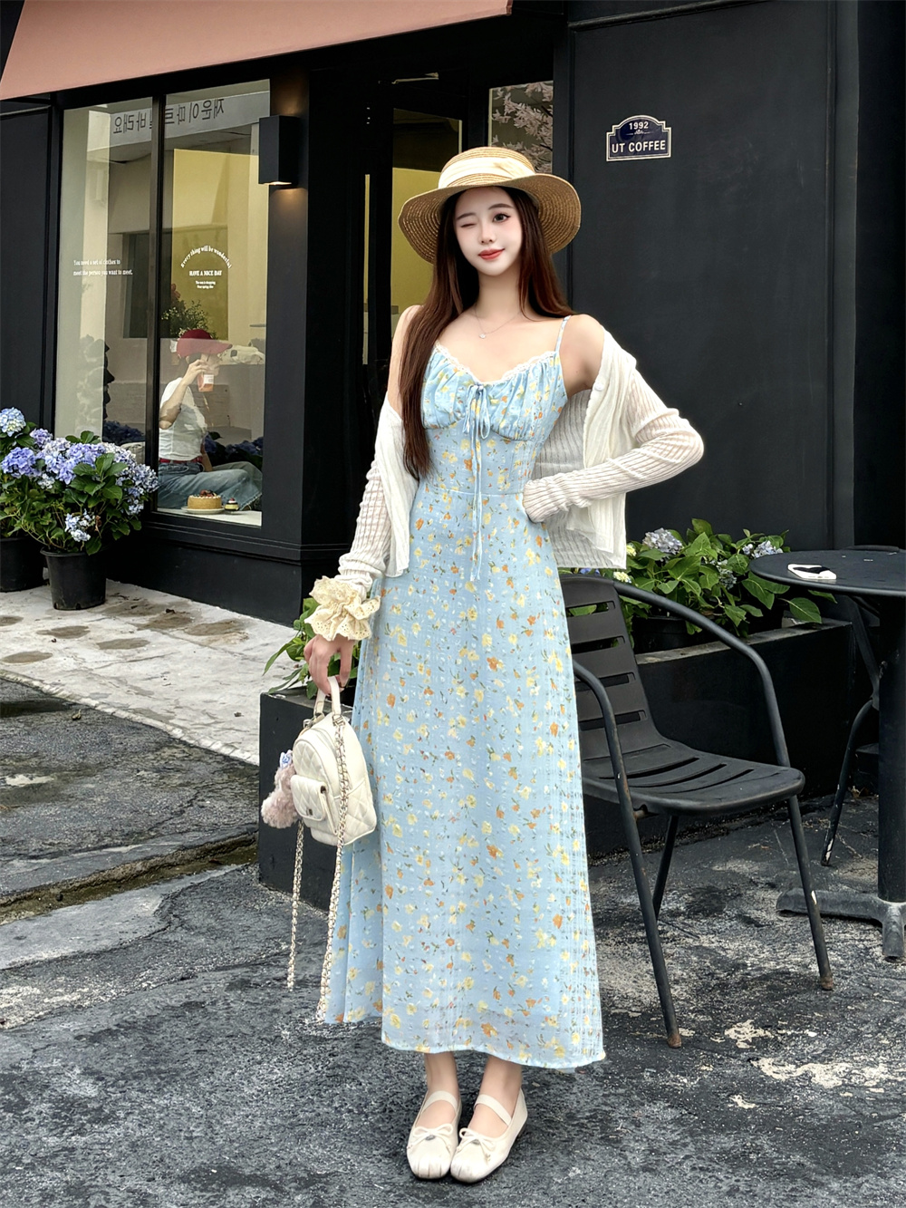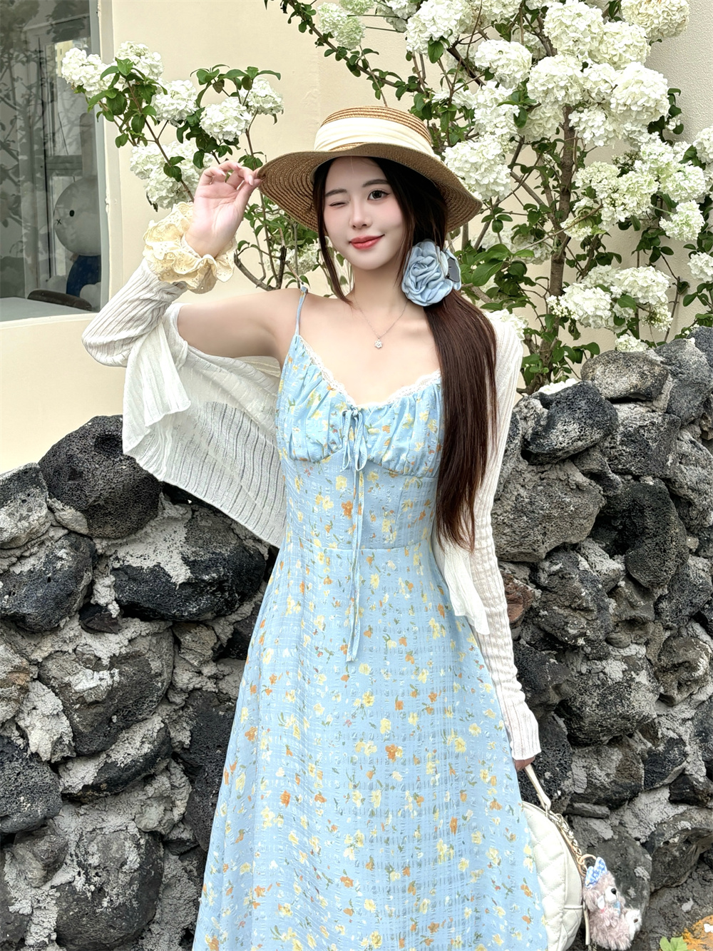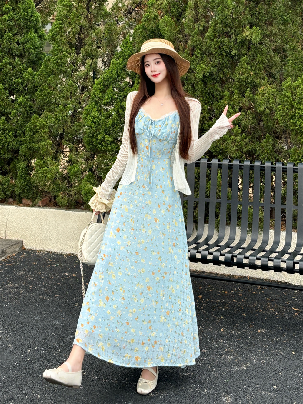 실사 빅 사이즈 프랑스식 부드러운 바람 드레스 여름 새로운 휴가 바람 홀로우 아웃 오픈 가디건 플러스 슬립 드레스 투피스 세트