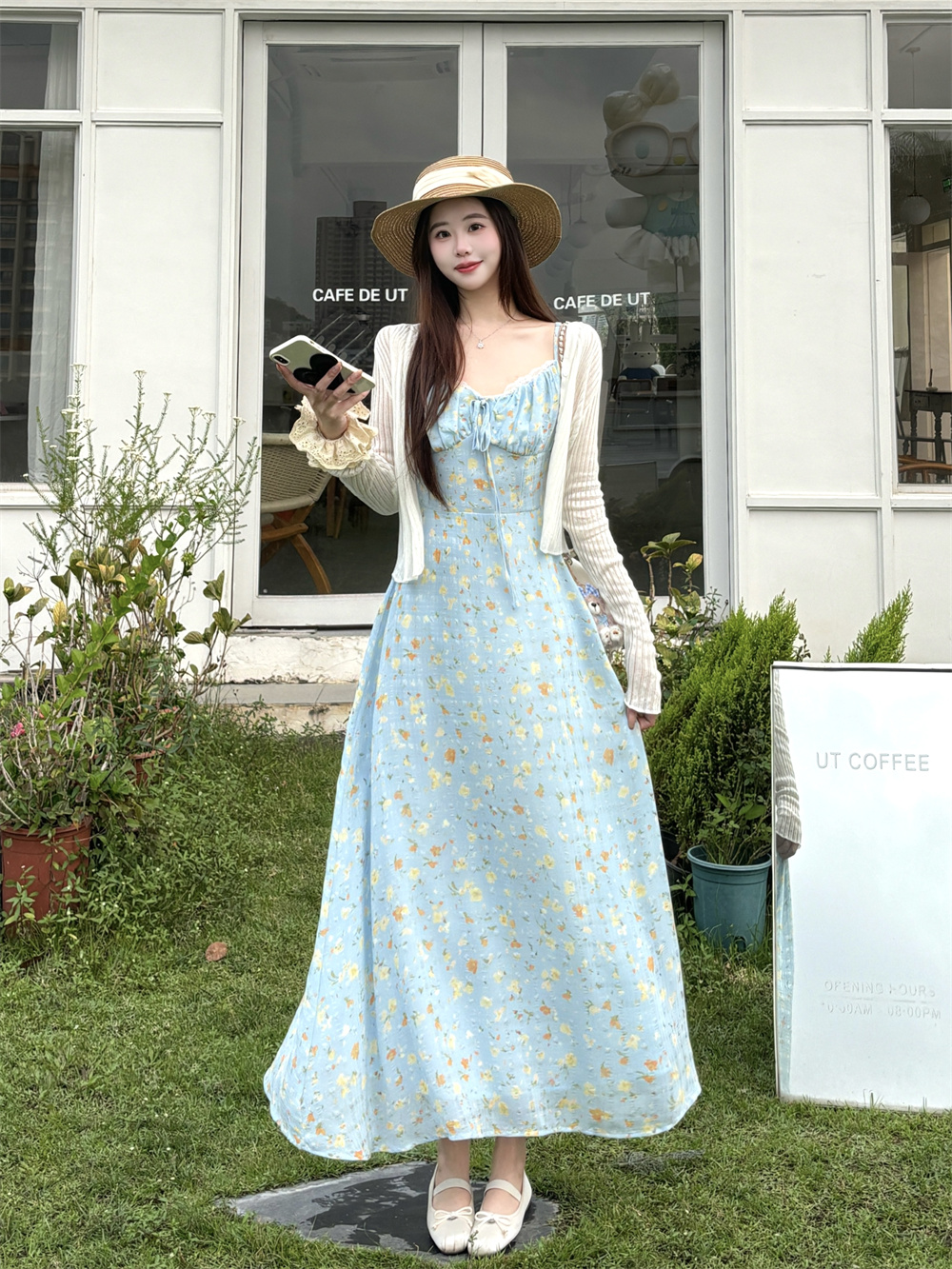 실사 빅 사이즈 부드러운 바람 화이트 슬립 드레스 니트 오픈 가디건 세트 여성 새로운 디자인 센스 슬림해 보이는 치마