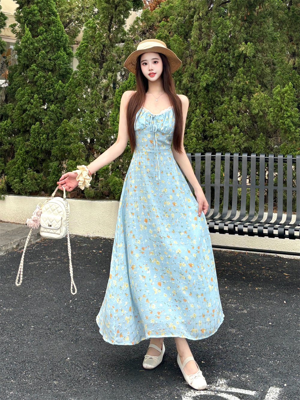 실사 꽃무늬 레이스 광장 칼라 레이스업 캐미솔 목이버섯 레이스 반신 스커트 중간 길이 큰 진자 우산 치마