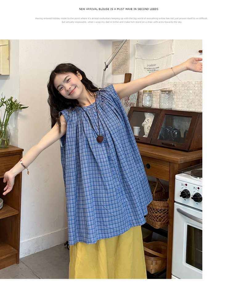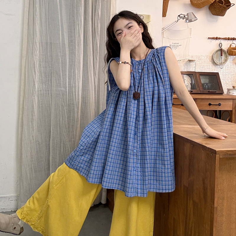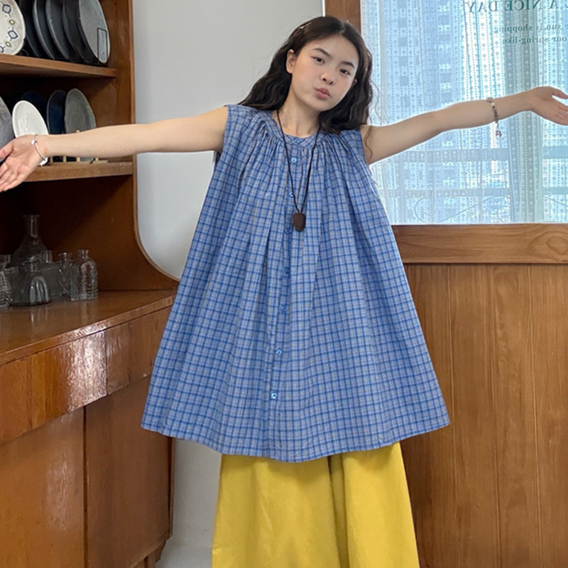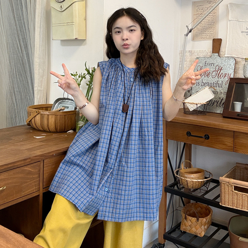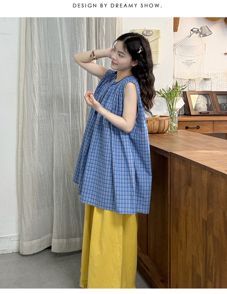 실사 2026 여름 드레스 새로운 파란색 라운드 넥 민소매 셔츠 출산 착용