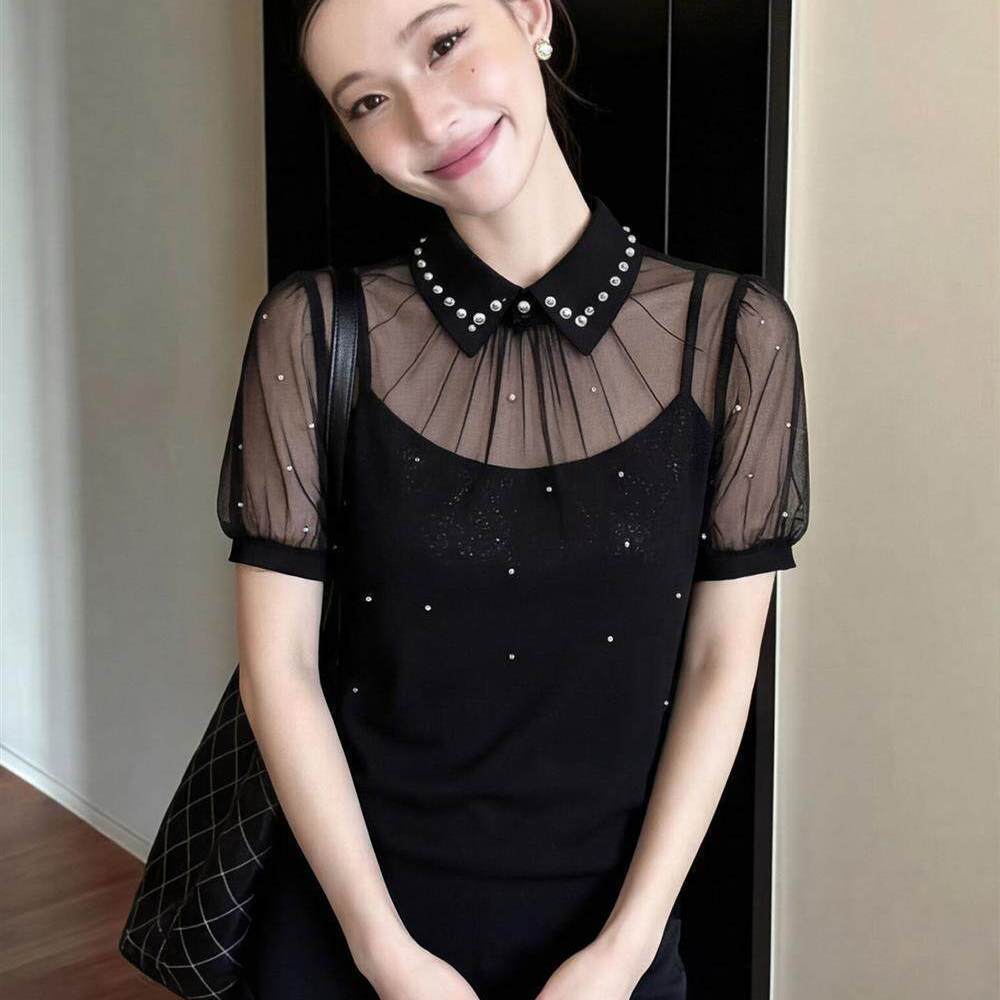 프랑스식 빛 럭셔리 고급 디자인 센스 도트 무늬 반팔 여성 셔츠 고유 한 슈퍼 잘 생긴 몸매 가꾸기 슬림해 보이는 짧은 맨위 여름