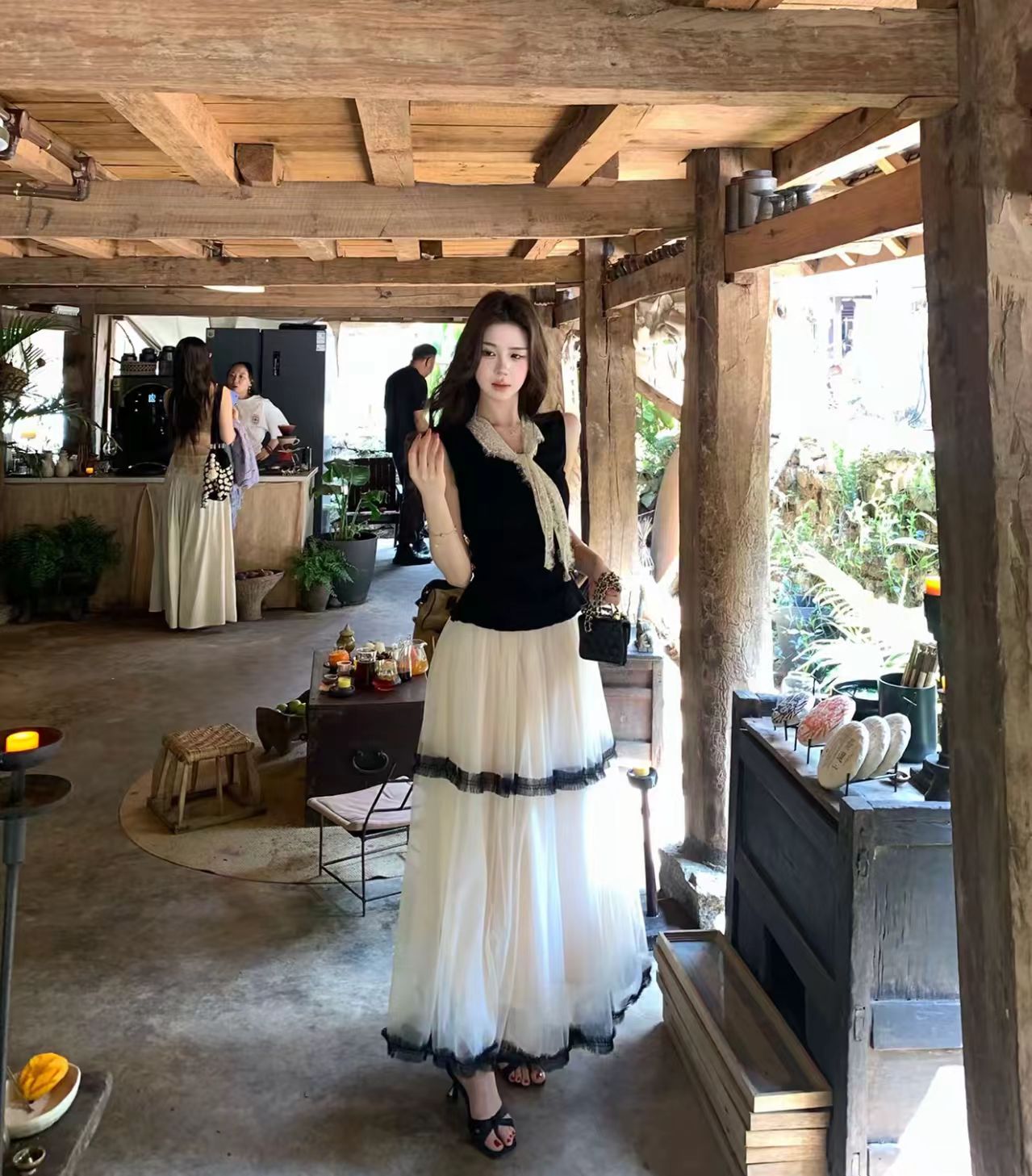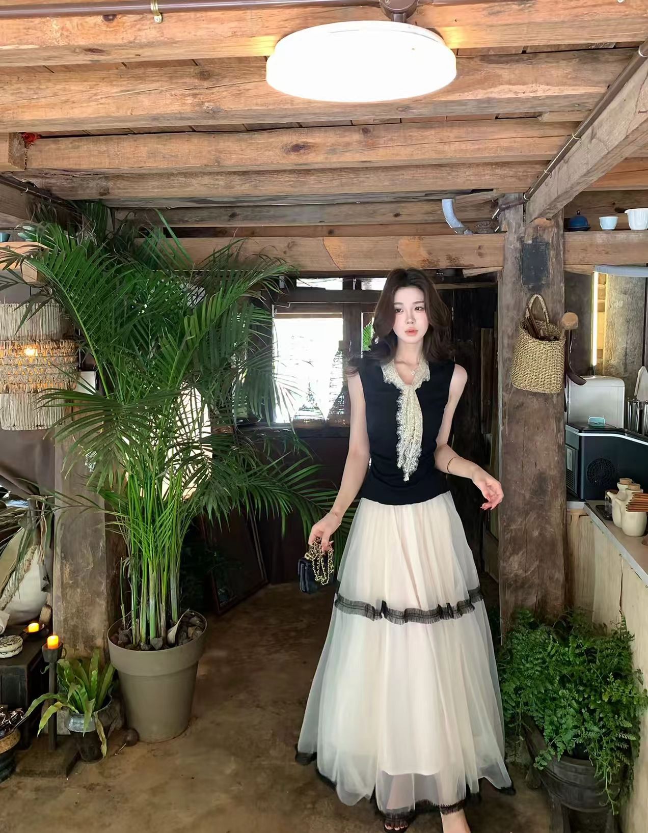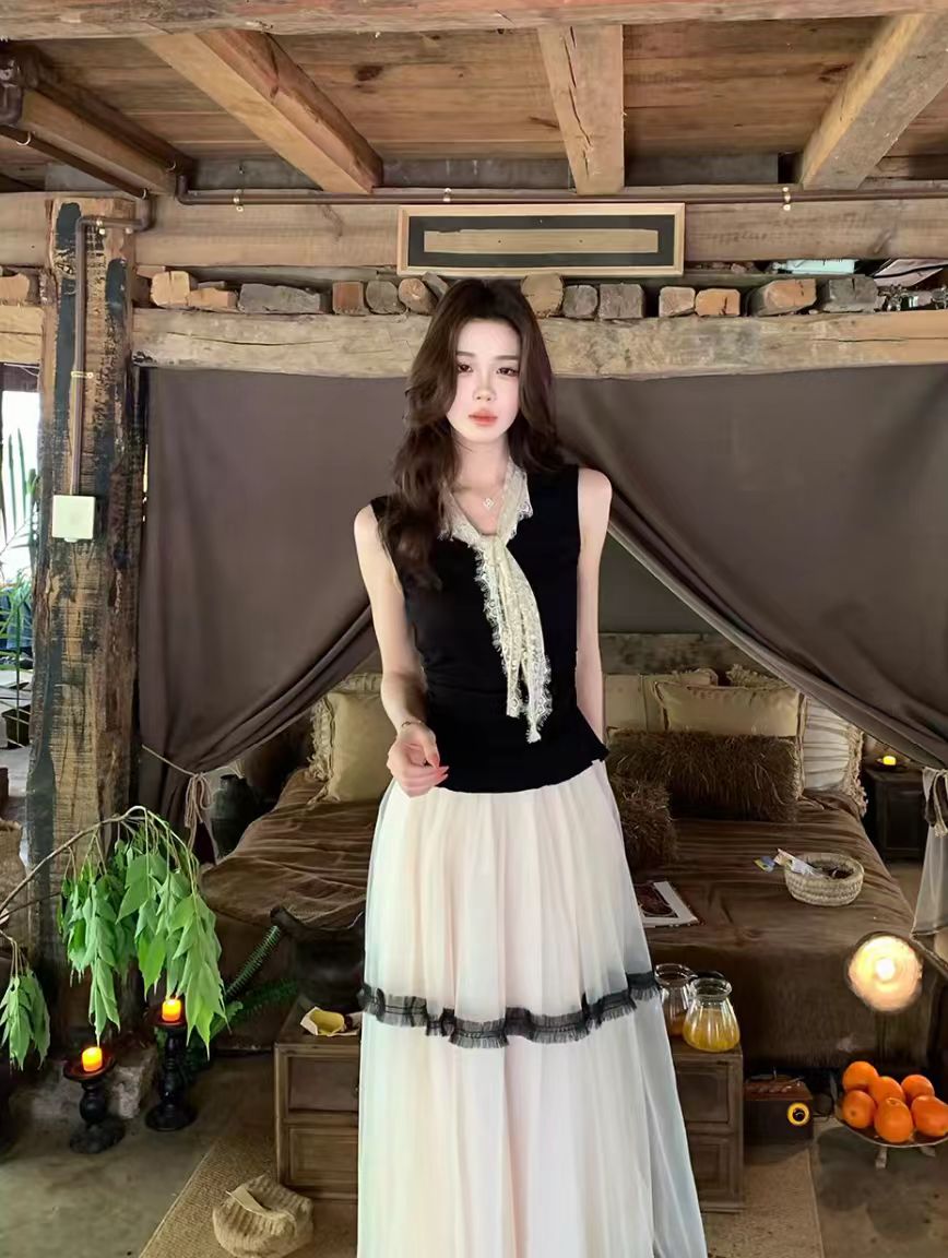 무쯔리 목자이 나무 하우스 블랙 조정 여름 민소매 허리 수축 맨위 프랑스식 부드러운 바람 리본 디자인 센스 조끼