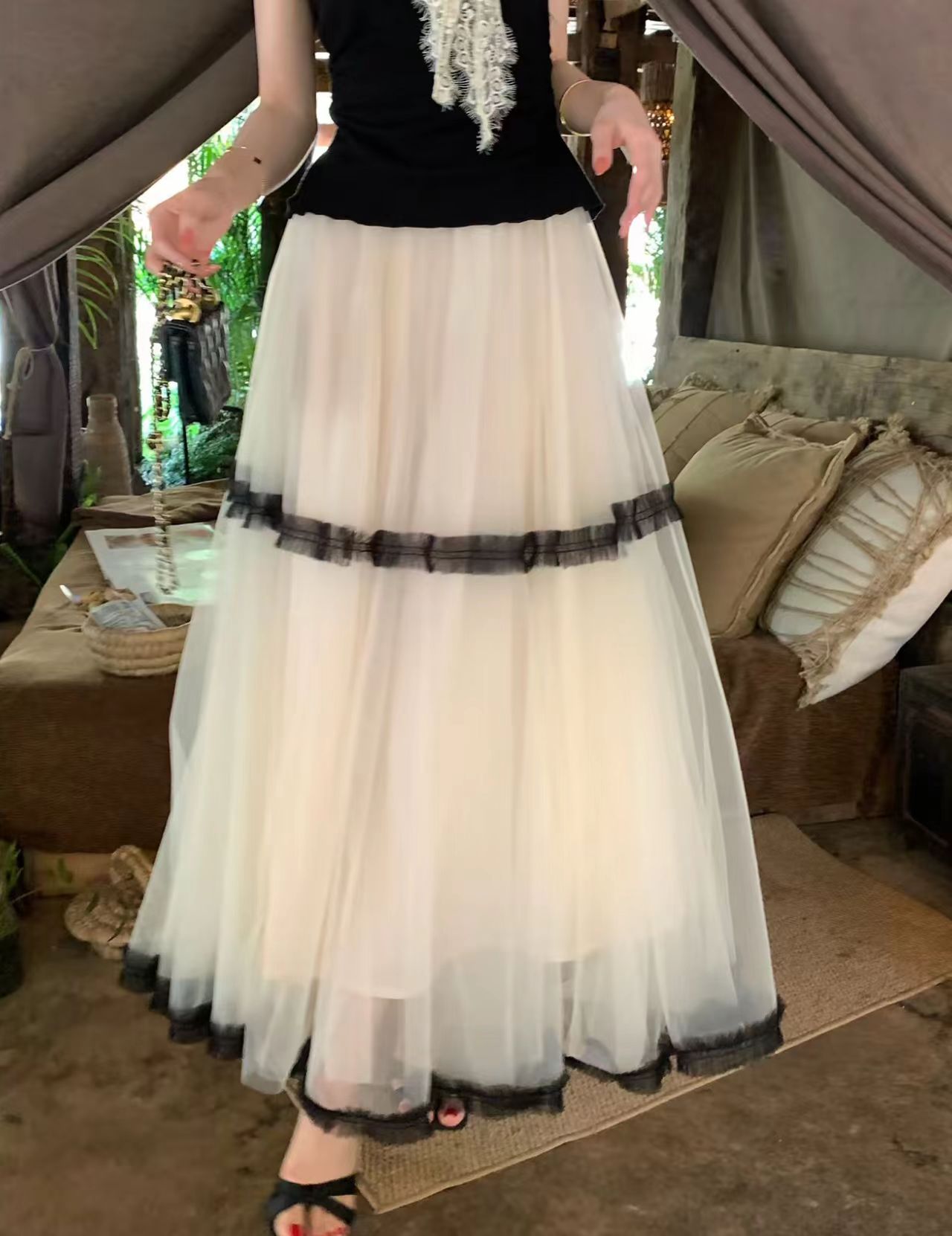무쯔리 목자이 맑은 주간 남자 와일드 휴가 느슨함 바람 프릴 슬립 드레스 허리 수축 자르기 분위기 센스 롱 스커트