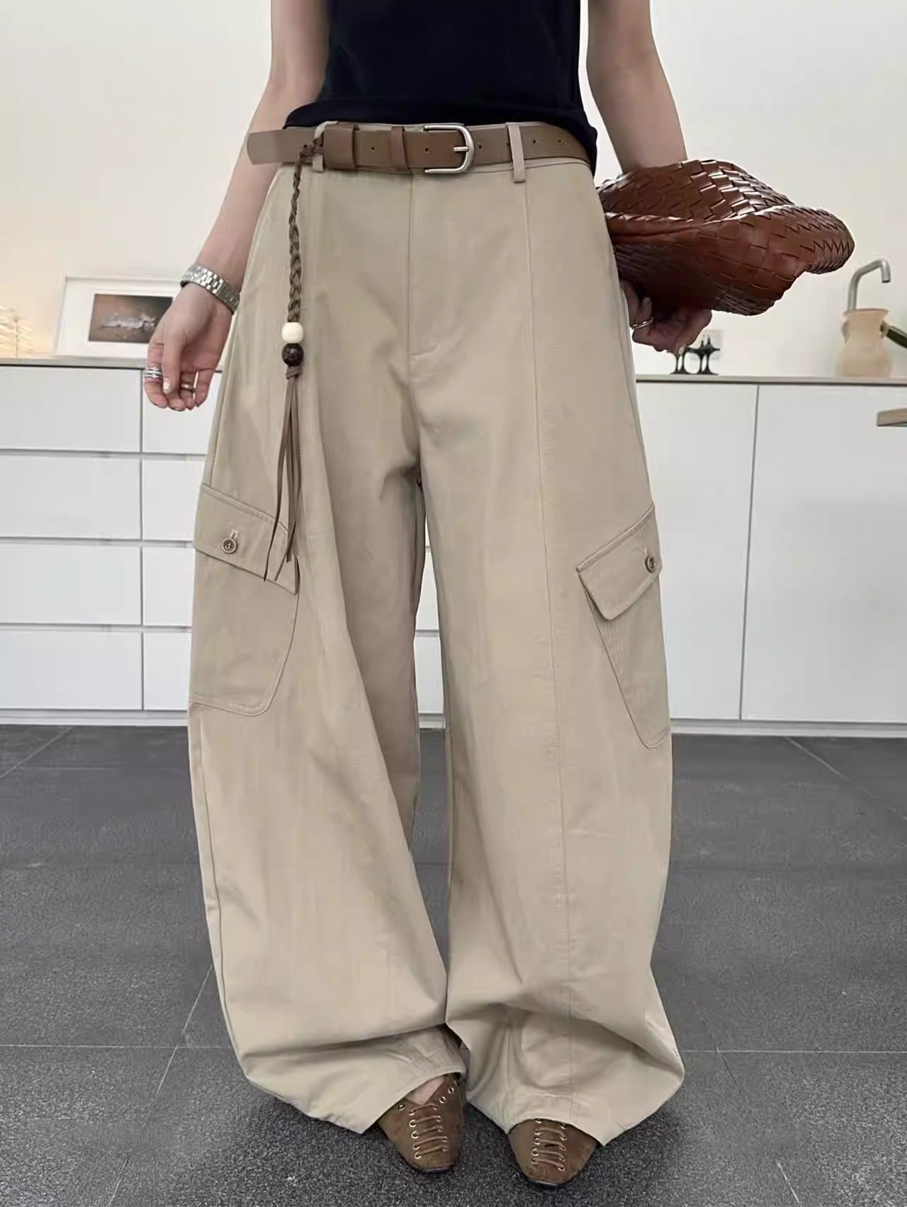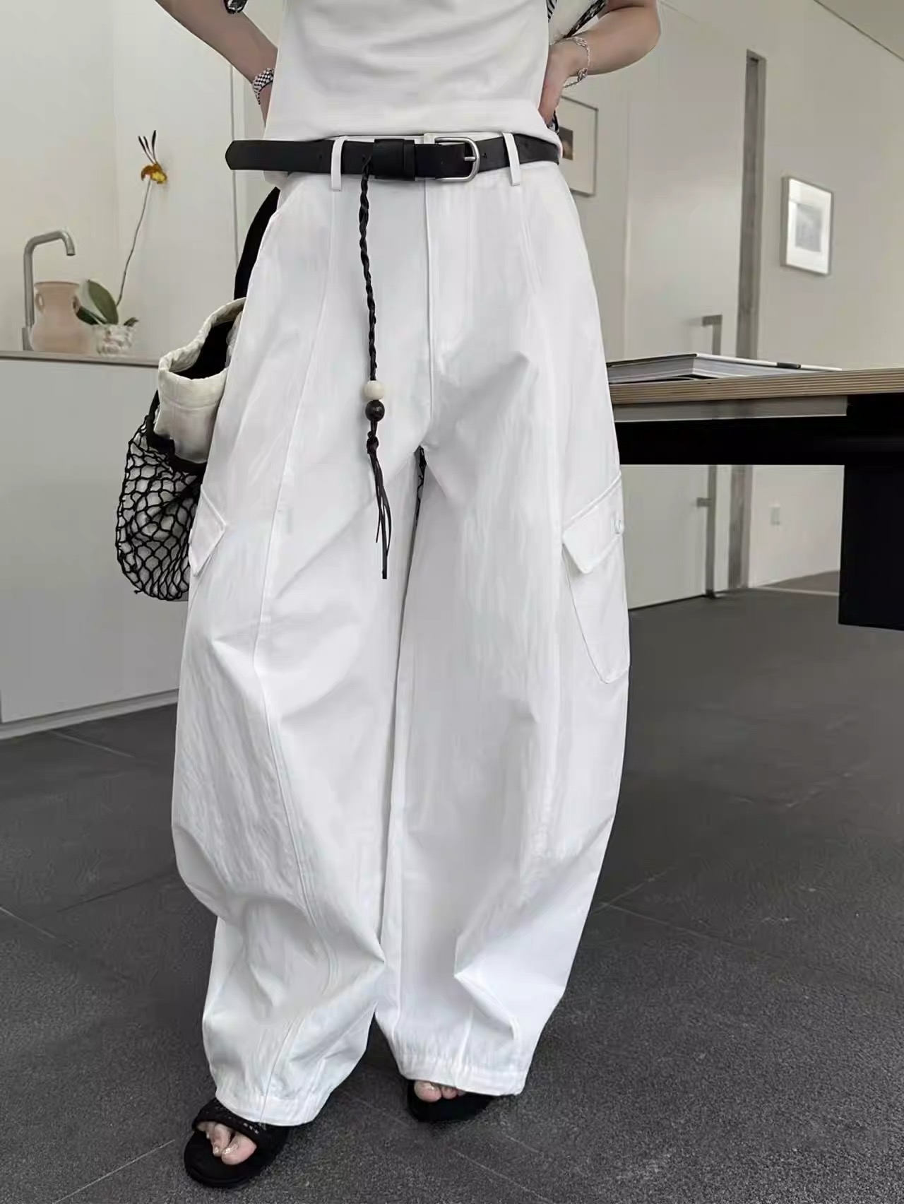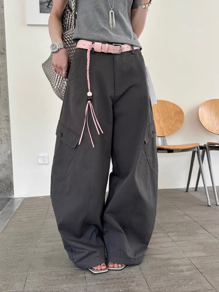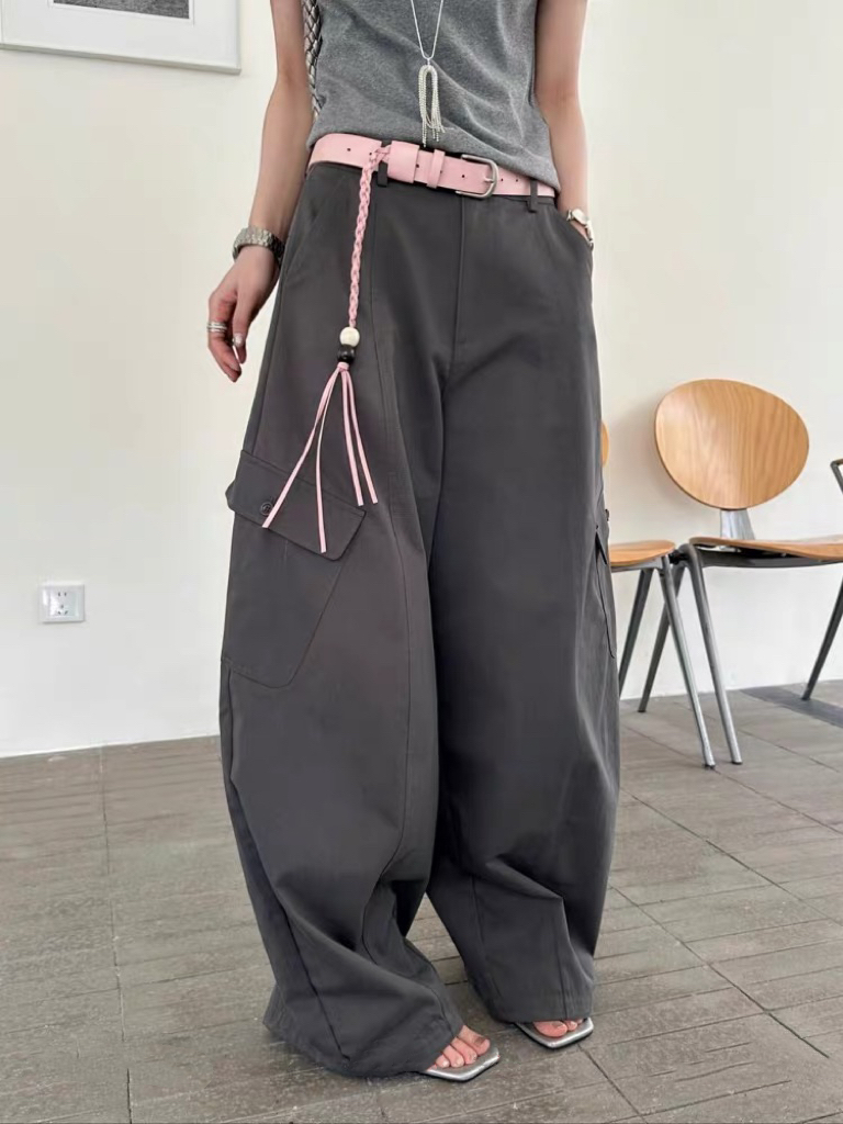 새로운 허리 머리 패치워크 허리 로프 디자인 풍선 바지 다용도 슬림해 보이는 캐주얼 바지 경기 허리 로프