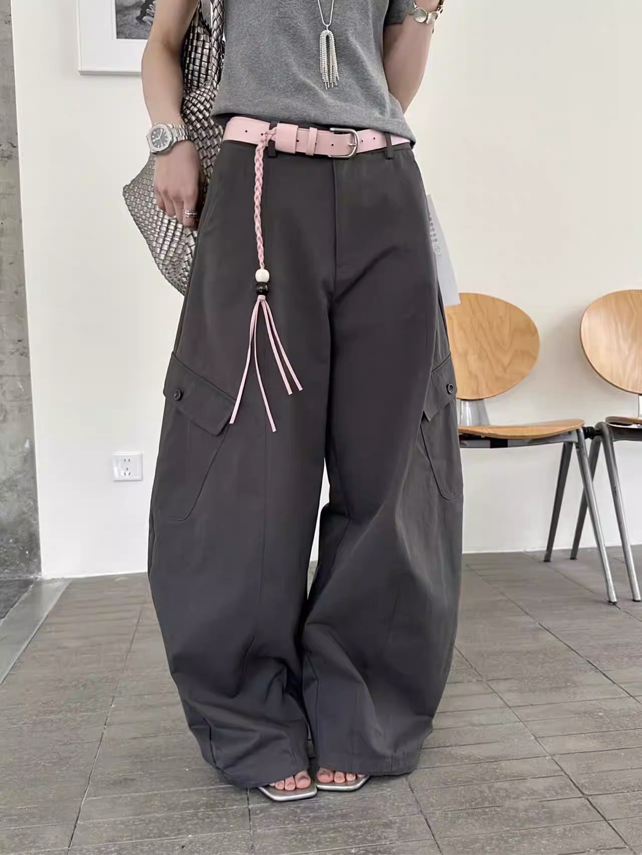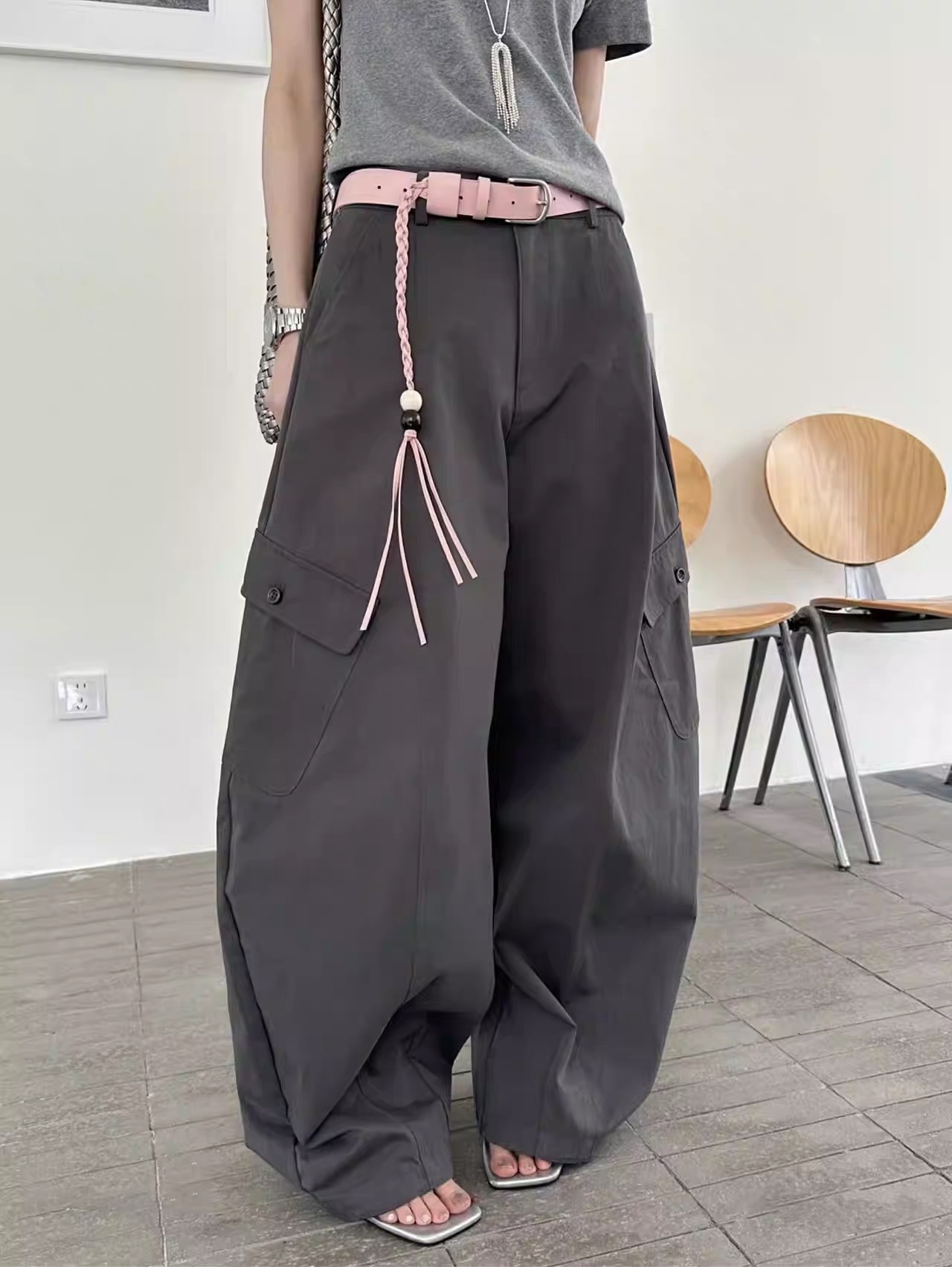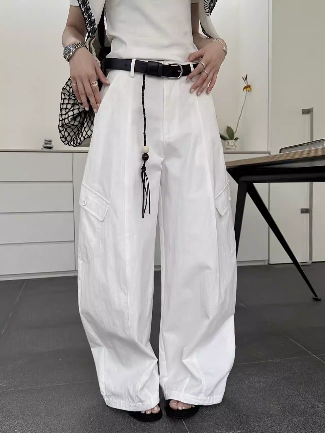 새로운 허리 머리 패치워크 허리 로프 디자인 풍선 바지 다용도 슬림해 보이는 캐주얼 바지 경기 허리 로프