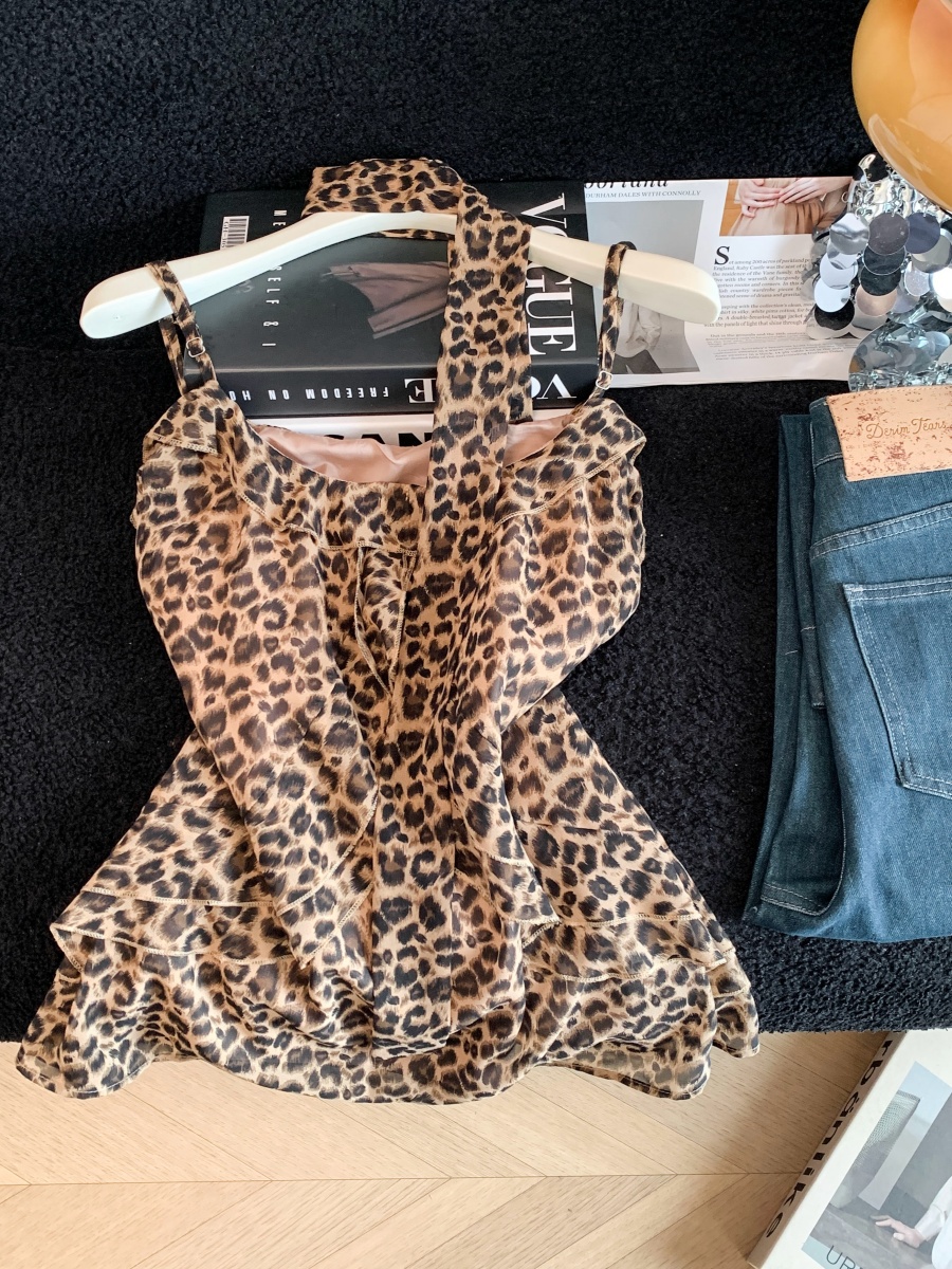 부드러운 바람 프릴 레오파드 무늬 캐미솔 봄 2026 불규칙 리본 루즈핏 연령 감소 치마 맨위