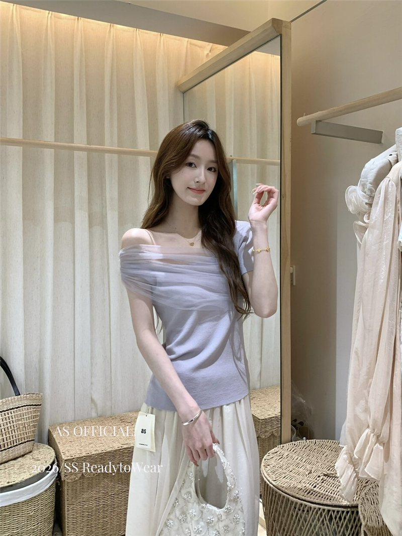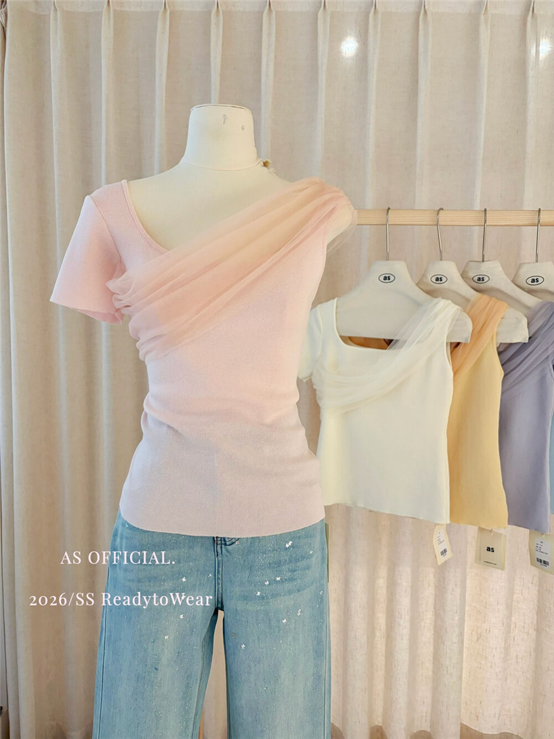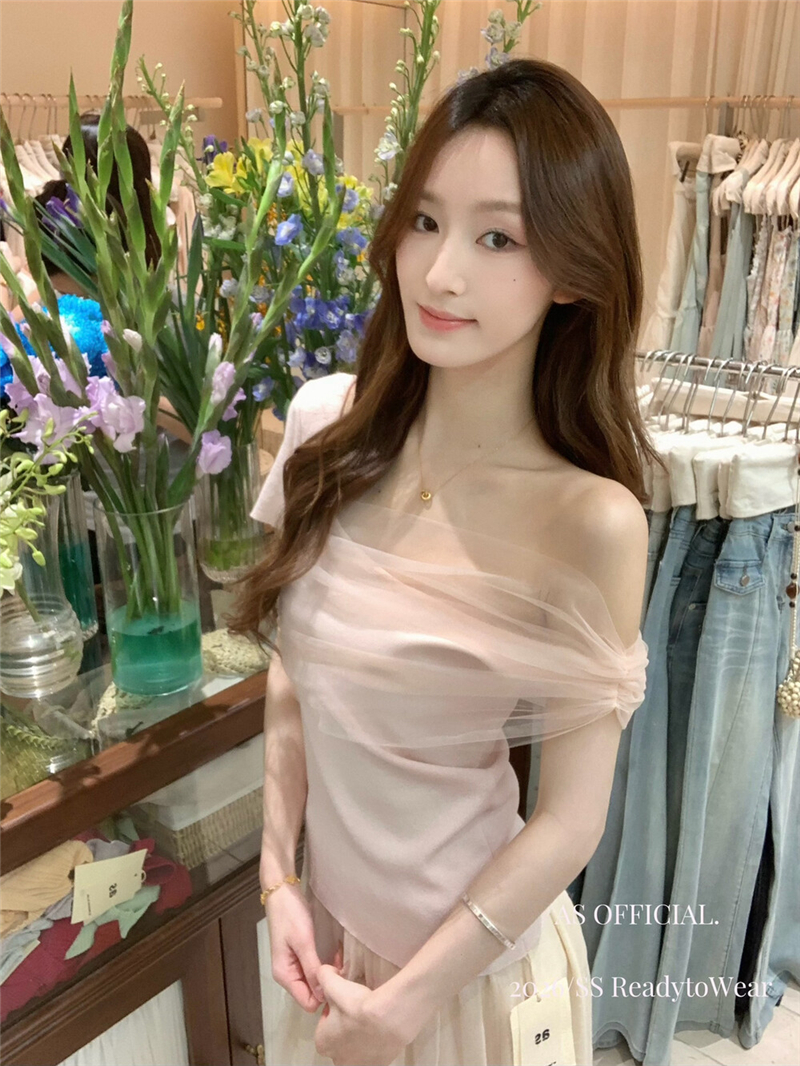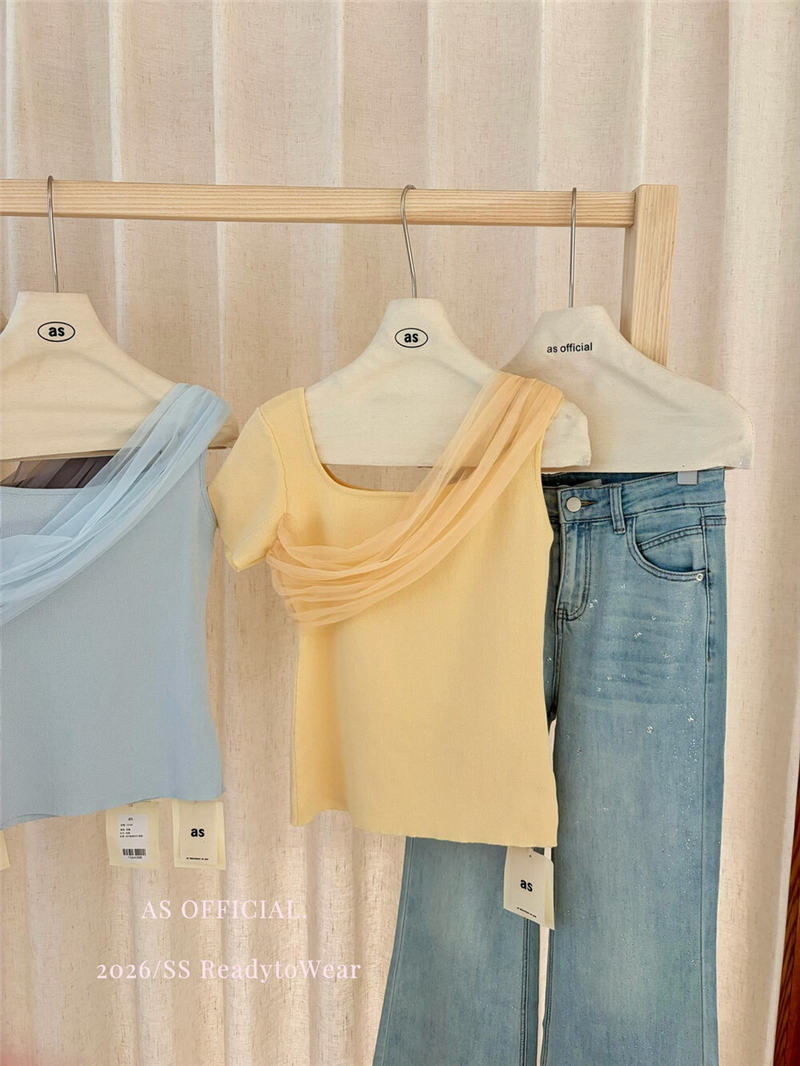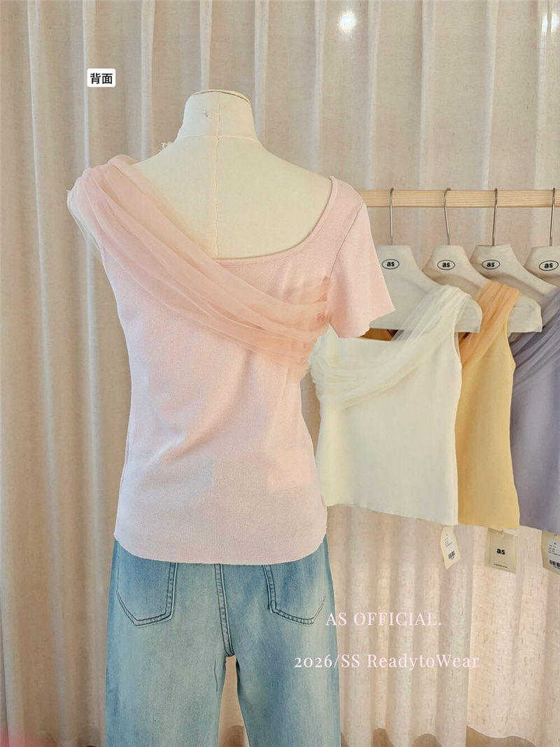부드럽다 프로 피부 레몬 녹차 비스듬한 어깨 리본 디자인 센스 슬림해 보이는 반팔 티셔츠 리본 아니요 철거