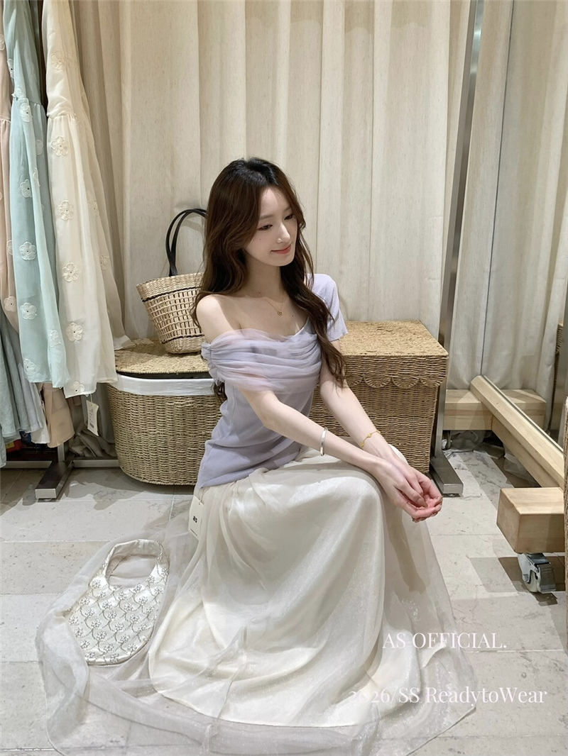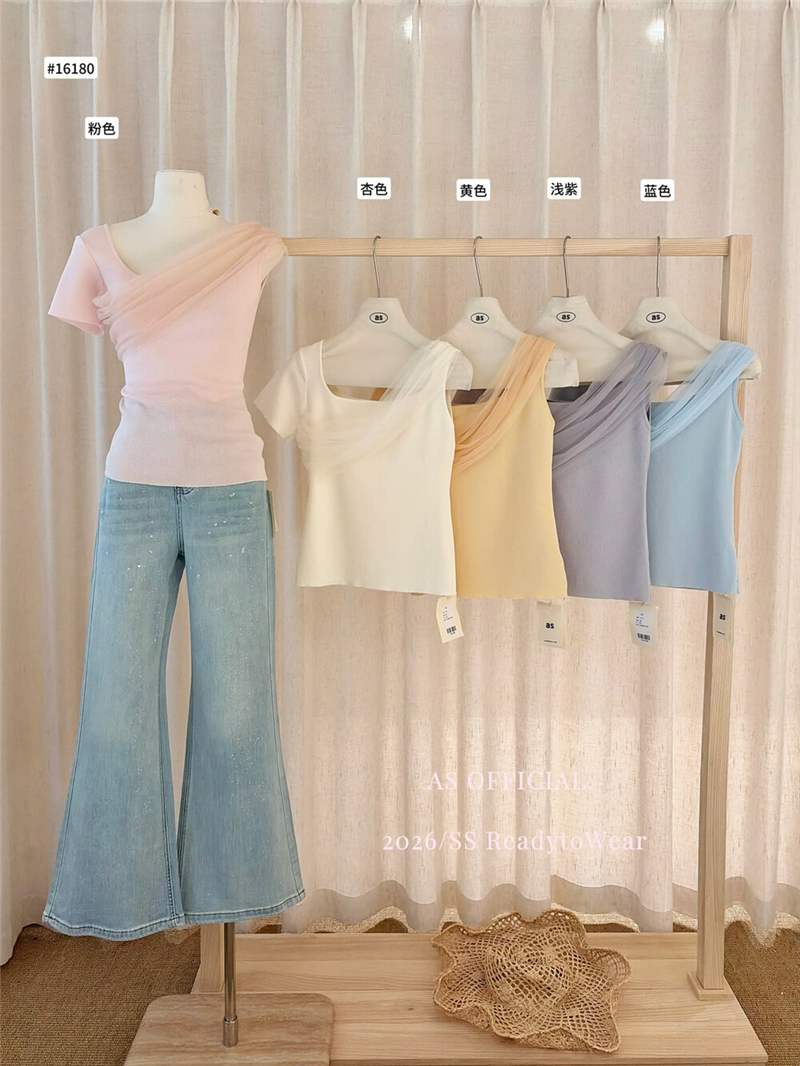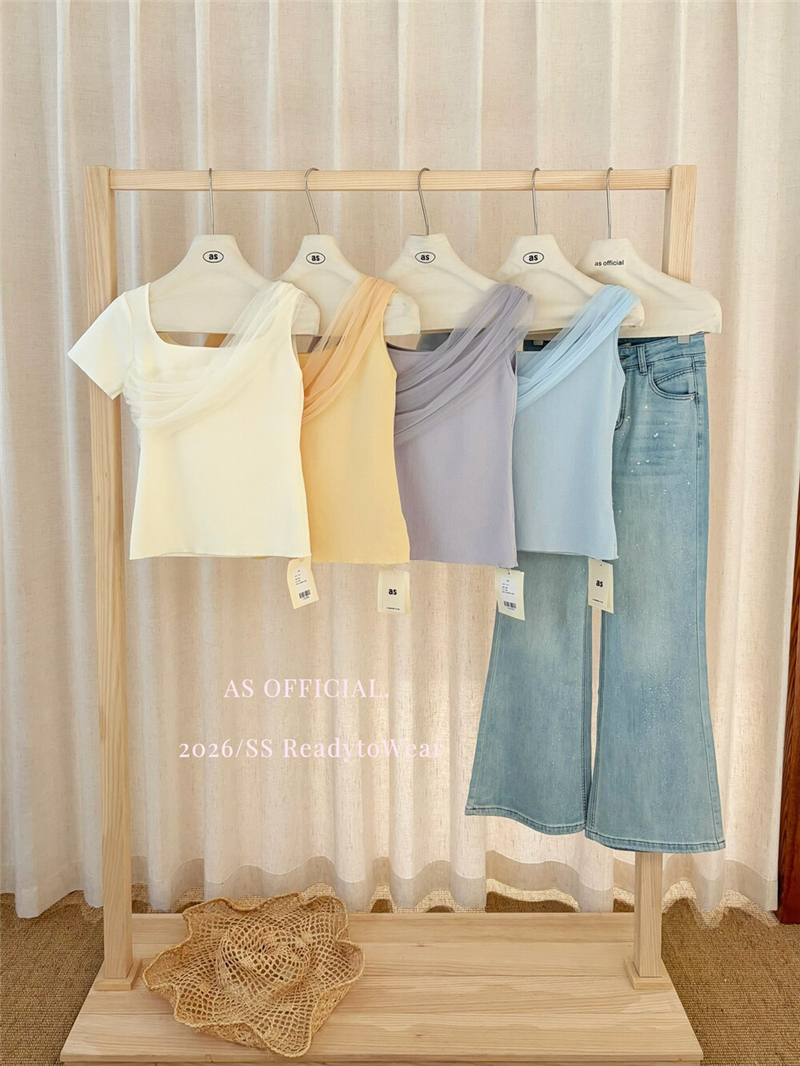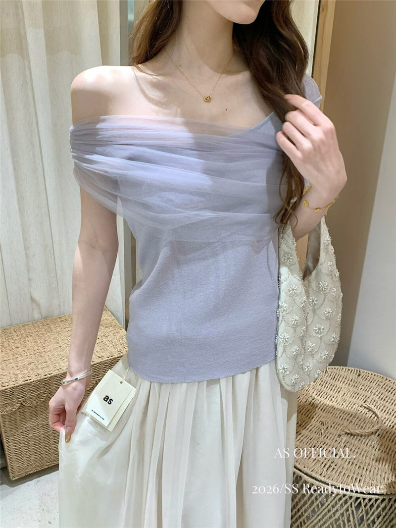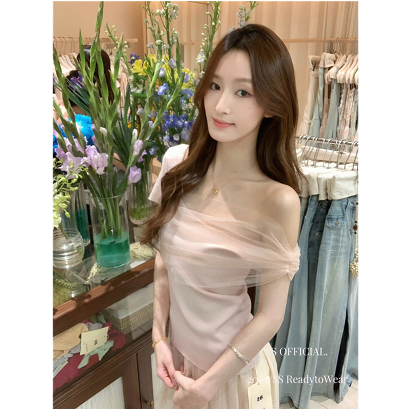 부드럽다 프로 피부 레몬 녹차 비스듬한 어깨 리본 디자인 센스 슬림해 보이는 반팔 티셔츠 리본 아니요 철거