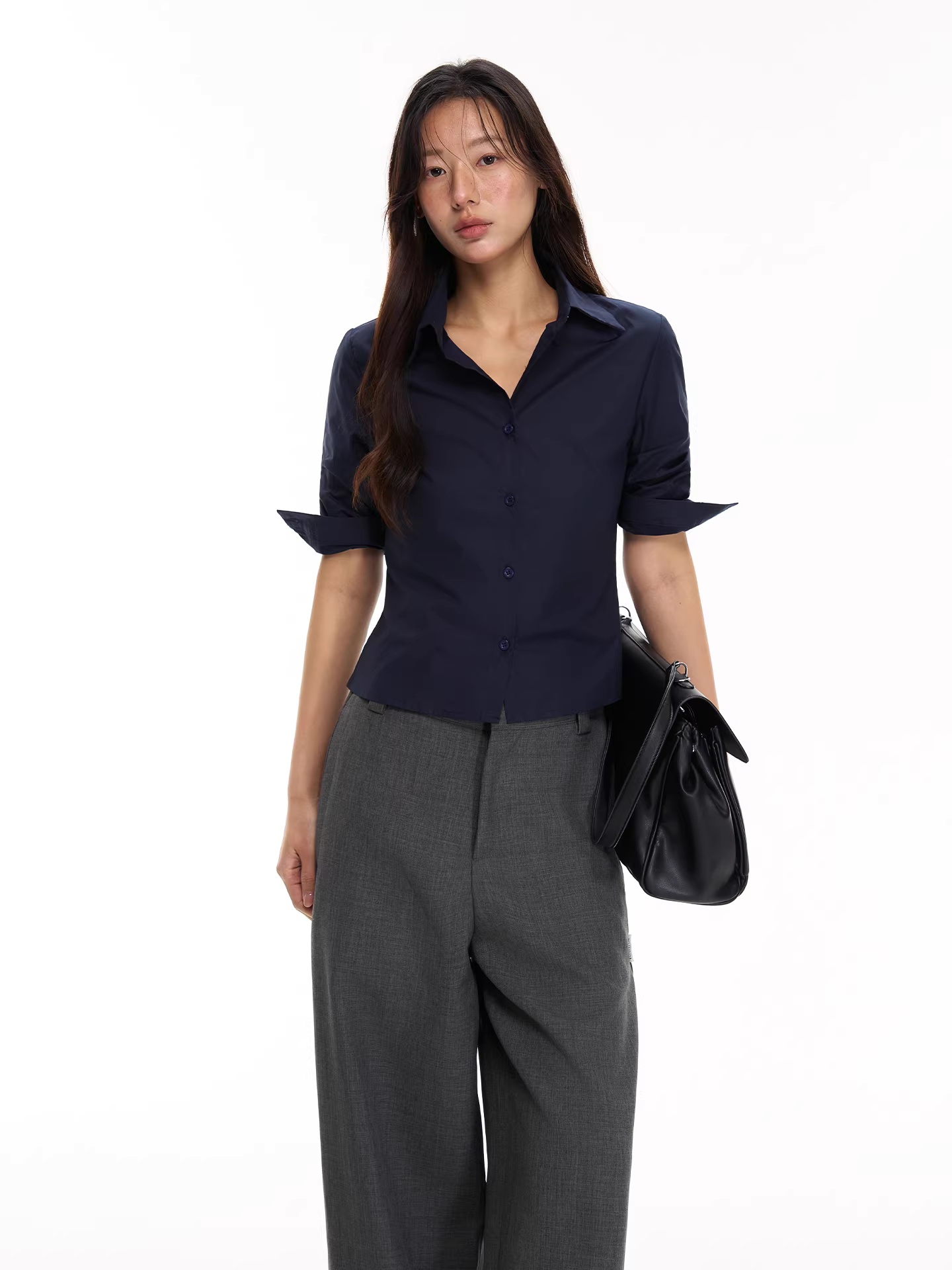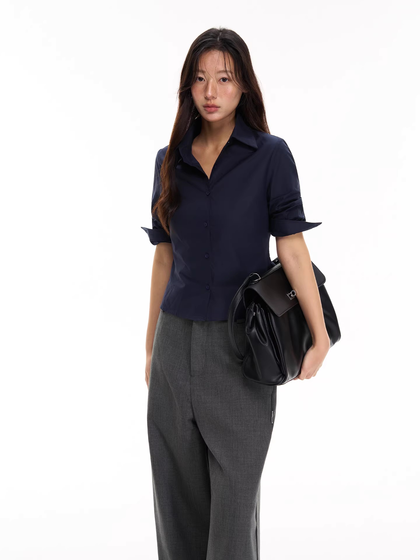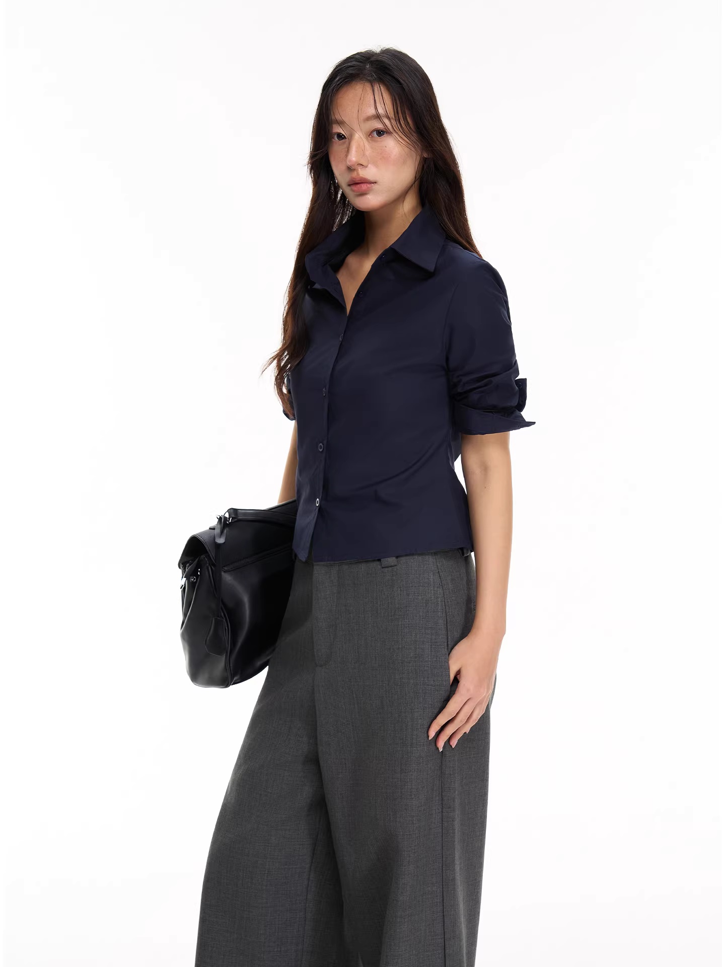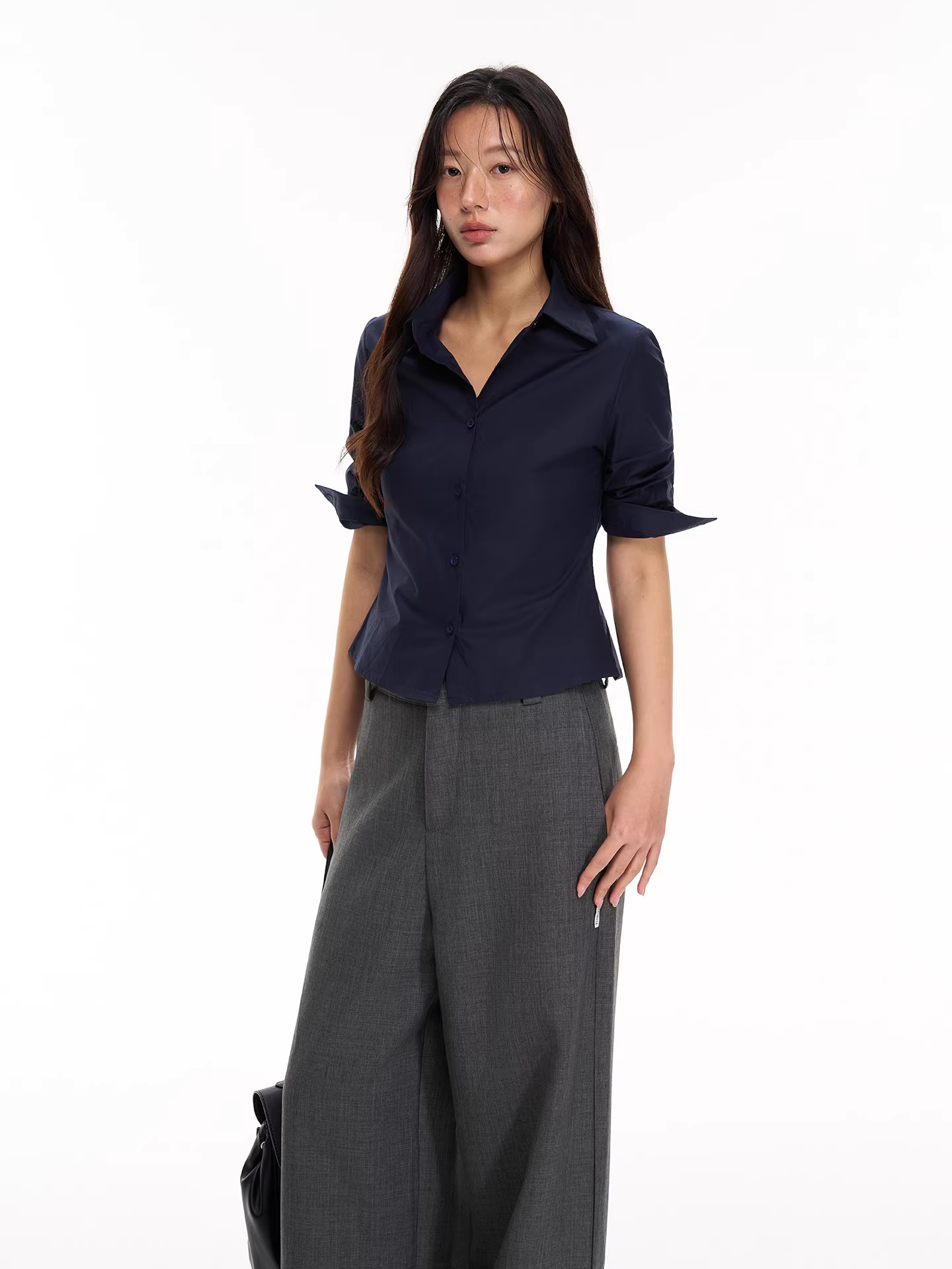 soote season 오리지널 한 부서 꼬집기 허리 중간 소매 신축성 뒤집다 소매 몸매 가꾸기 슬림해 보이는 주머니 셔츠 맨위 여성