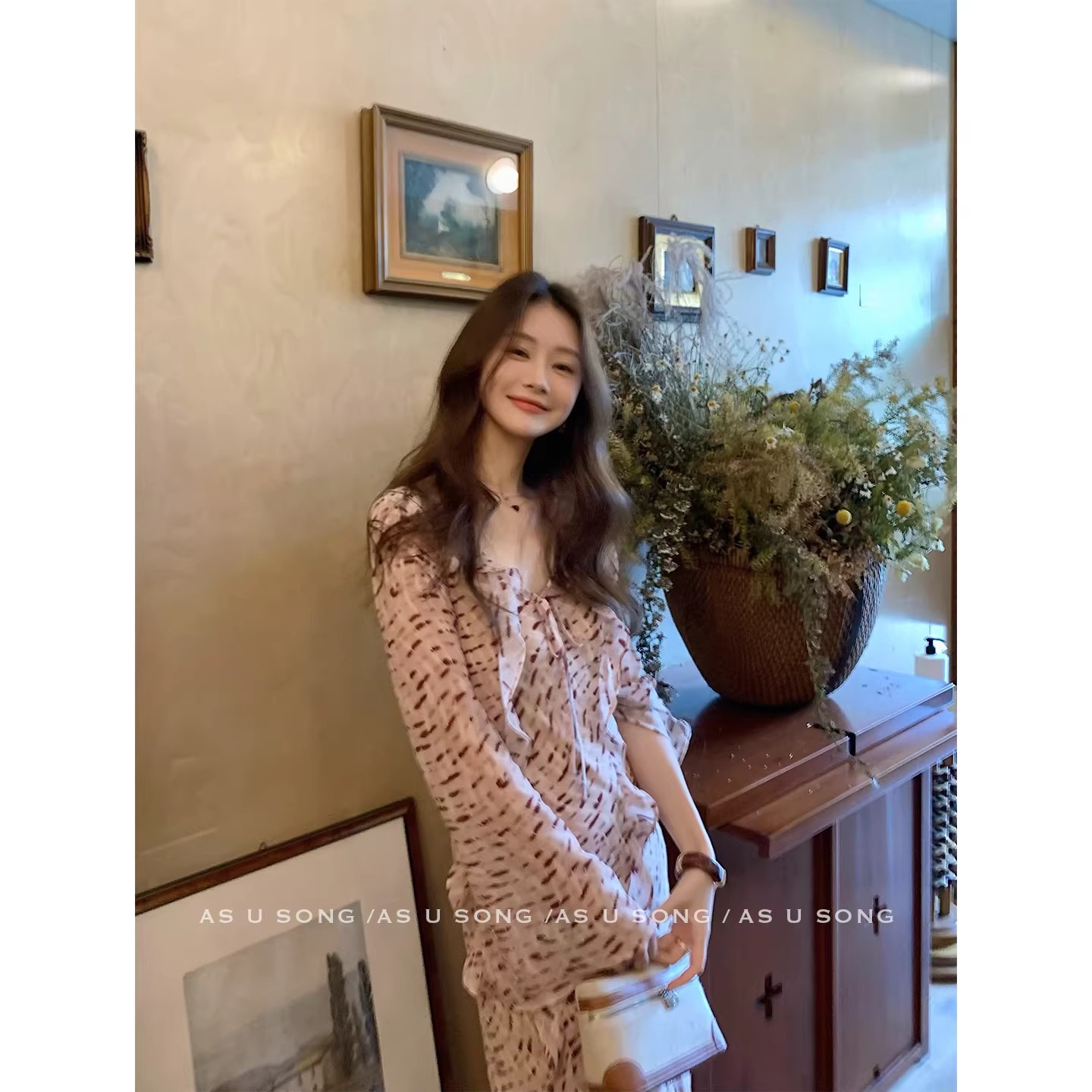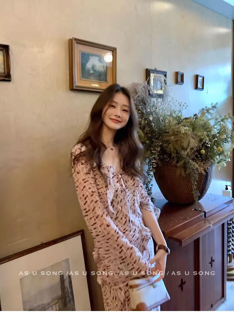 다우 시시 주간 맑은 하늘 분말 꽃잎 원 웨이 비스듬한 襟 레이스 조각 새로운 중식 맨위 여름 출퇴근 패션 세트