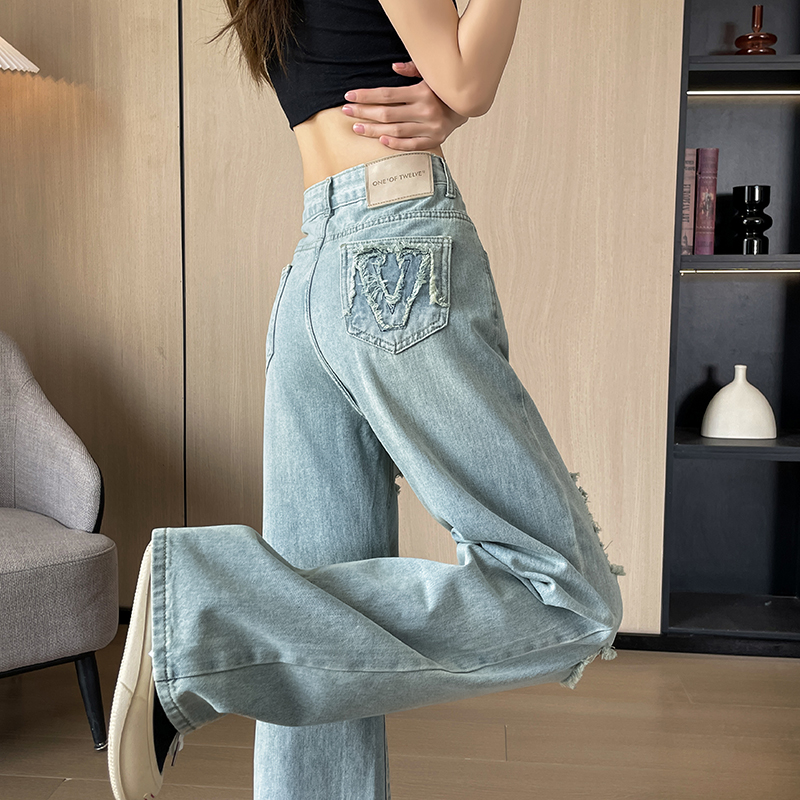 실사 레이스 넓은 다리 청바지 여성 여름 얇은 스타일 하이웨이스트 슬림해 보이는 루즈핏 캐주얼 8 점 작은 키 스트레이트 팬츠
