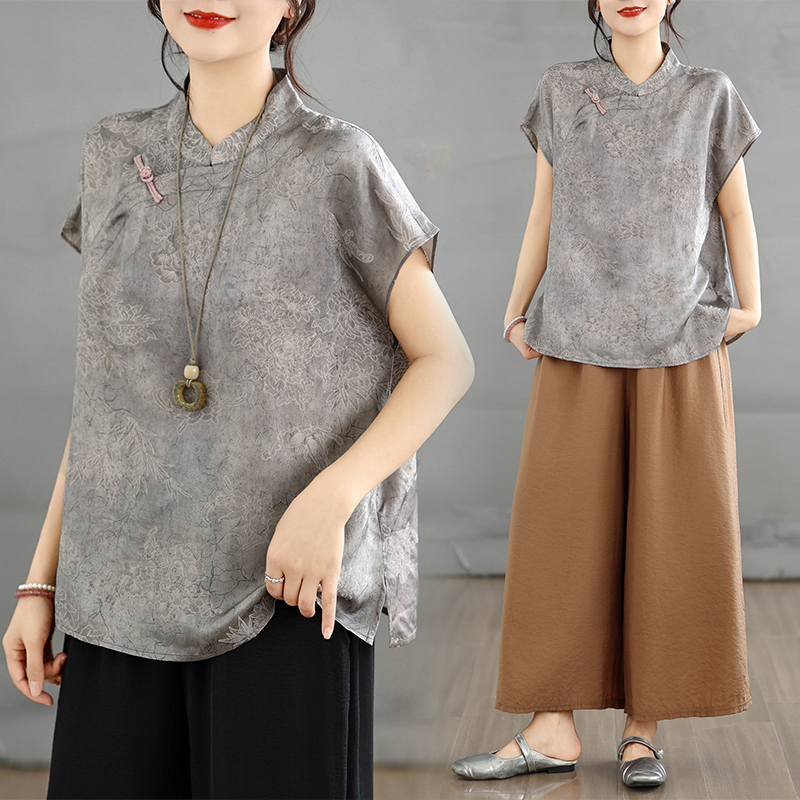 자카드 새틴 비스듬한 襟 단추 Feifei 소매 스탠드 칼라 작은 셔츠 맨위 여성 빅 사이즈