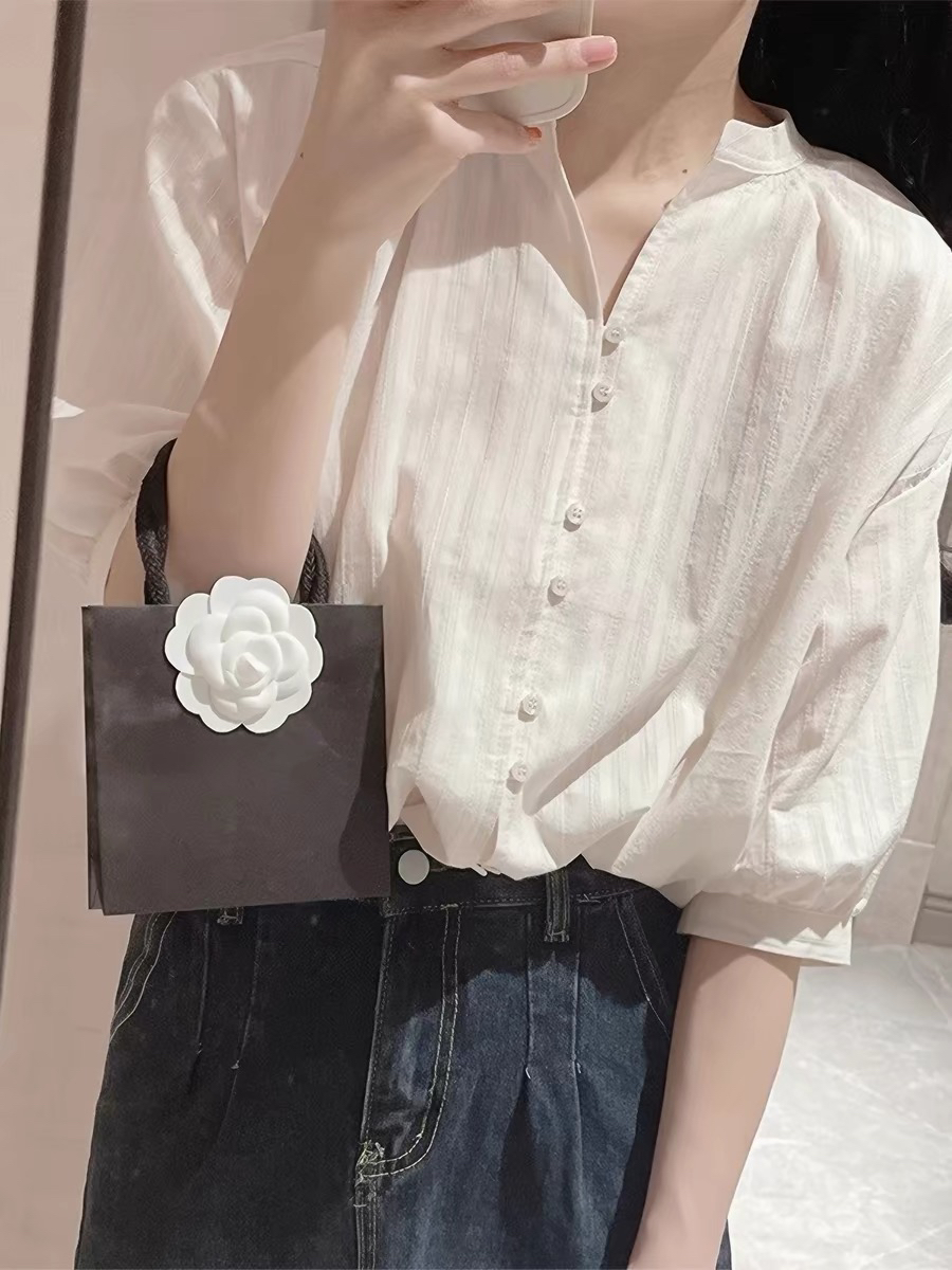 프랑스식 화이트 면 린넨 여성 셔츠 여름 얇은 스타일 아마 거품 소매 셔츠 품격 중간 소매 5 점 소매 맨위