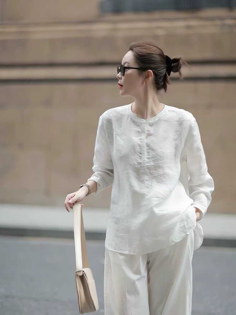여름 상쾌 통기성 착용 가져 가라. 흰 셔츠 주간 실크 라미 긴팔 여성 셔츠 자외선 차단 품격 루즈핏 블라우스 맨위