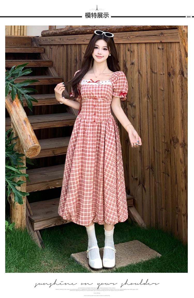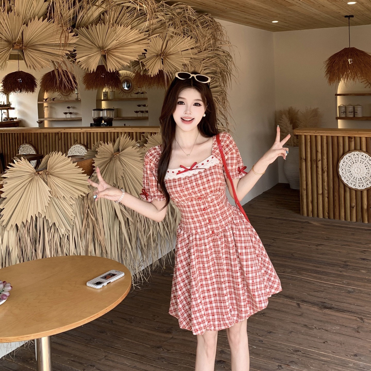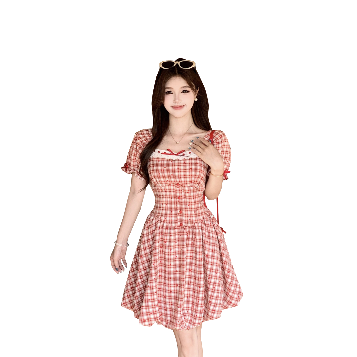실사 빅 사이즈 여성 의류 마이크로 지방 mm 슬림해 보이는 체크무늬 인형 치마 프랑스식 레트로 스타일 꽃밭 디자인 레이스업 드레스