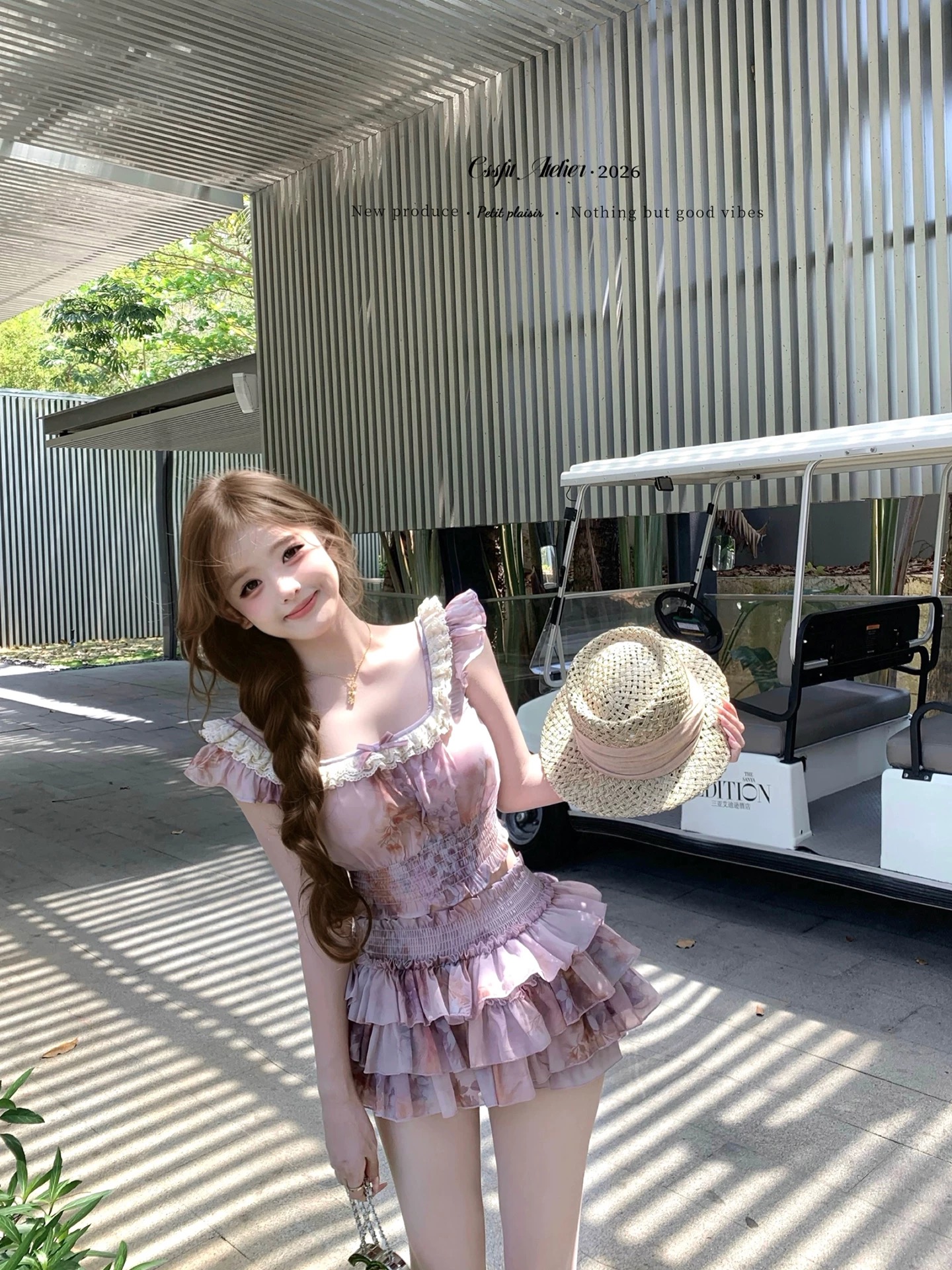 acaine 마이크로 팬 스택 보라색 그라데이션 레이스 행침 목 맨위 반 스커트