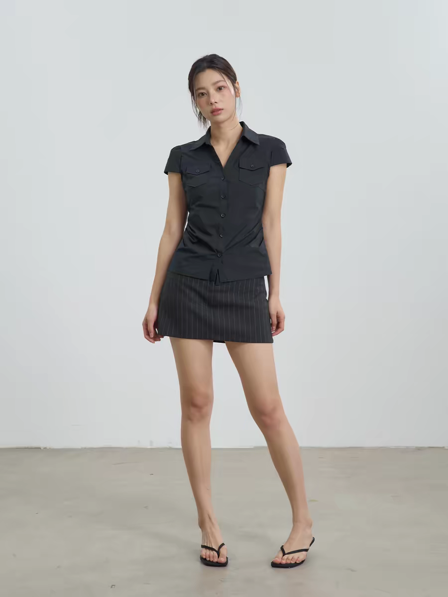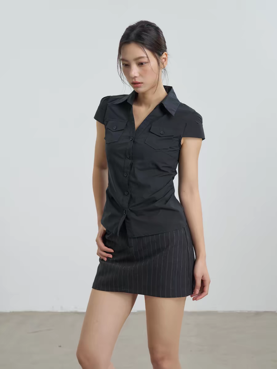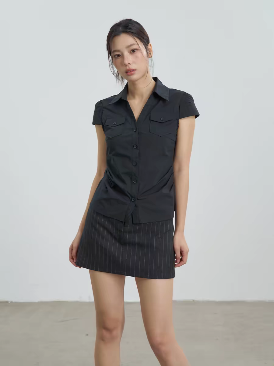 검정색 모직물 반팔 티셔츠 하트 자물쇠 자수 디자인 봄 여름 새로운 헨리 칼라 허리 수축 맨위 여성