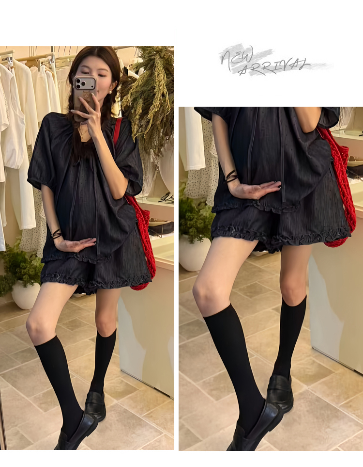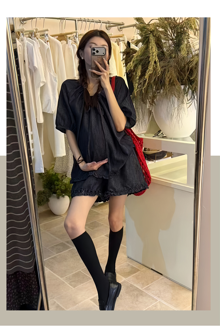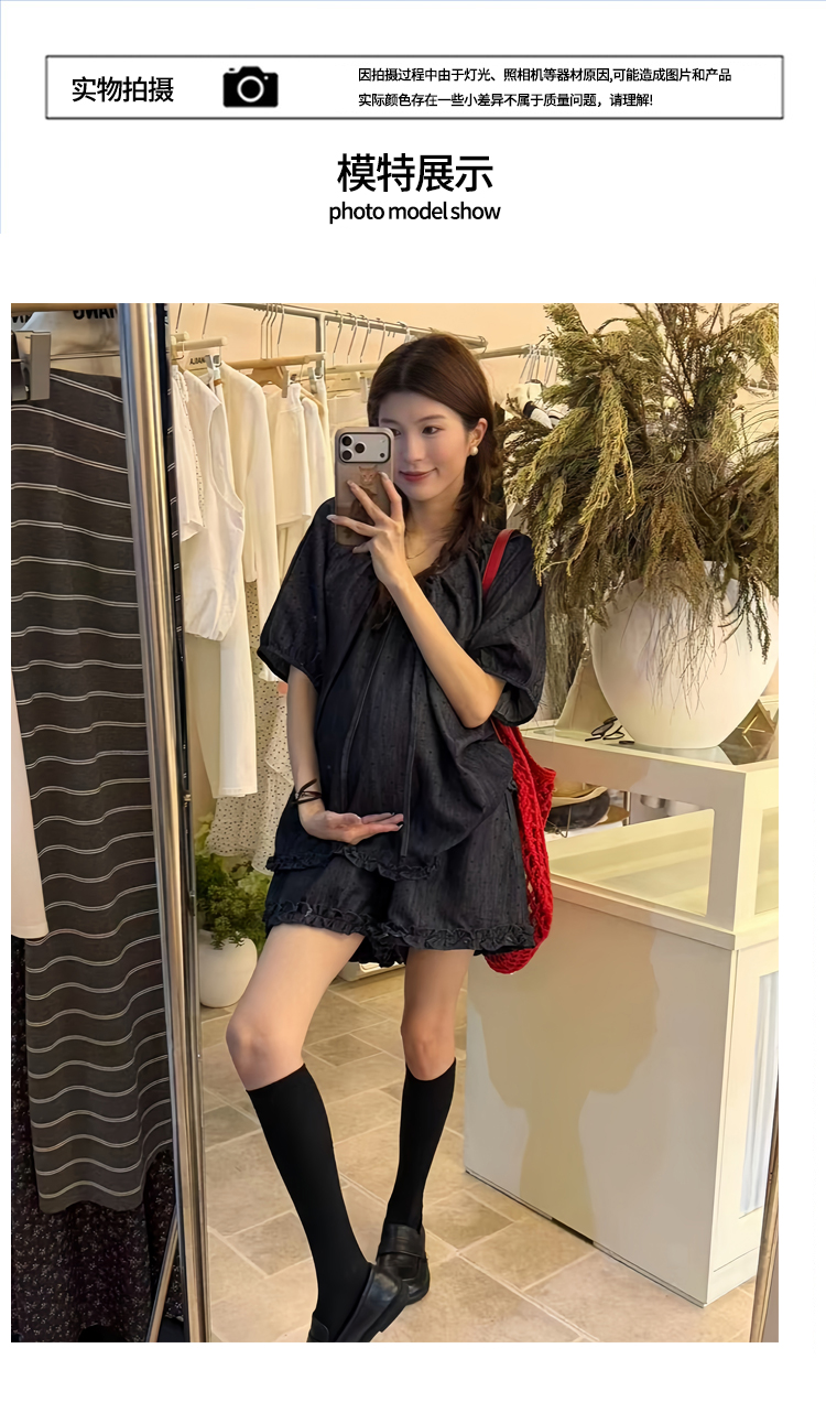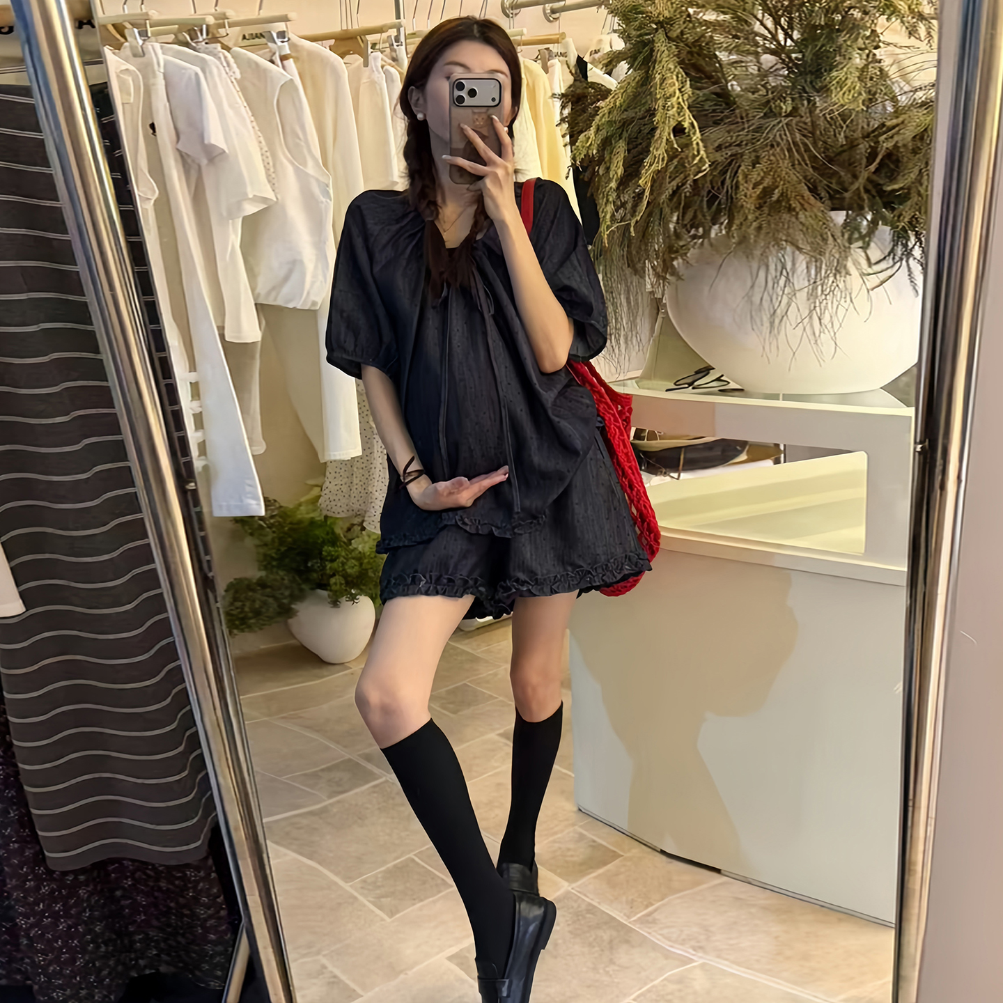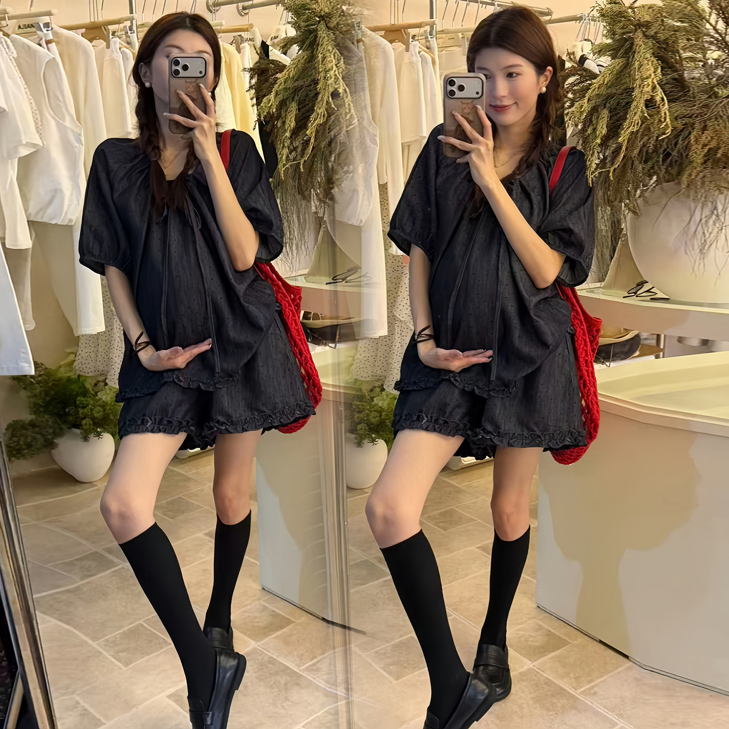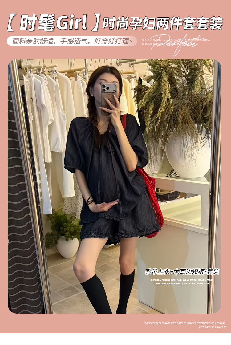 인터넷 유명인 섹션 출산 착용 반바지 세트 2026 여름 새로운 도트 무늬 루즈핏 슬림해 보이는 임신 기간 착용 가져 가라. 투피스 세트