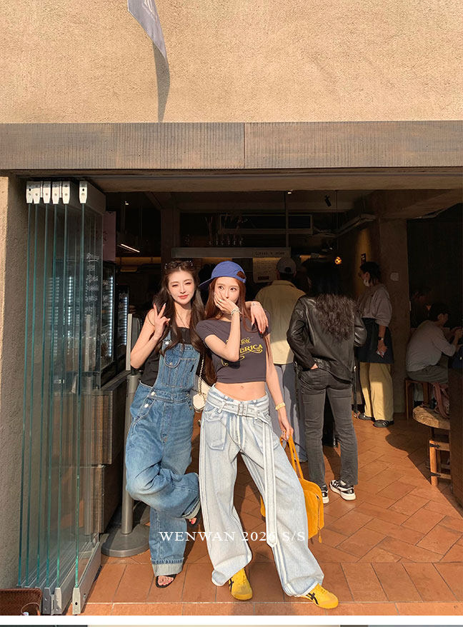 청춘 멜빵 바지 중 로우 웨이스트 넓은 다리 워크웨어 청바지 여성 봄 긴 바지