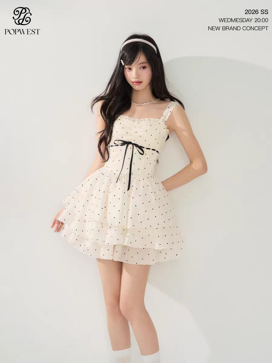 한 부서 디자인 센스 화이트 도트 무늬 드레스 여름 새로운 주름 디자인 센스 학원 스타일 소녀 치마