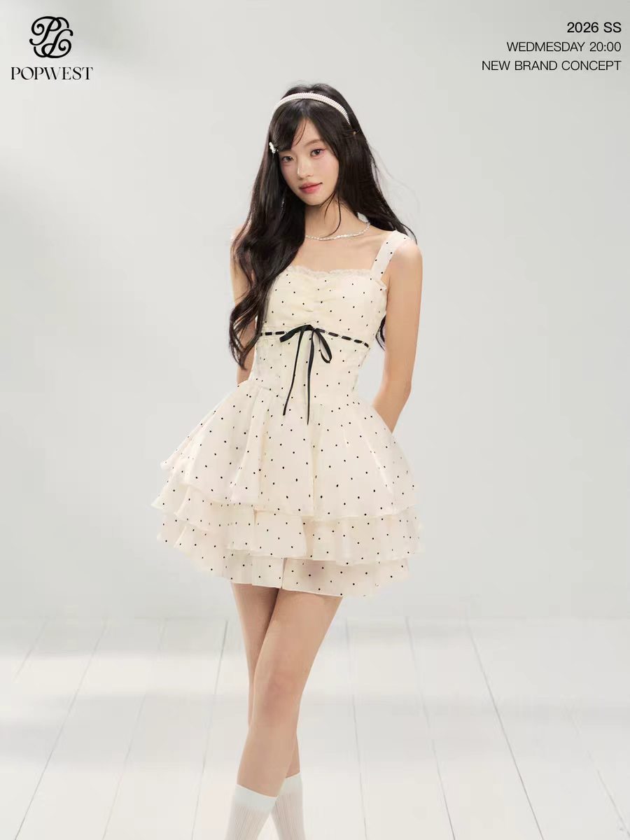오리지널 천 골드 달콤한 스타일 도트 무늬 민소매 드레스 생일 치마 생선뼈 퍼프 미니 스커트