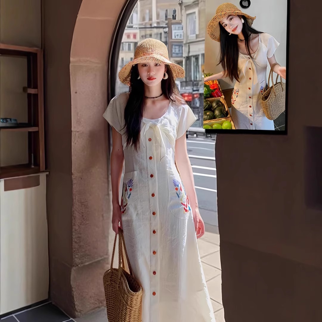 프랑스식 레트로 화이트 여성 드레스 여름 빅 사이즈 품격 고유 한 아름다운 여행 휴가 중간 길이 치마