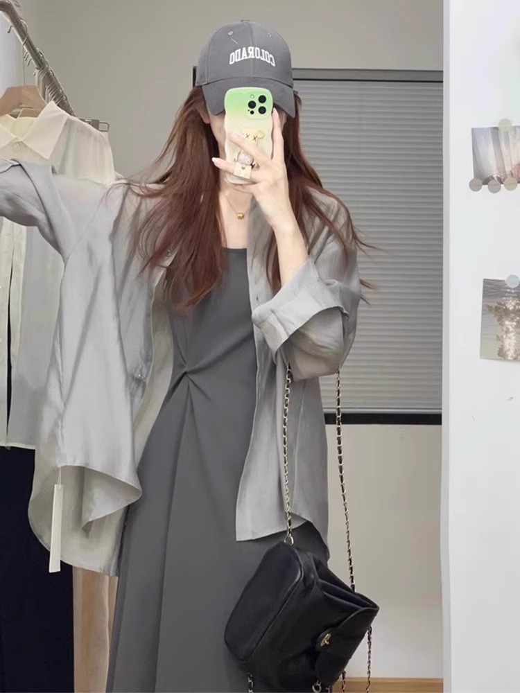 프랑스식 회색 주간 실크 자외선 차단 오픈 가디건 셔츠 여성 여름 얇은 스타일 긴팔 셔츠 외부 가져 가라. 쇼트 스타일 작은 숄 맨위