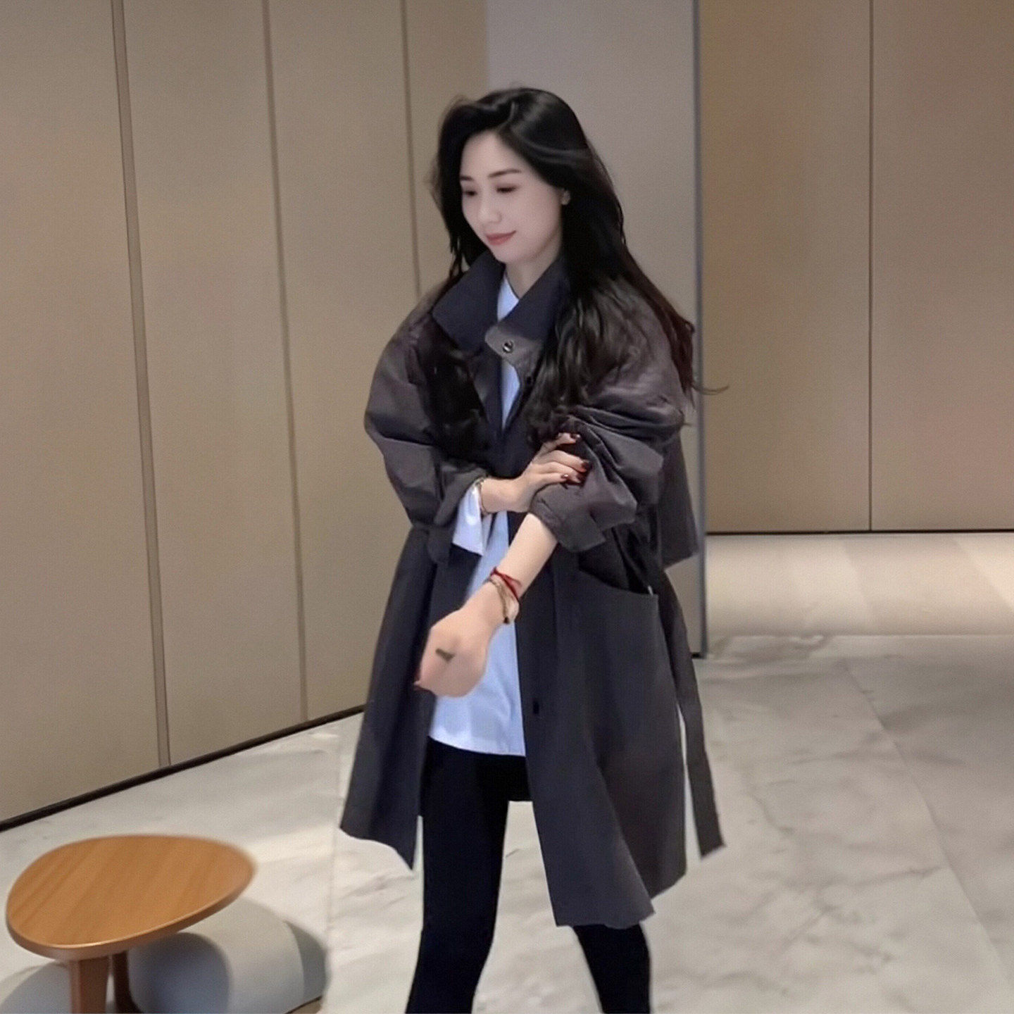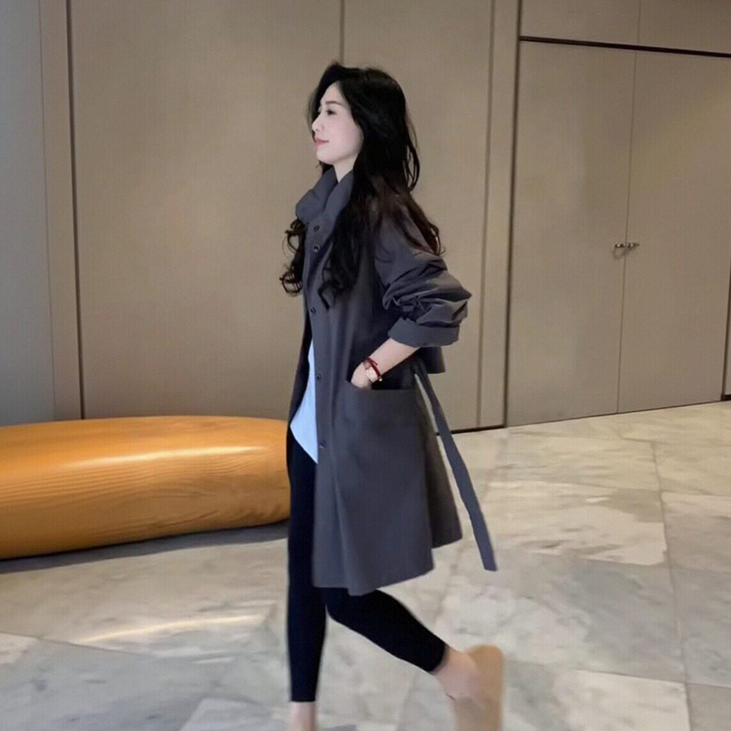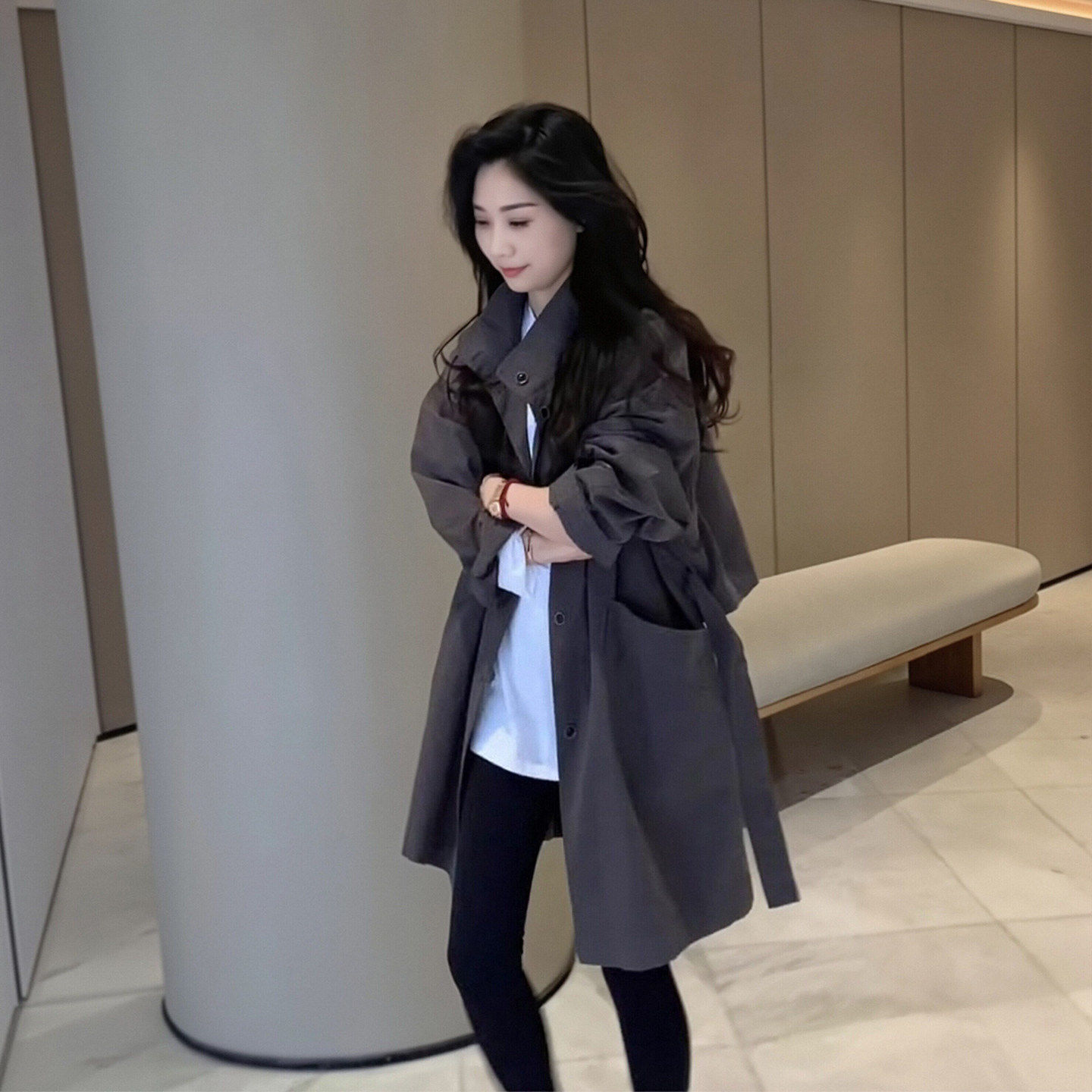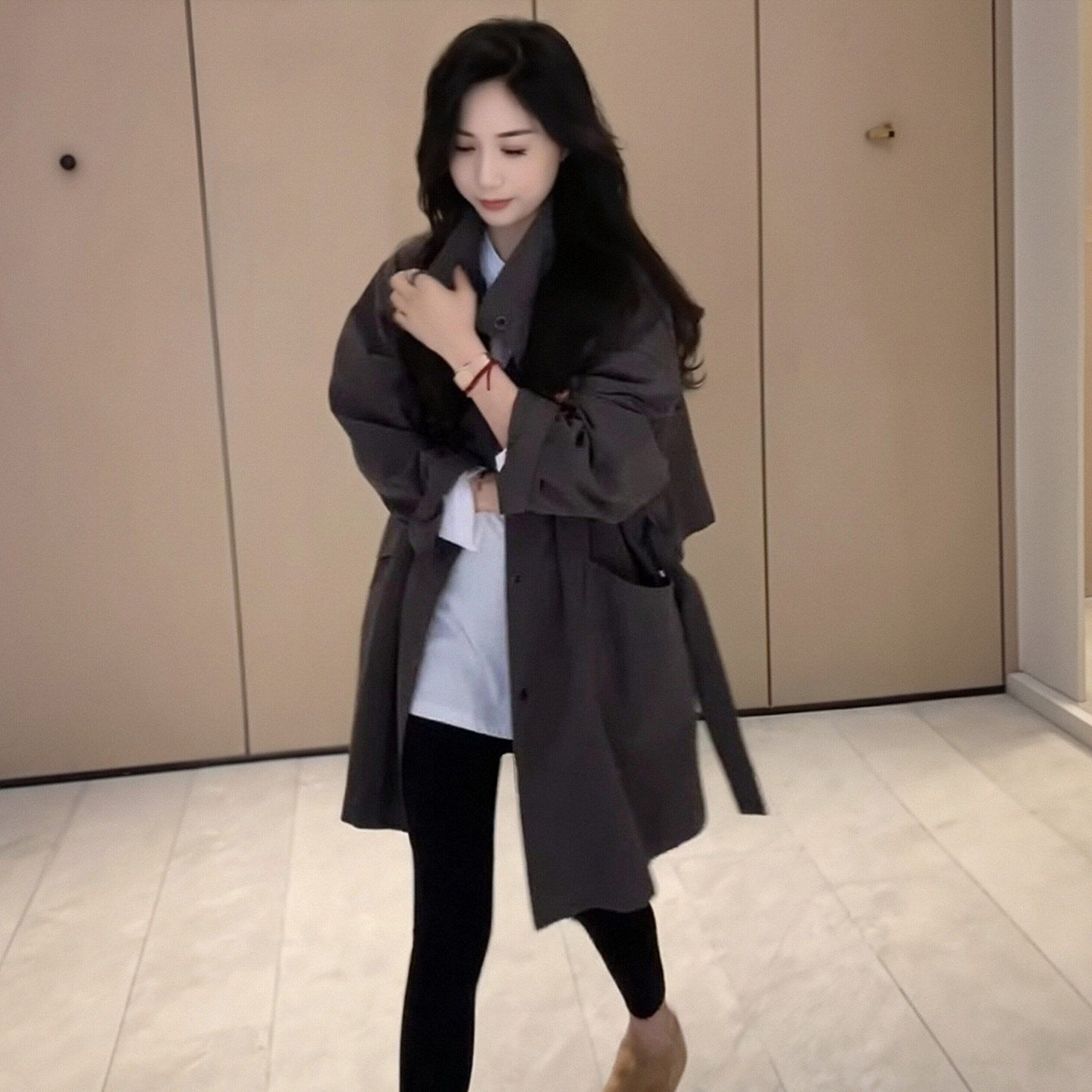 카키 색 중간 길이 후드 바람막이 여성 코트 봄 드레스 빅 사이즈 지방 mm 고급 루즈핏 다용도 영국식 바람 코트