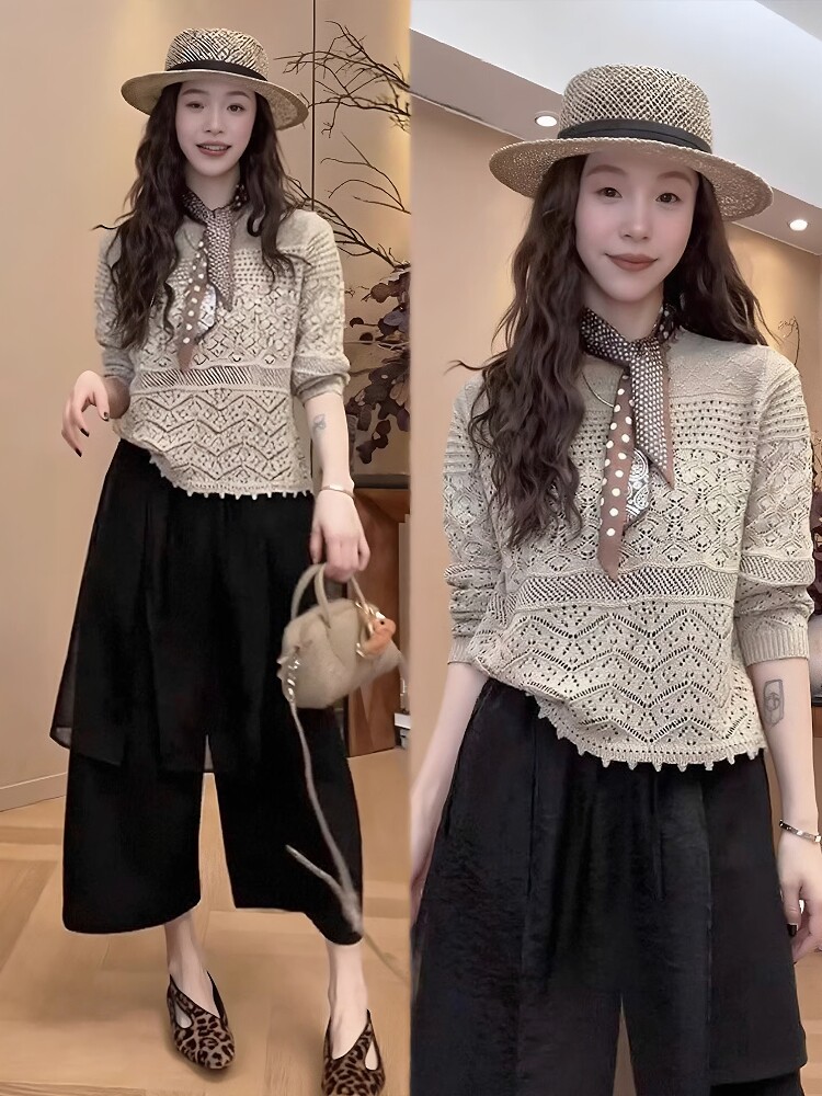 봄 여름 착용 가져 가라. 전체 집합 빅 사이즈 한 부서 새로운 홀로우 아웃 라운드 넥 니트 맨위 방귀 커튼 와이드 레그 팬츠 품격 세트
