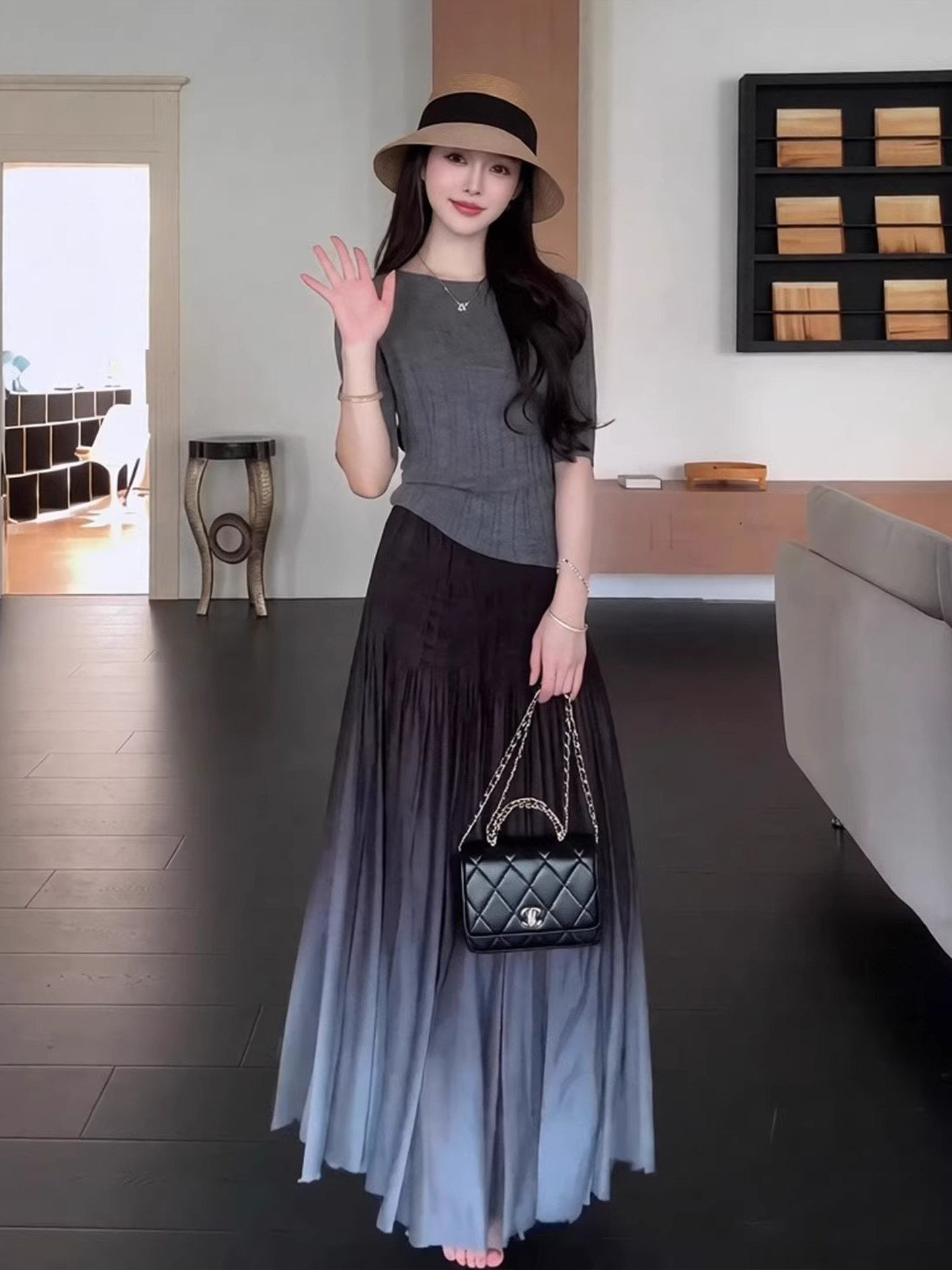 여름 코디 전체 집합 빅 사이즈 지방 mm 중간 소매 니트 스웨터 맨위 망사 반신 스커트 느긋한 레트로 세트 여성