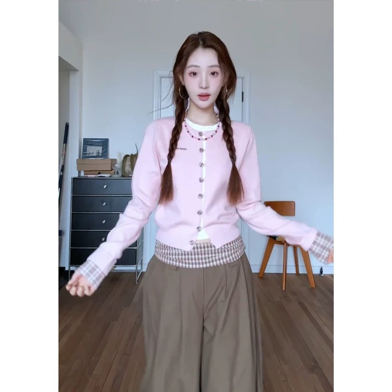 순수한 욕망 화이트 V넥 얇은 스타일 링 그리드 홀로우 아웃 니트 오픈 가디건 이른 봄 슬림해 보이는 쇼트 스타일 싱글 줄 버튼 몸매 가꾸기 맨위 여성